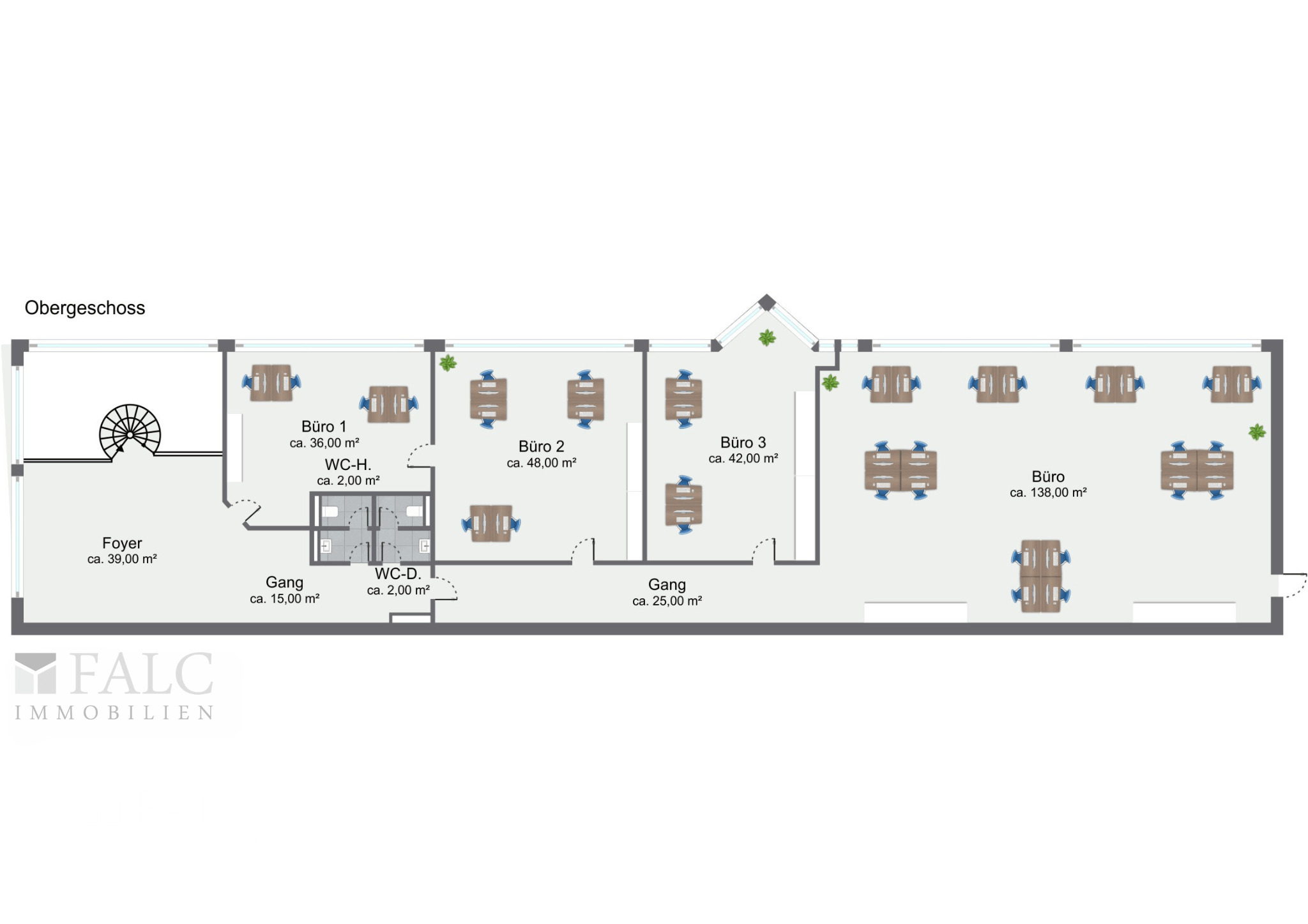 Im Erd- und Obergeschoss befinden sich repräsentative Empfangsbereiche, die durch ihre großflächigen, bodentiefen Fenster eine helle und freundliche Atmosphäre schaffen. Insgesamt stehen sechs eigenständige Büroräume, darunter zwei Großraumbüros, zur Verfügung. Die funktionale Raumaufteilung ermöglicht eine individuelle Anpassung an Ihre Anforderungen.