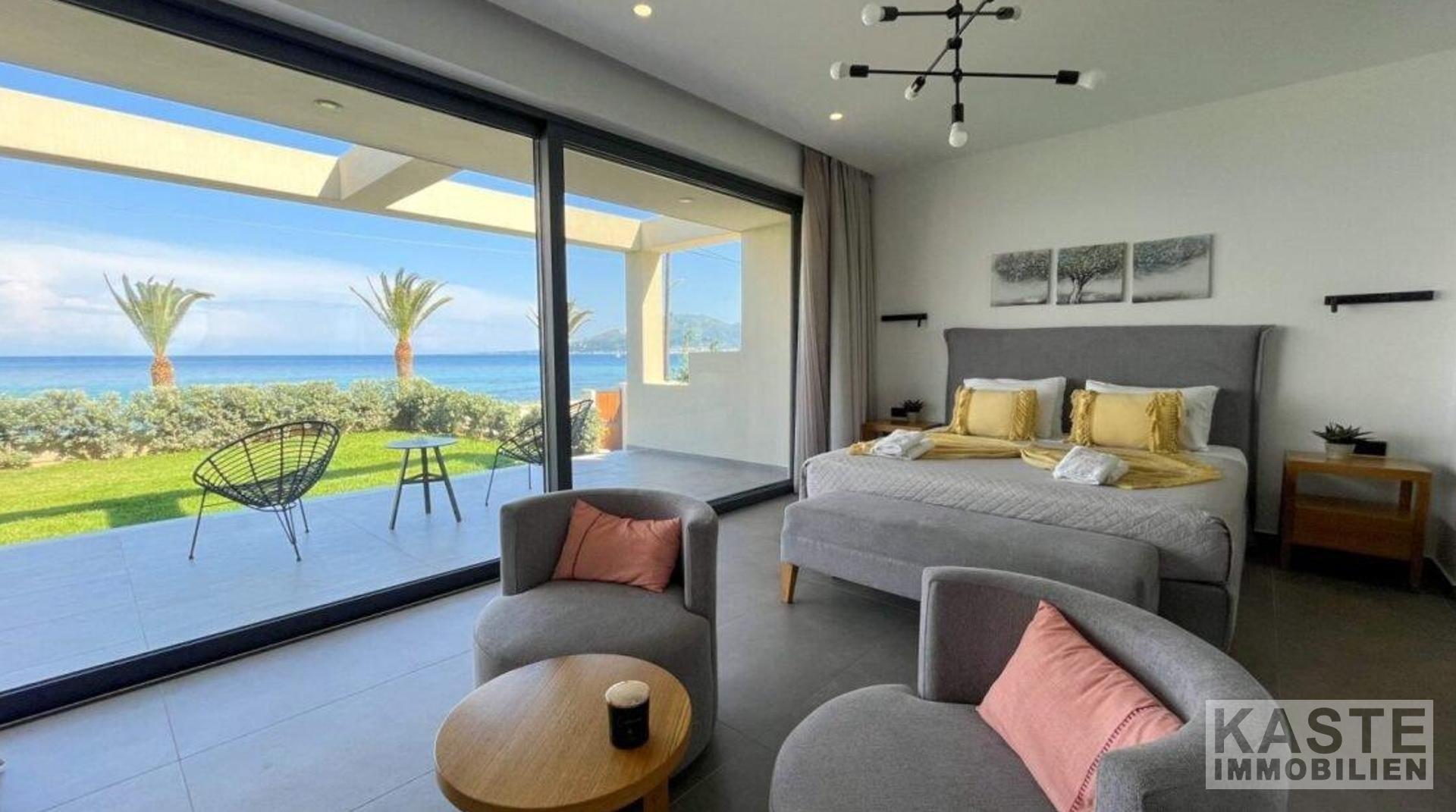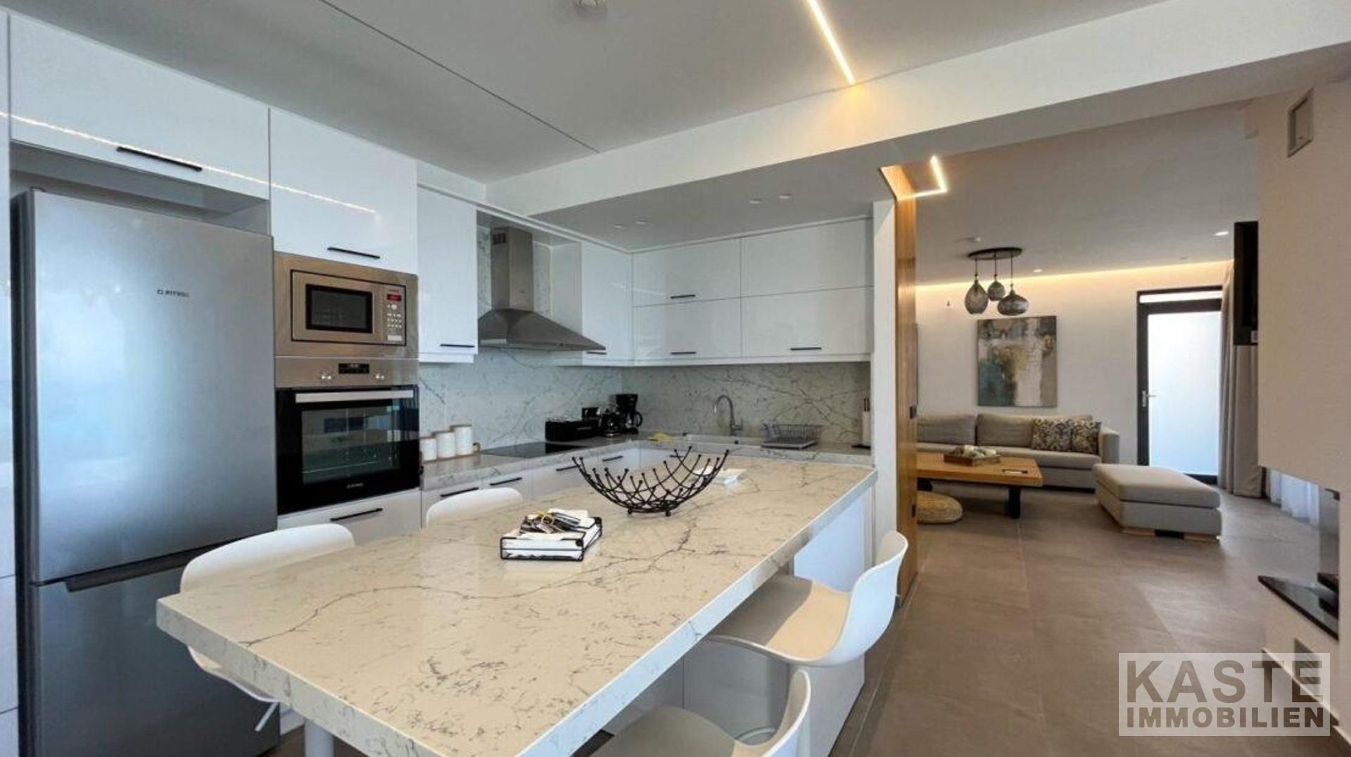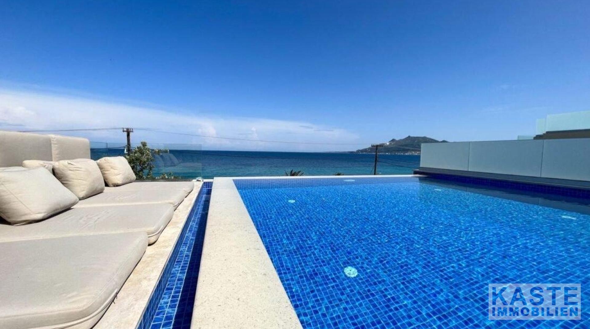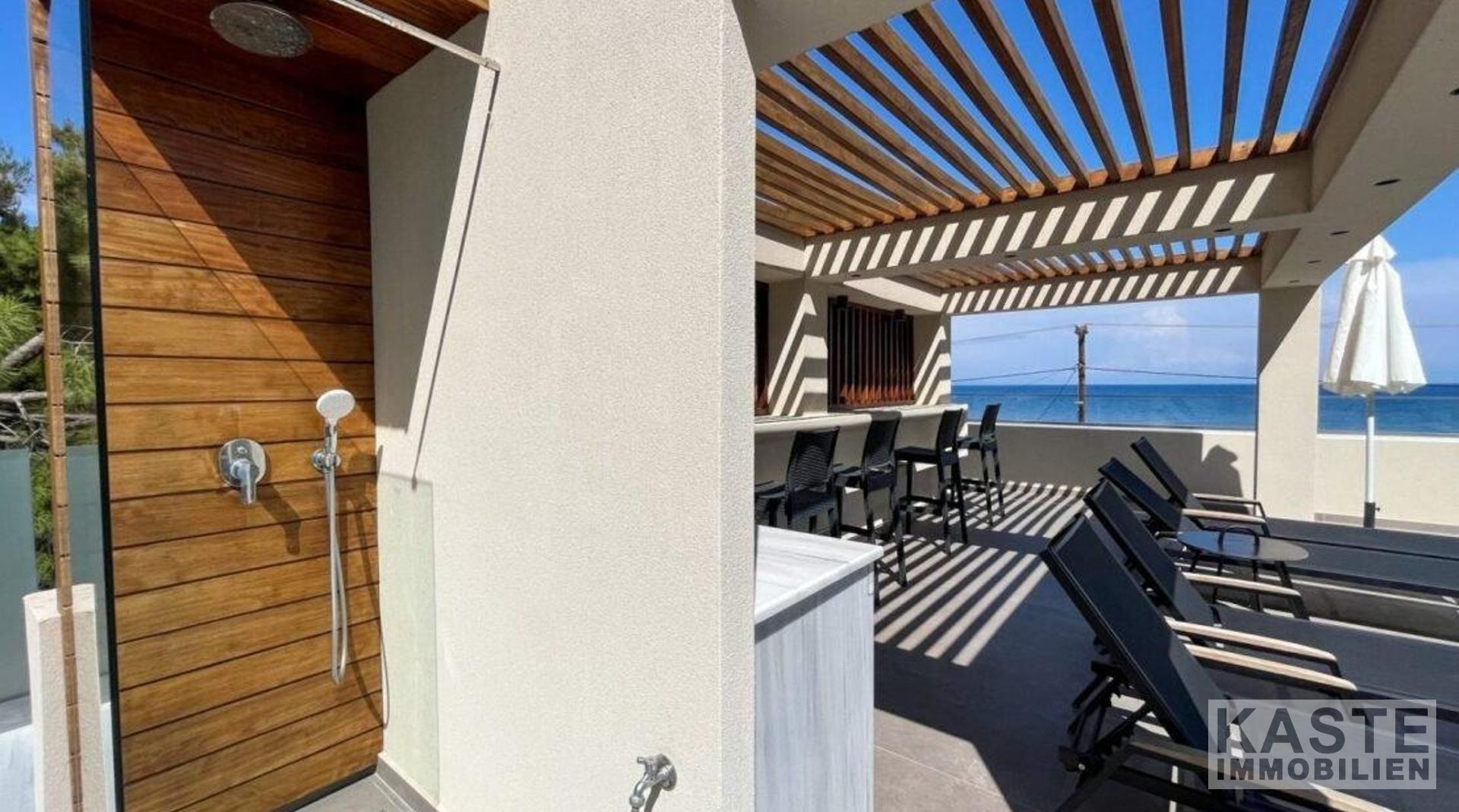 Das Anwesen besteht aus einem großzügigen Wohnzimmer mit deckenhohen Glastüren, einer offenen Küche mit Essbereich sowie vier Schlafzimmern und vier Badezimmern. Vier überdachte Terrassen, die nach Osten ausgerichtet sind, betonen den weiten Blick auf das kristallklare Blau des Ionischen Meeres. Zusätzlich verfügt das luxuriöse Anwesen über einen Pool auf dem Dach mit Außendusche und eine weitere überdachte Terrasse mit viel Privatsphäre.