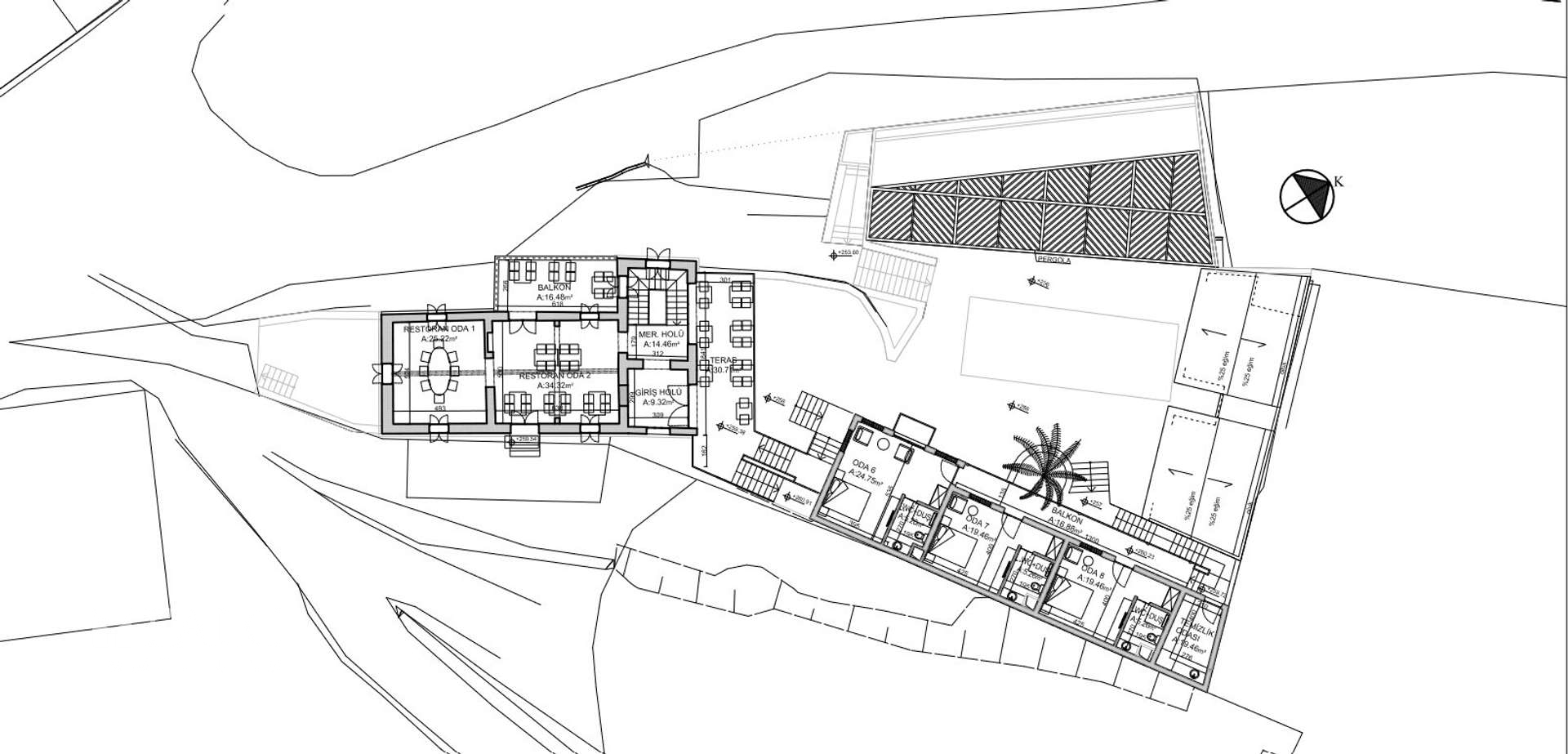 Das Boutique Hotel Projekt umfasst derzeit 11 Doppelzimmer und ein Restaurant. Es besteht jedoch die Möglichkeit, die Zimmeranzahl durch Planänderungen und Reduzierung der Zimmergröße auf etwa 20 zu erhöhen. Das bestehende Gebäude, das in ein Restaurant umgewandelt werden soll, bietet eine Fläche von 320 m².
