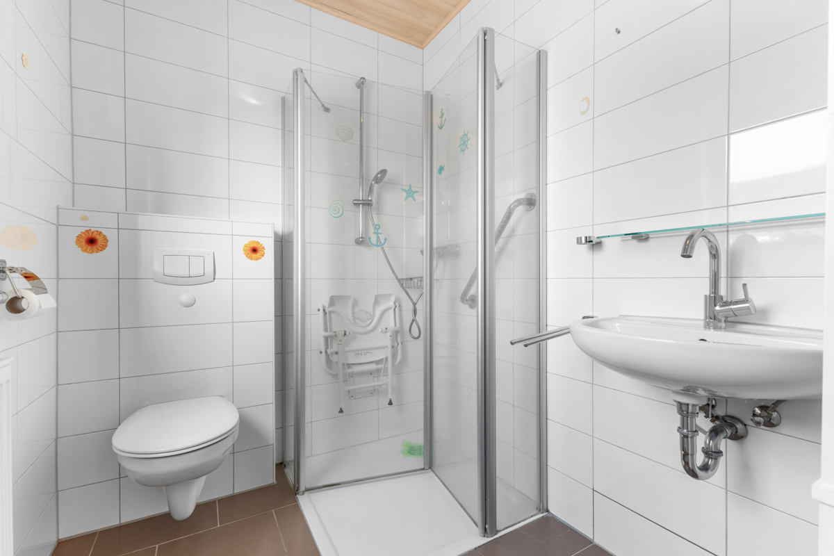 Das modernisierte Bad mit ebenerdiger Dusche bringt zeitgemäßen Komfort in den Alltag.