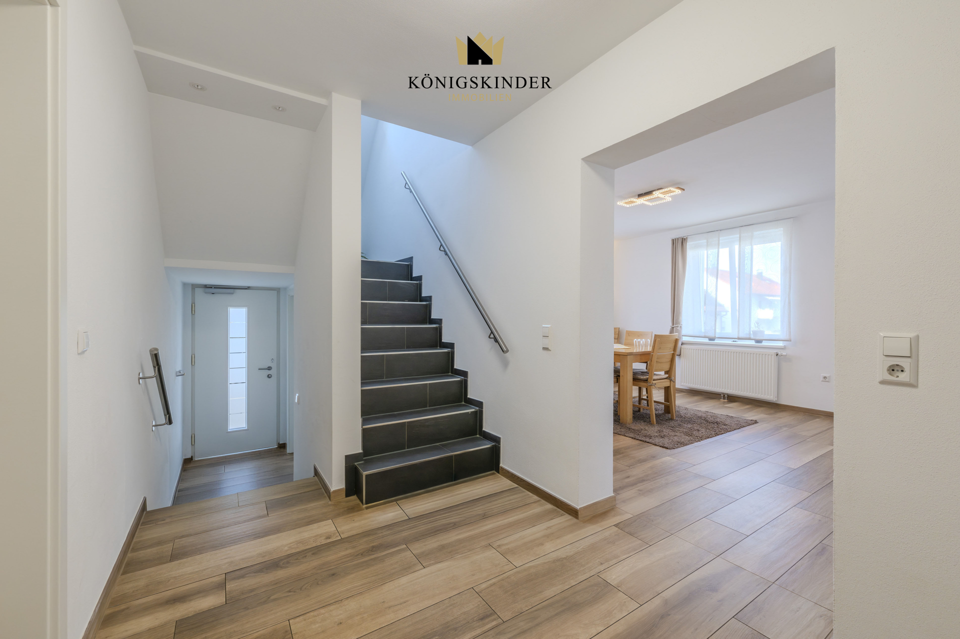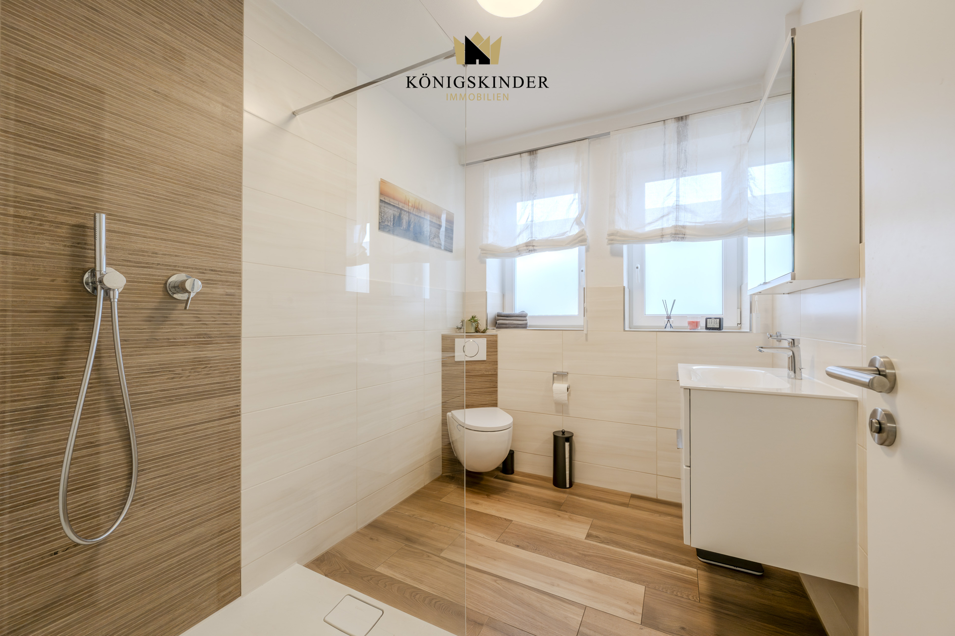 Zwischen 2017 und 2018 wurde der Wohnbereich im Erdgeschoss weiter aufgewertet: Die hochwertigen Bodenfliesen in warmer Holzoptik verleihen den Räumen ein einladendes Ambiente, während das Tageslichtbad mit bodengleicher Dusche modern und komfortabel gestaltet ist. Das Erdgeschoss überzeugt weiterhin durch das großzügige Wohn-Esszimmer mit viel Tageslicht und angenehmer Wohnatmosphäre sowie einem gemütlichen Schlaf- oder Gästezimmer. Die neue Küche bietet alles, was man für einen entspannten Kochalltag braucht – funktional, ästhetisch und perfekt in den Grundriss eingebettet. Besonders schön: Von der Küche gelangt man über nur wenige Stufen direkt in den Garten – ein echter Pluspunkt für alle, die kurze Wege lieben, gern draußen kochen oder den Blick ins Grüne schätzen.