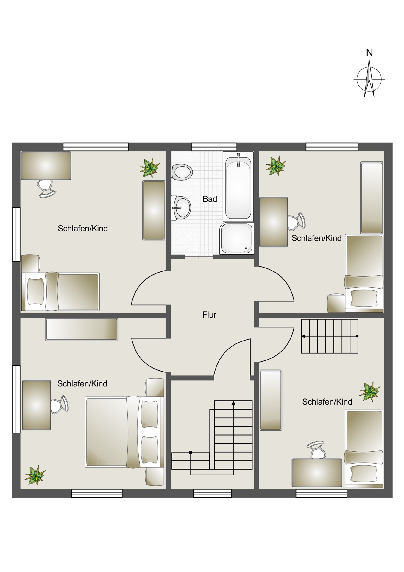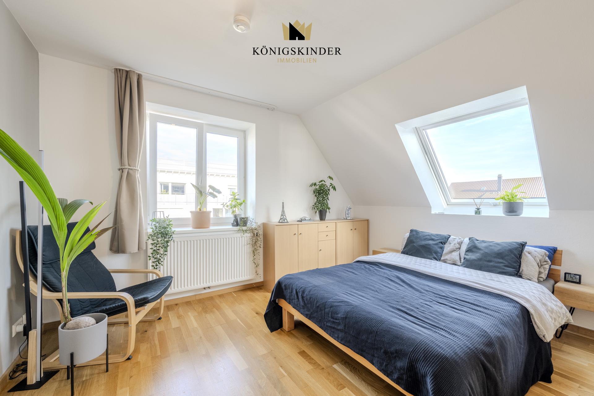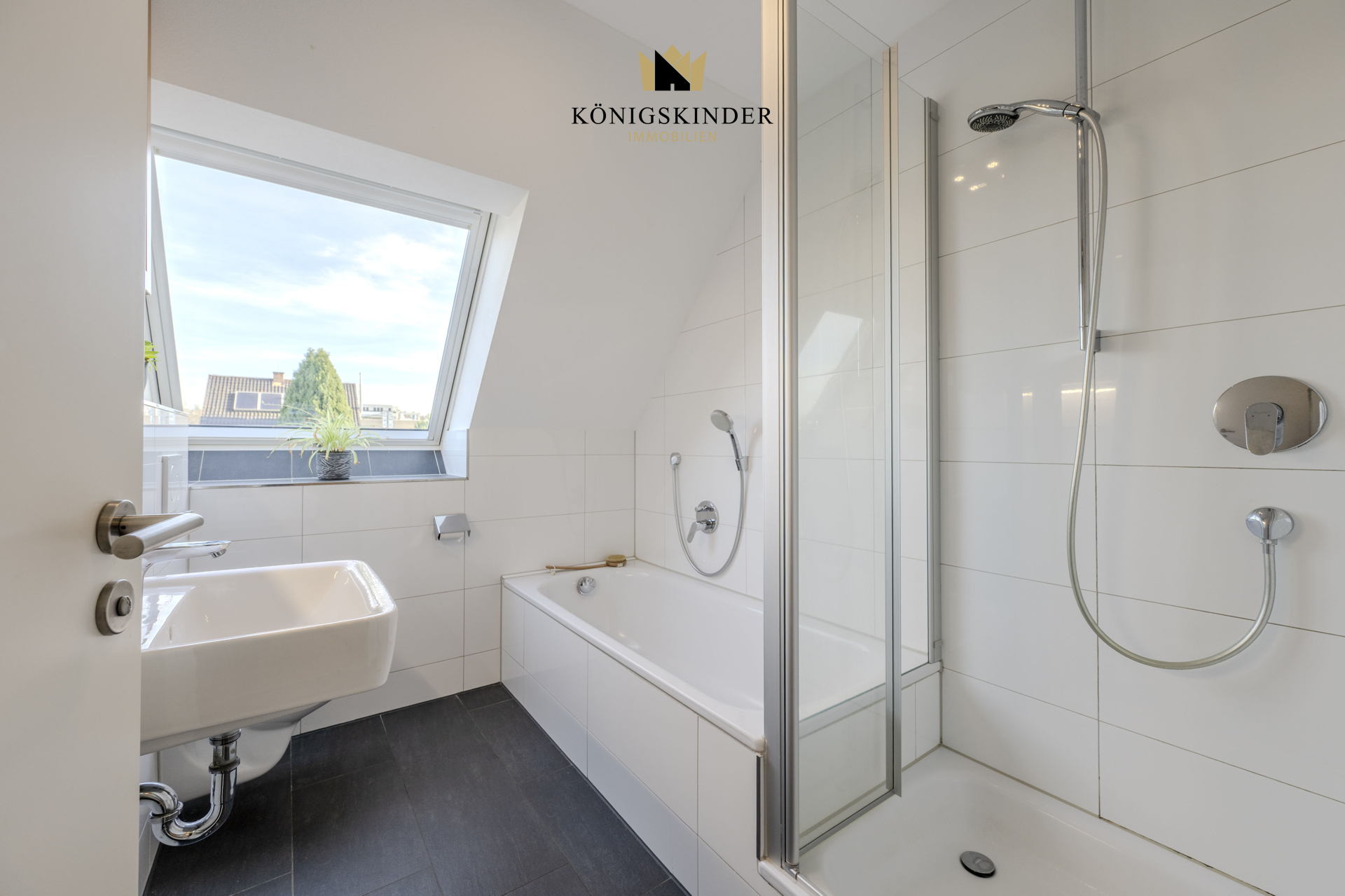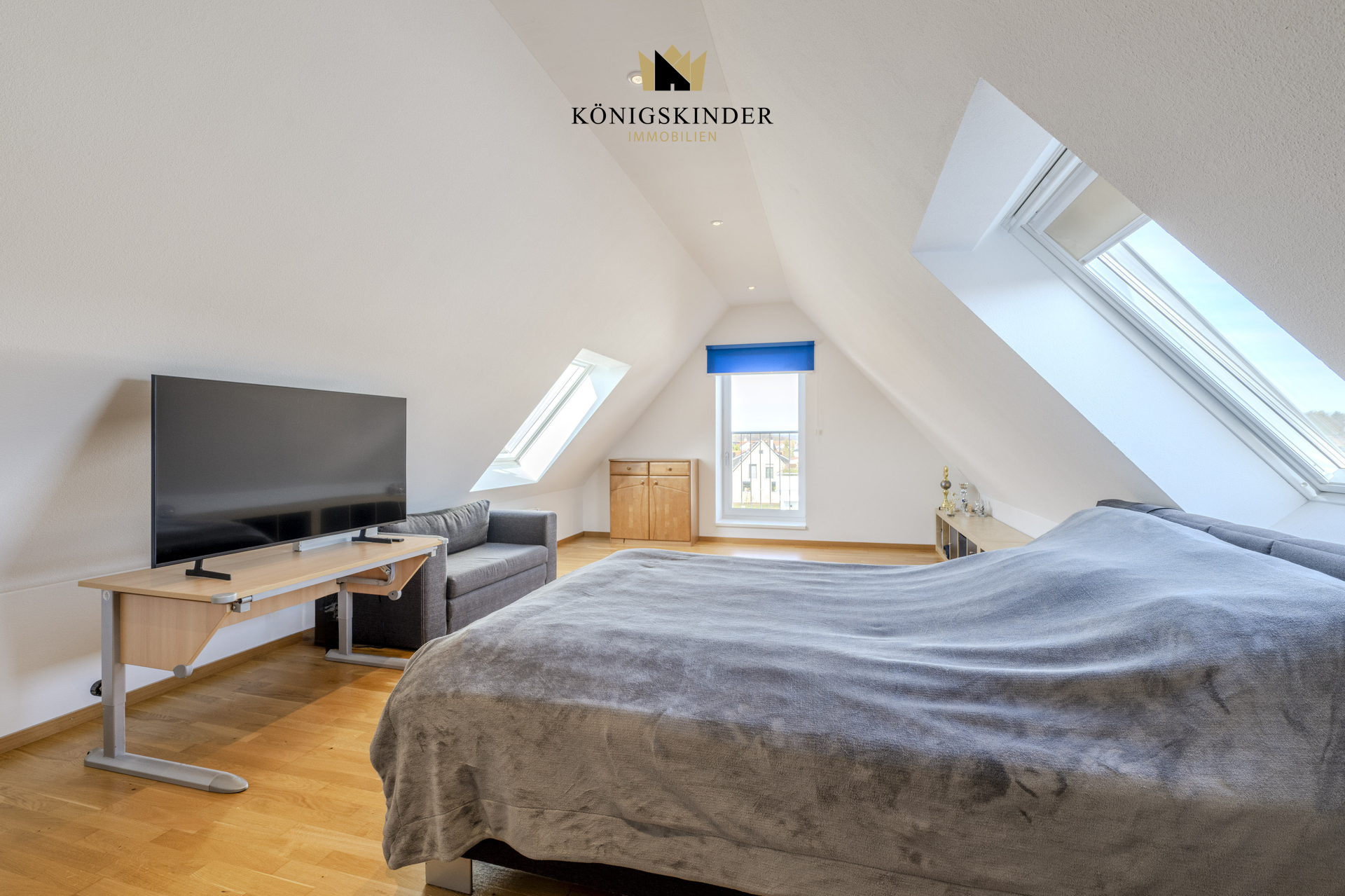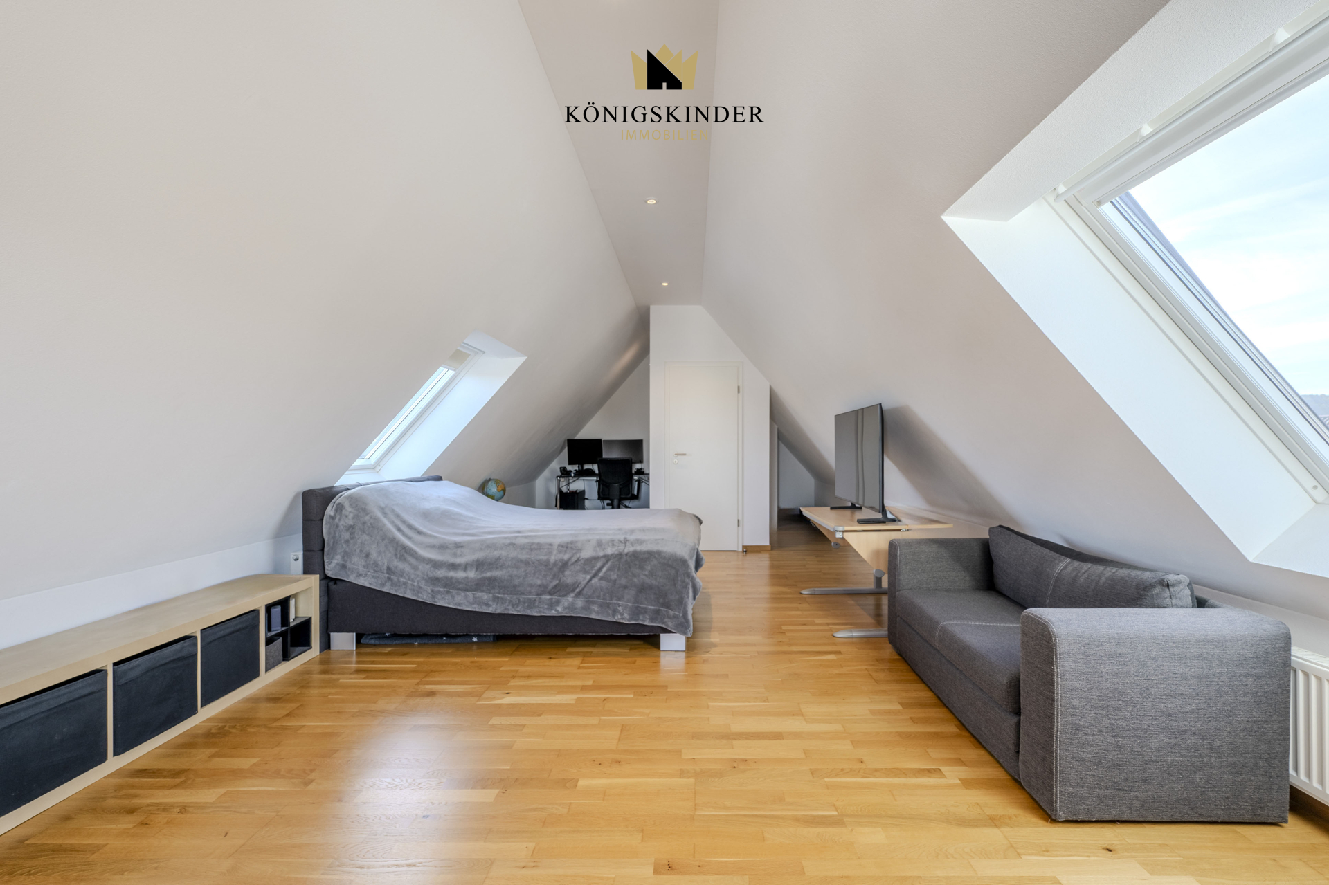 Im Obergeschoss stehen vier vielseitig nutzbare Zimmer bereit. Ein weiteres Tageslichtbad mit Wanne und Dusche sorgt für zusätzlichen Komfort. Über eine Schmetterlingstreppe gelangt man in den ausgebauten Dachspitz, der sich hervorragend als Studio oder Spielbereich eignet.