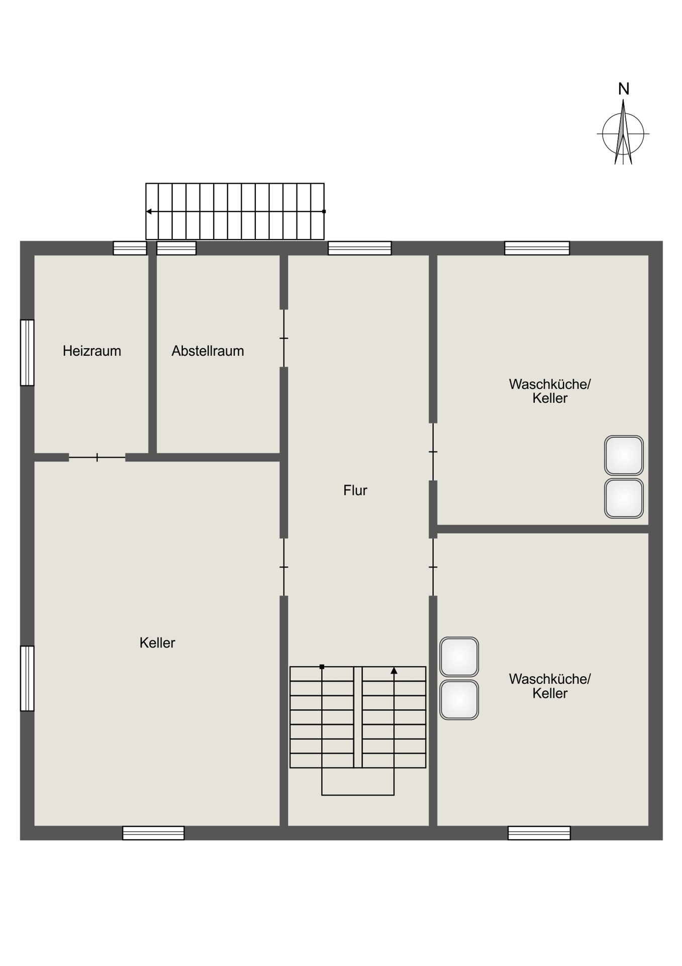 Das vollständig unterkellerte Gebäude bietet einen direkten Zugang in den Garten, ist praktisch für Vorräte, Hobby oder Werkstatt.