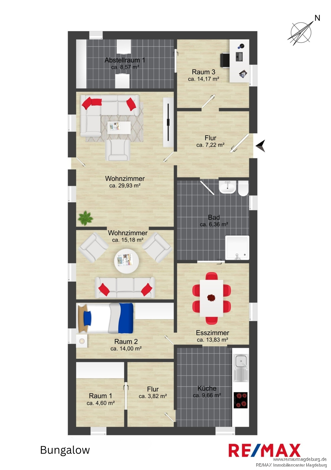 Bungalow: - 2 Flure - Abstellraum - Bad mit Dusche und Fenster - 1 großzügiges Wohnzimmer - Küche - Esszimmer - drei weitere Zimmer