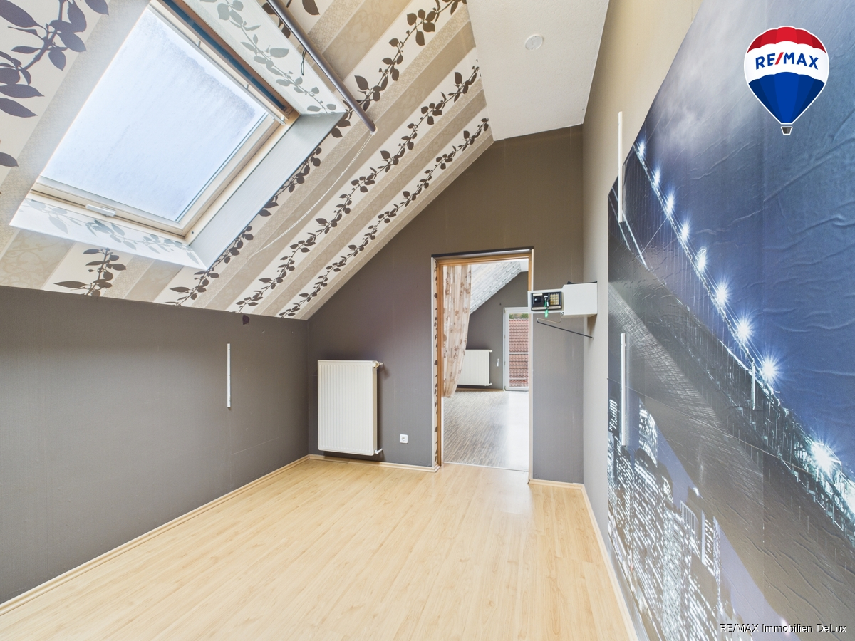 Auf der linken Seite gelangen Sie in das Dachgeschoss des Altbaus, in dem sich zwei weitere Schlafzimmer sowie ein weiteres Badezimmer befinden. Die frühere Verbindungstür zwischen Alt- und Neubau wurde verschlossen, könnte bei Bedarf jedoch wieder geöffnet werden.