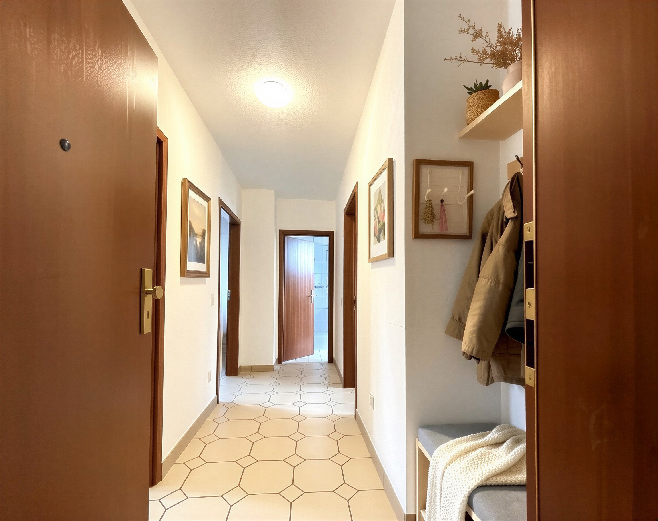 Beim Betreten der Wohnung gelangen Sie in einen zentralen Flur, von dem aus alle Räume bequem erschlossen werden. Diese klare Grundrissstruktur sorgt für eine optimale Nutzung der Wohnfläche und eine angenehme Wohnatmosphäre.