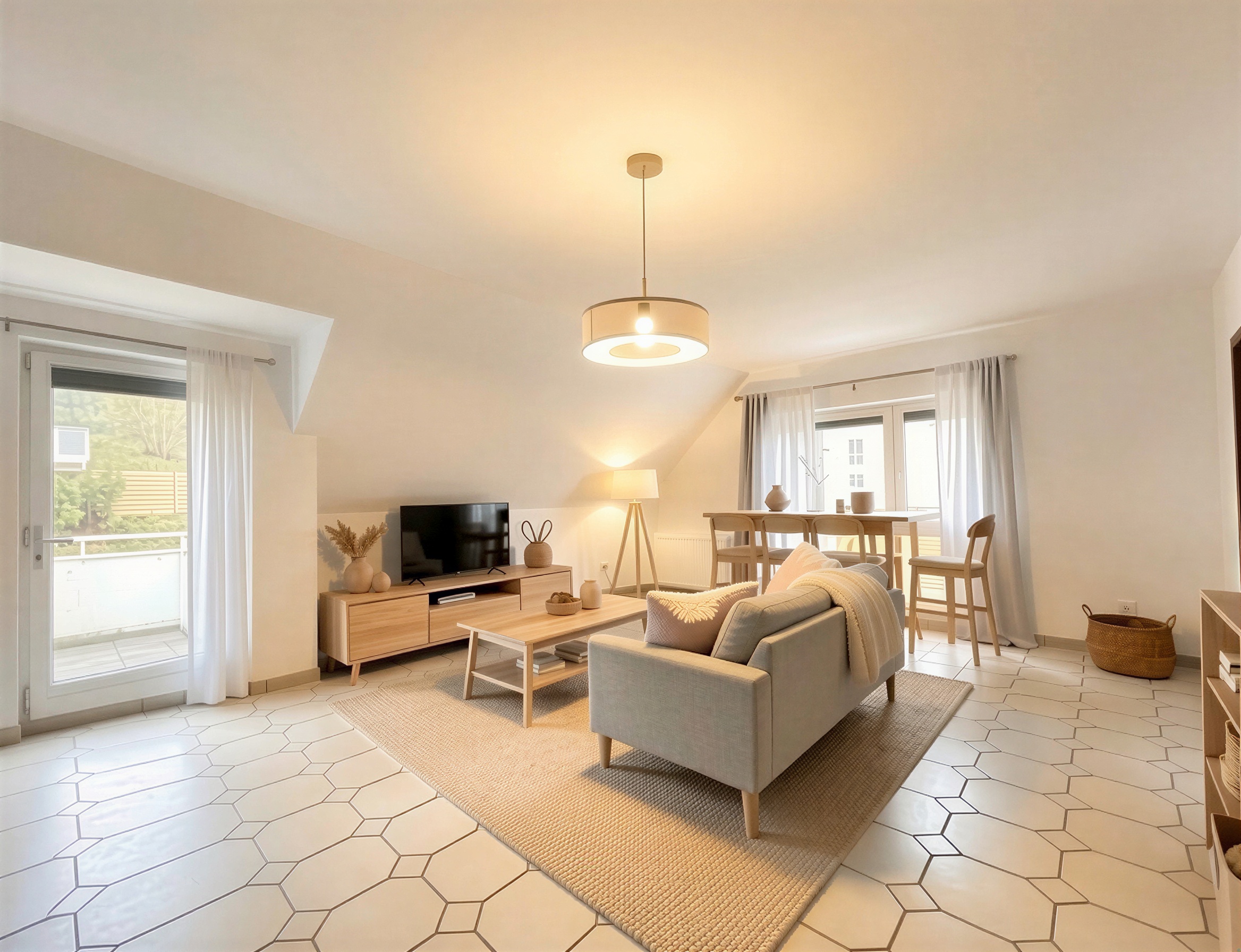 Der großzügige Wohnbereich profitiert von großen Fensterflächen, die für eine helle und freundliche Atmosphäre sorgen und den Raum besonders einladend wirken lassen.