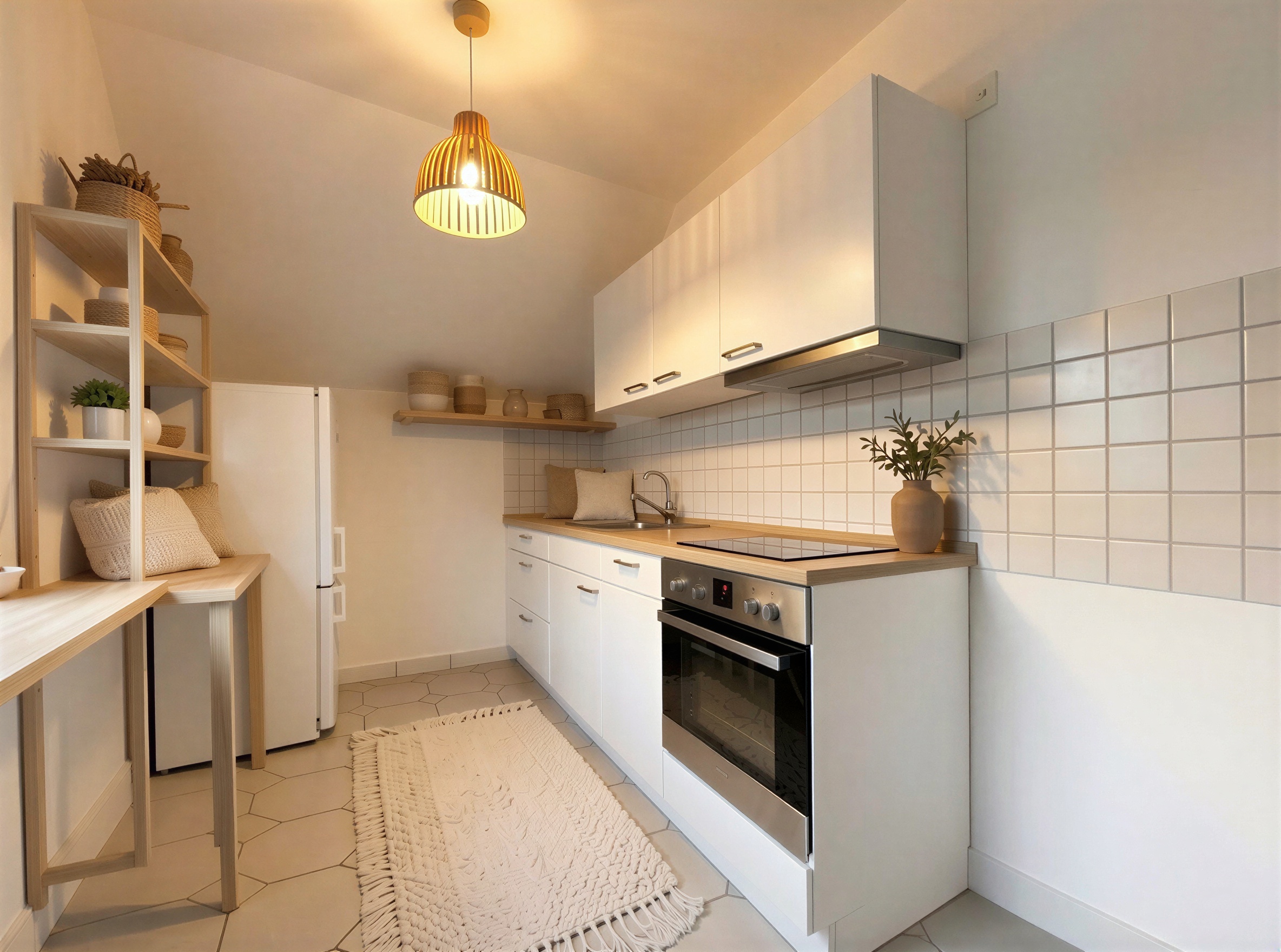 Das Badezimmer ist funktional gestaltet, vollständig gefliest und verfügt sowohl über eine separate Badewanne als auch über eine Dusche. Die Küche ist ebenfalls mit einem pflegeleichten Boden ausgestattet und bietet praktische Voraussetzungen für den Alltag.
