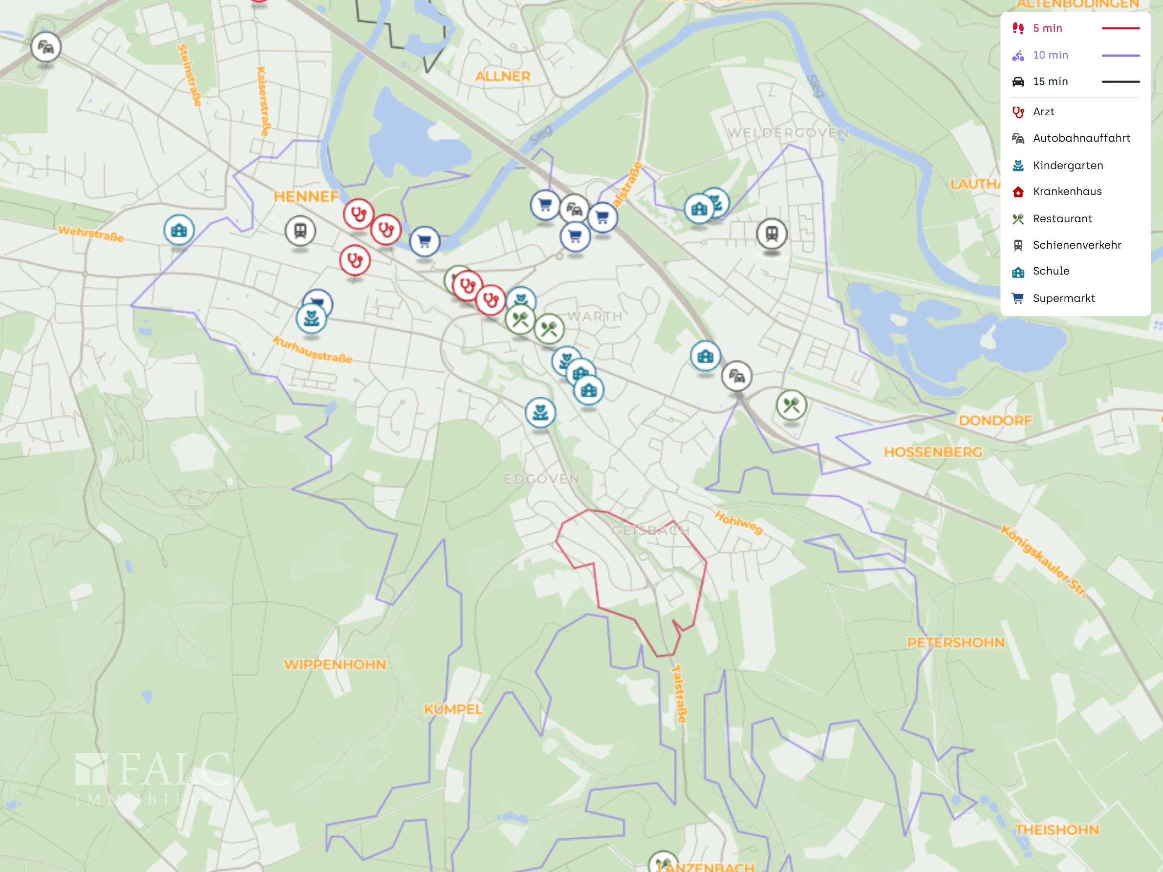 Auch die praktische Infrastruktur ist gut abgedeckt: Eine E-Ladestation befindet sich in ca. 1,0 km Entfernung, Tankstellen wie BELL Oil liegen bei ca. 1,3 km. Medizinische Anlaufstellen sind ebenfalls in der Umgebung vorhanden, etwa das Medizinische Versorgungszentrum Hennef in ca. 1,9 km.