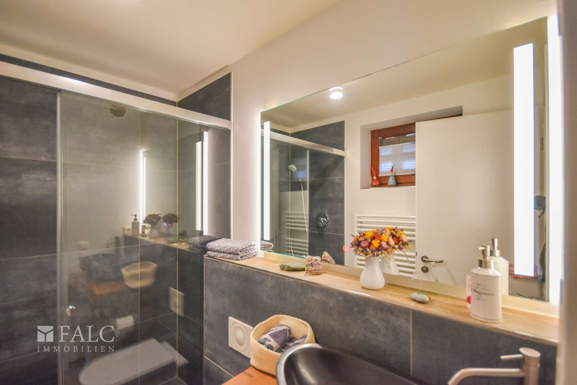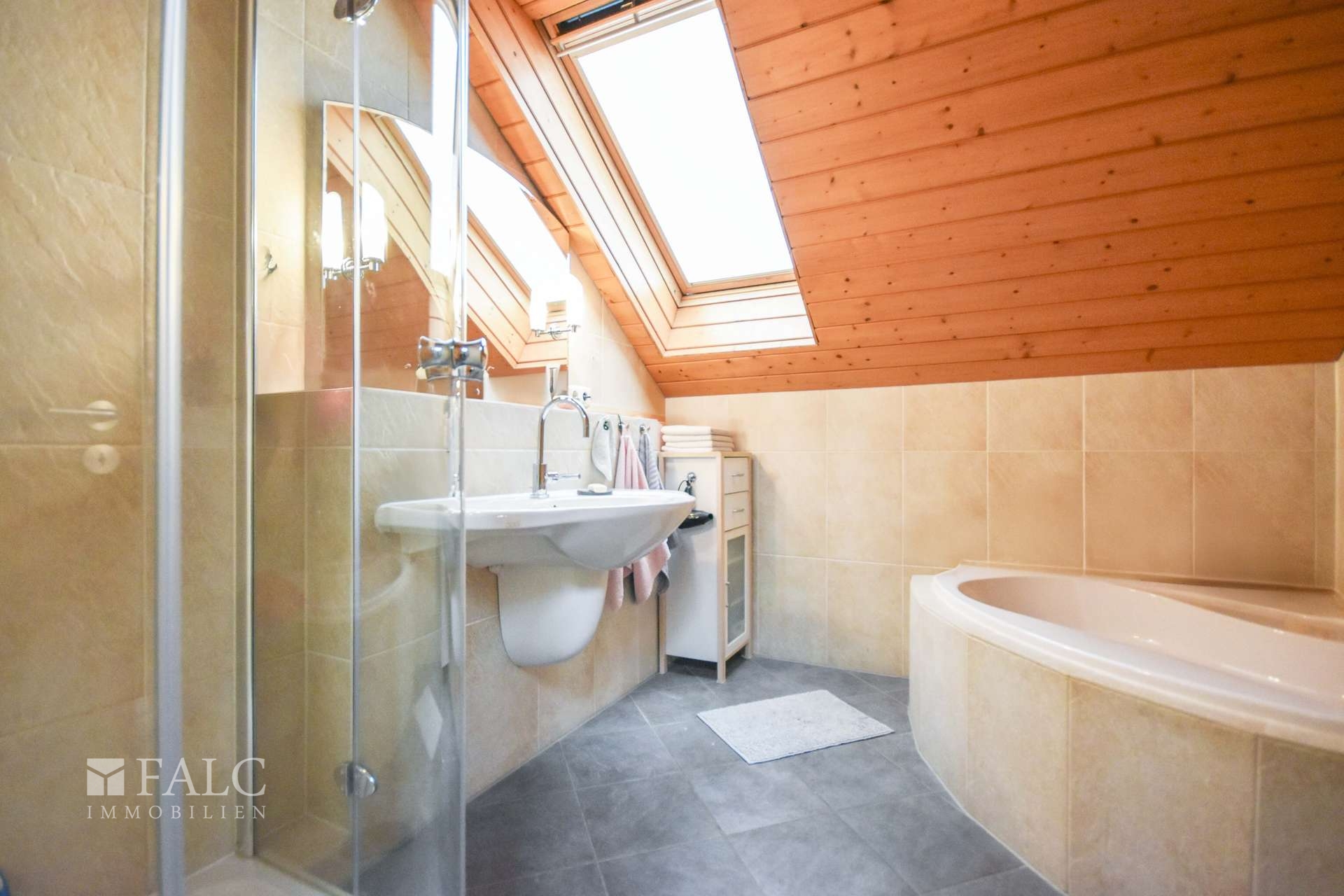 Badezimmer in der Einliegerwohnung Wohn- und Schlafraum (ELW)Hausflur EGKucheWohnzimmer Blick in den GartenWohnzimmer Blick auf den GartenGäste WCTerrasse GartenFlur OGHome OfficeSchlafzimmerBadezimer OGSchlafzimmer 2 (3)Gemütlicher RückzugsortGartenteichTerrassenansichtAußenansichtAußenbereichGrundriss EGGrundriss OGGrundriss KellerAnsicht Gartenseite