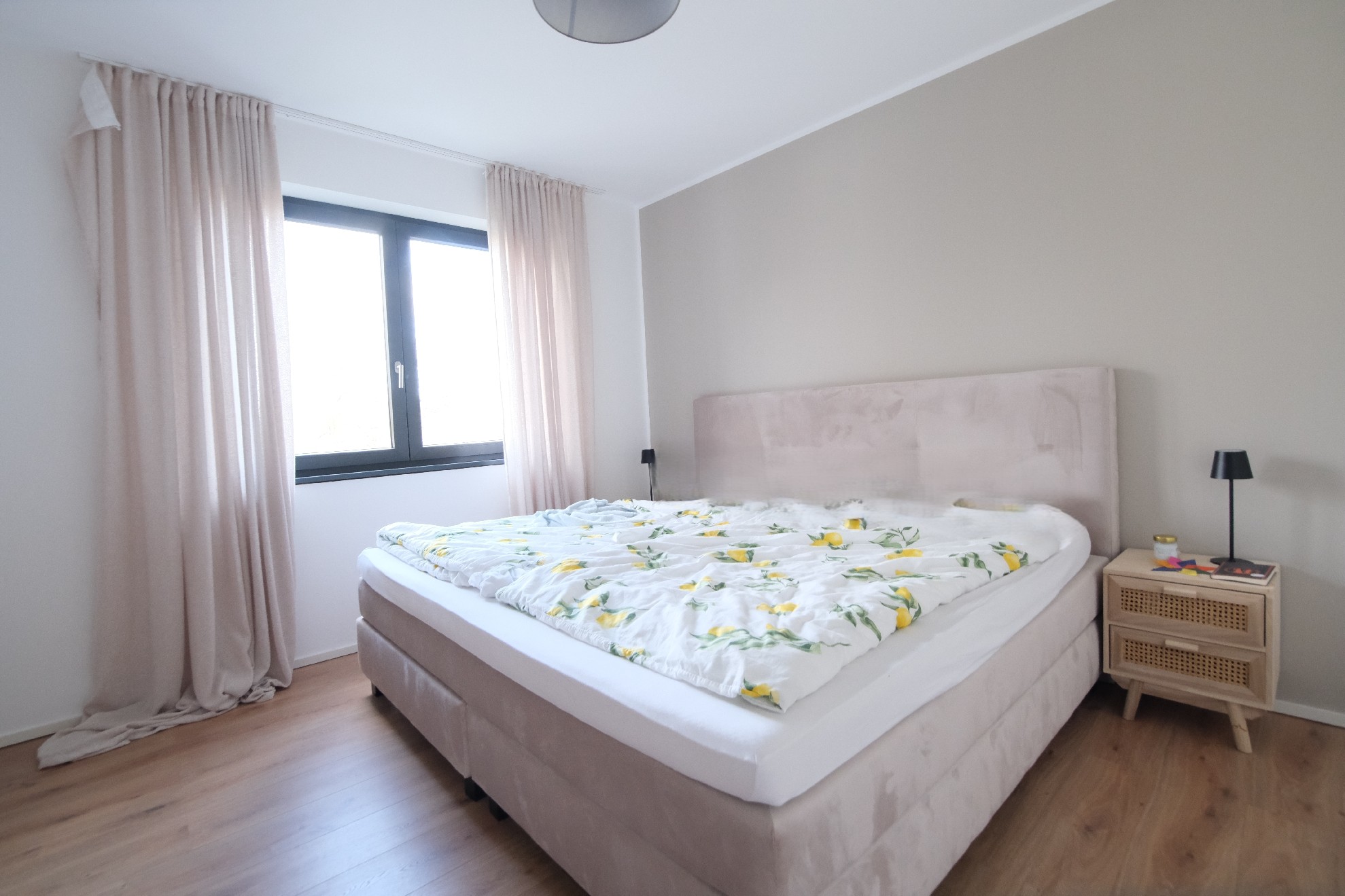 Obergeschoss: Ein geräumiges Elternschlafzimmer mit zwei Ankleiden und einem eigenen Badezimmer mit Wanne, bodenebener Dusche, zwei Handwaschbecken, Bidet und einer Toilette sowie Balkonzugang. Zwei Kinderzimmer, ein Kinder-Duschbad mit WC und Wachbecken, ein praktischer Abstellraum mit Fenster.