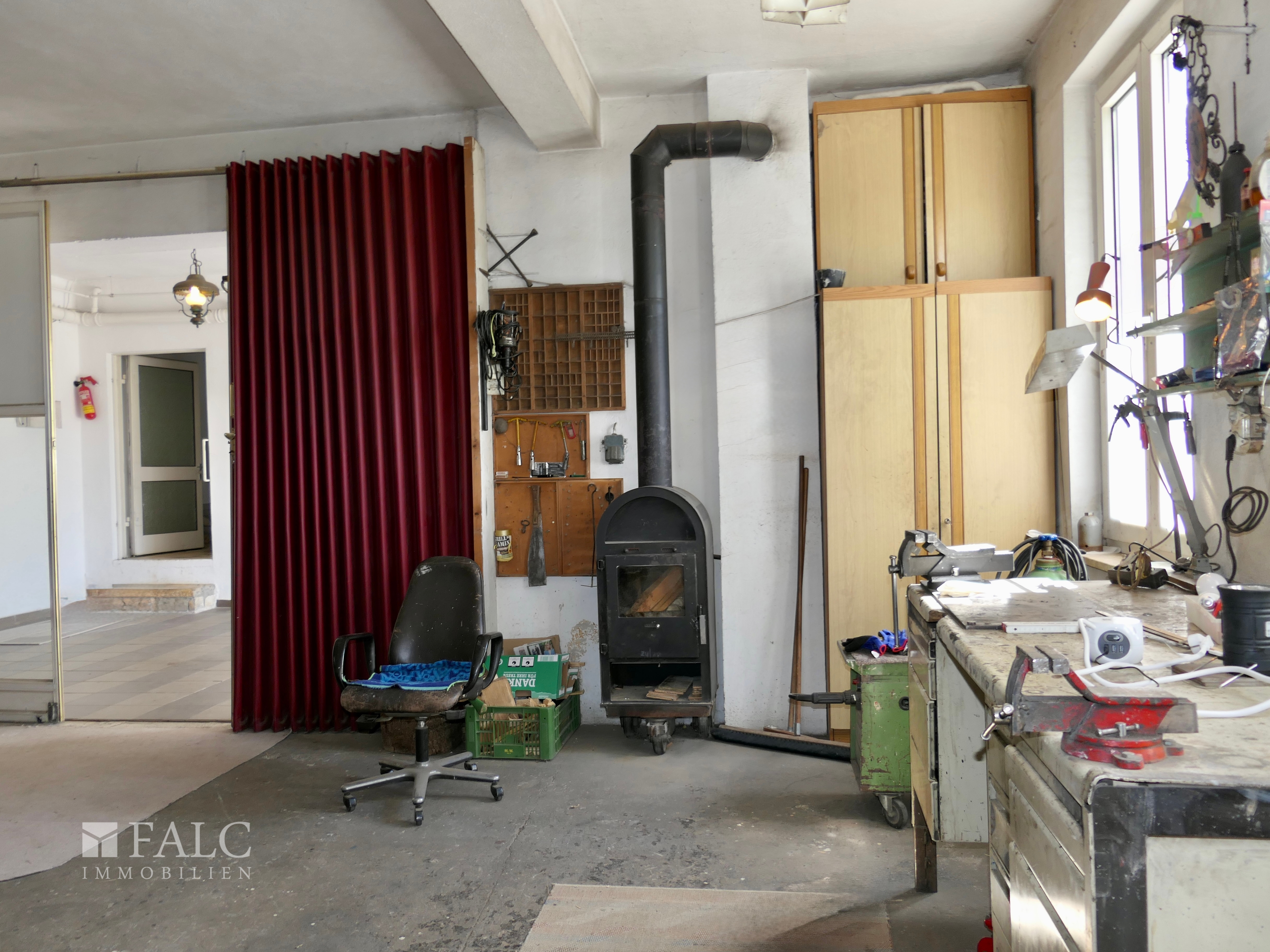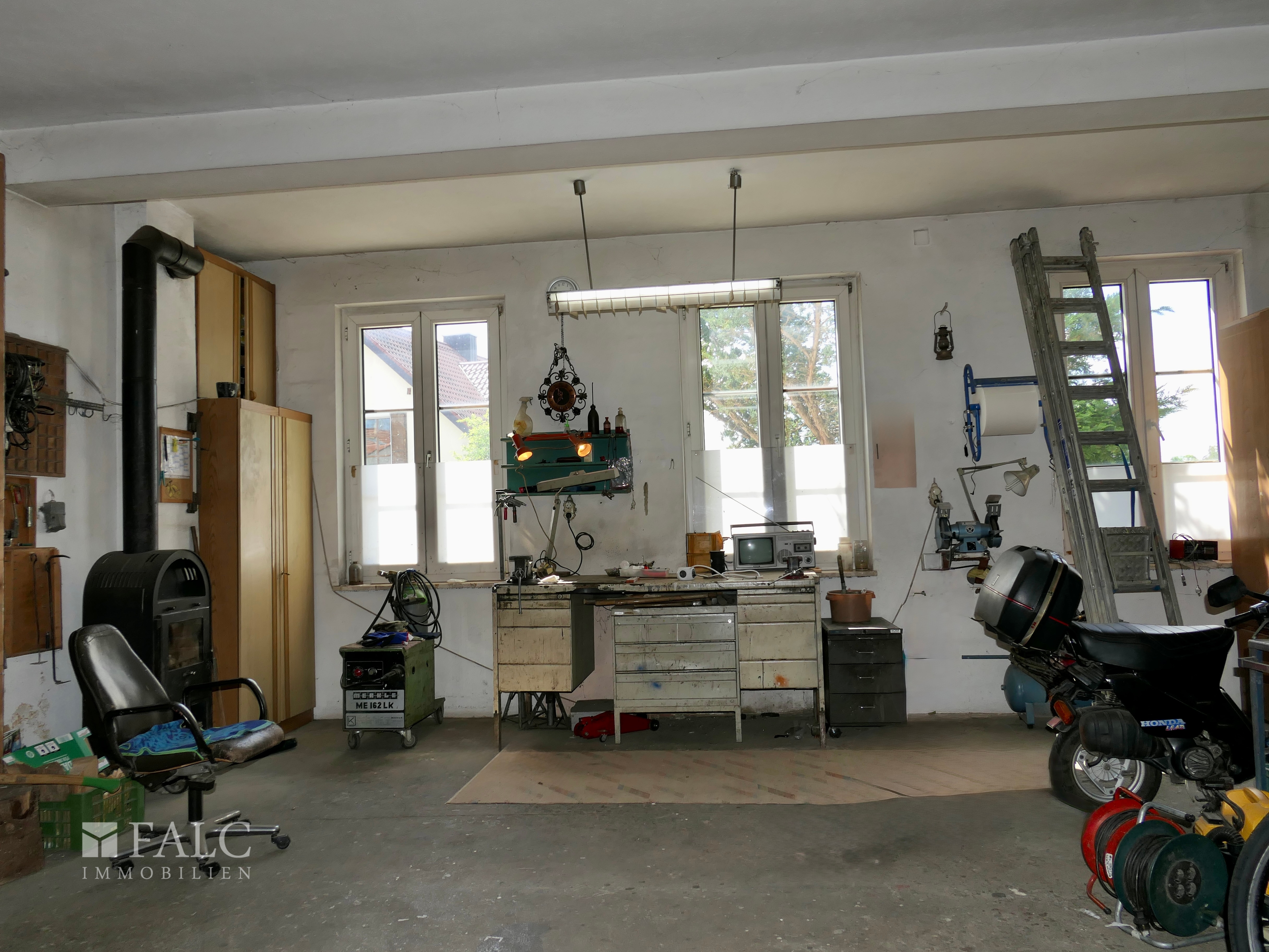 - Hobby-Werkstatt, ebenerdig, ca. 120 m², großes elektrisches Tor, Fenster, Flaschenzug, Holzofen. Zugang von Hobby-Werkstatt zur Master-Wohnung und Heizraum - Separate Garage, 2 Tore, ca. 80 m², Platz für 2-4 PKW - Das Haus war früher eine Schreinerei, wurde dann nach Verkauf/Kauf umgebaut/erweitert in Wohnraum und bietet heute Wohnen, Hobby-Werkstatt und vieles mehr.