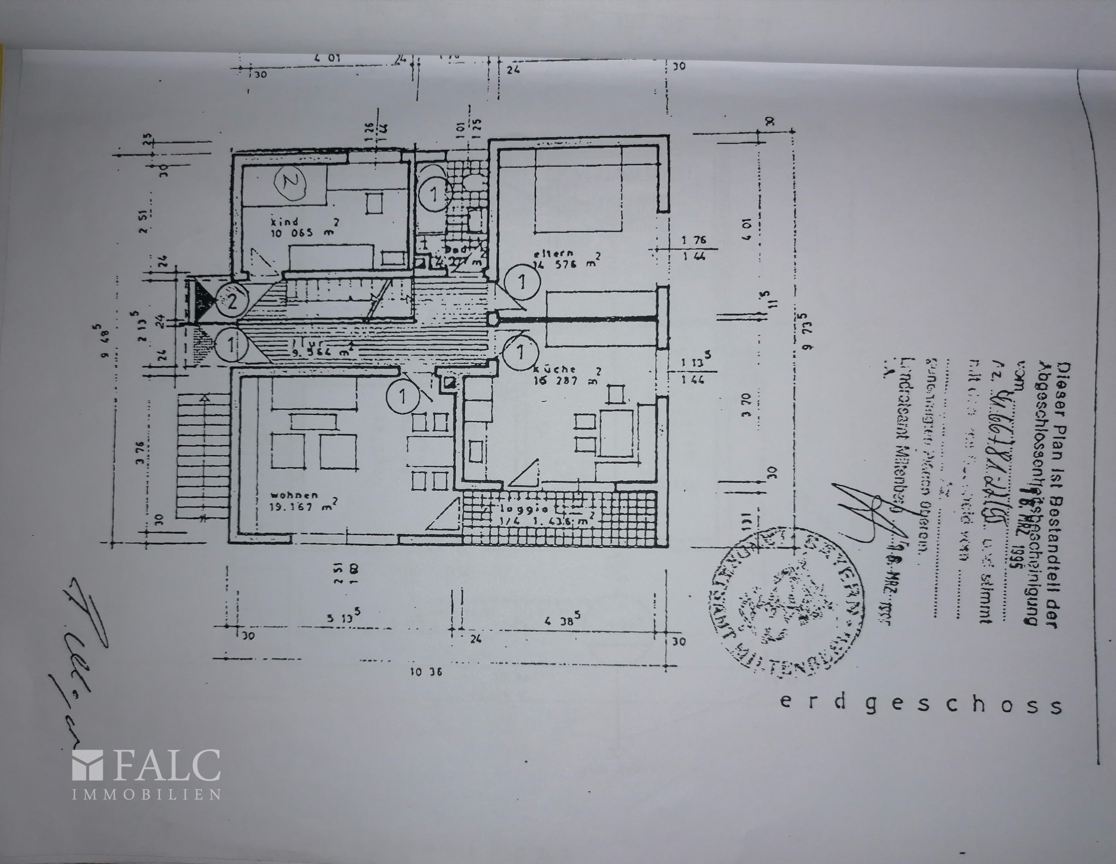 Wohnzimmer ca. 19,16 m² Küche ca. 16,28 m² Schlafzimmer ca. 14,57 m² Kinderzimmer ca. 9,83 m² Flur ca. 9,56 m² Loggia ca. 2,87 m² Badezimmer ca. 4,27 m² Balkon ca. 5,80 m²