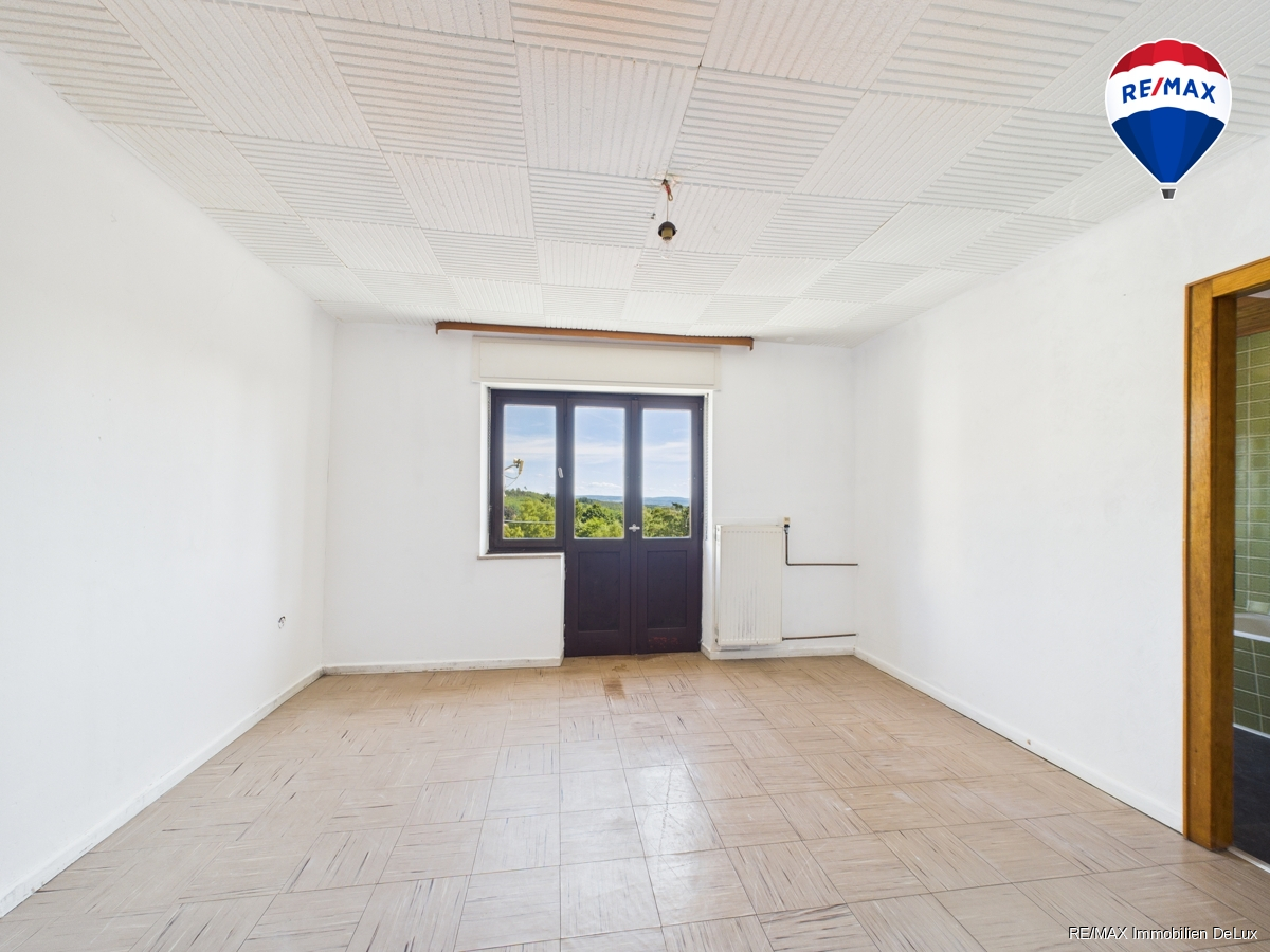 Im Flur gelangen Sie weiter geradeaus in das helle Wohnzimmer, welches durch große Fenster einen wunderbaren Blick in die Natur bietet. Der Balkon lädt an sonnigen Tagen zum Entspannen im Freien ein – ein idealer Ort, um die ruhigen Nachmittage zu genießen.