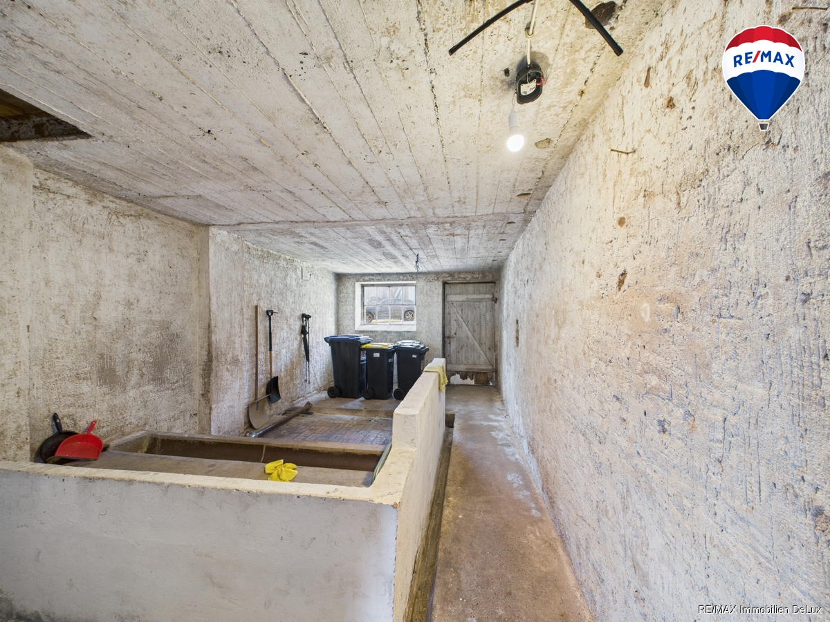Von der Diele aus führt eine Tür in einen praktischen Durchgang, der Ihnen Zugang zu einem Badezimmer mit offener Dusche bietet. Durch diesen Durchgang erreichen Sie auch den ehemaligen Stall, der heute vielseitig genutzt werden kann – sei es als zusätzlicher Stauraum oder kreatives Hobbyzimmer. Zusätzlich gelangen Sie von hier aus in die Garage, die Ihnen wertvollen Platz für Ihr Fahrzeug bietet.