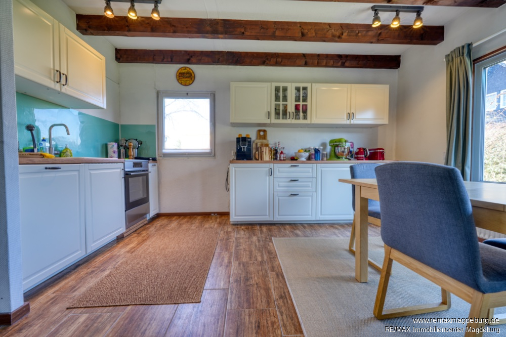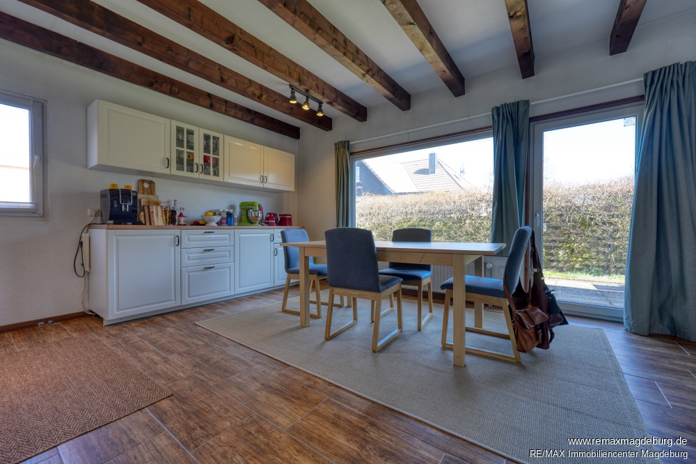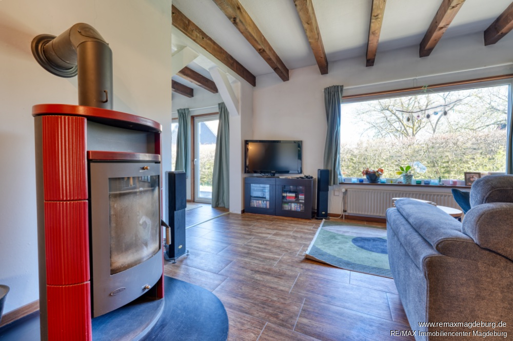 Besonders schön ist das große Wohn- und Esszimmer mit offener Küche. Im Wohnzimmer ist ein Kaminofen vorhanden, welcher in den Wintermonaten für eine angenehme Atmosphäre sorgt. Vom Wohnzimmer aus gelangen Sie auf die große Terrasse.