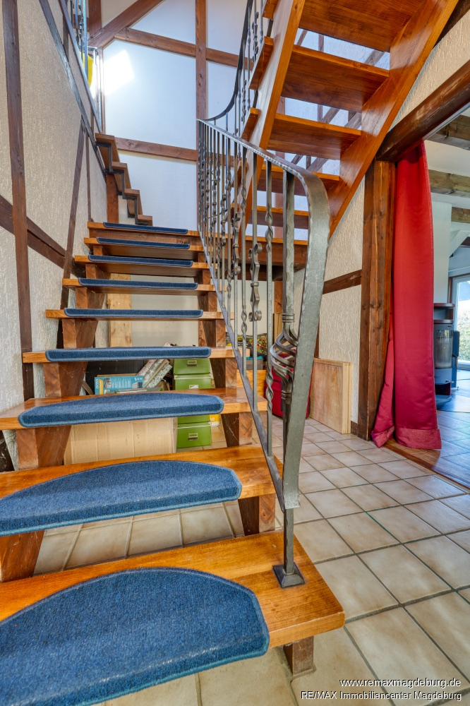 Im Erdgeschoss befinden sich folgende Räumlichkeiten: Diele, Gäste-WC, Heizungraum, großes Esszimmer mit offener Küche, Wohnzimmer mit Kaminofen, Abstellraum, Flur und einen 2. Abstellraum.