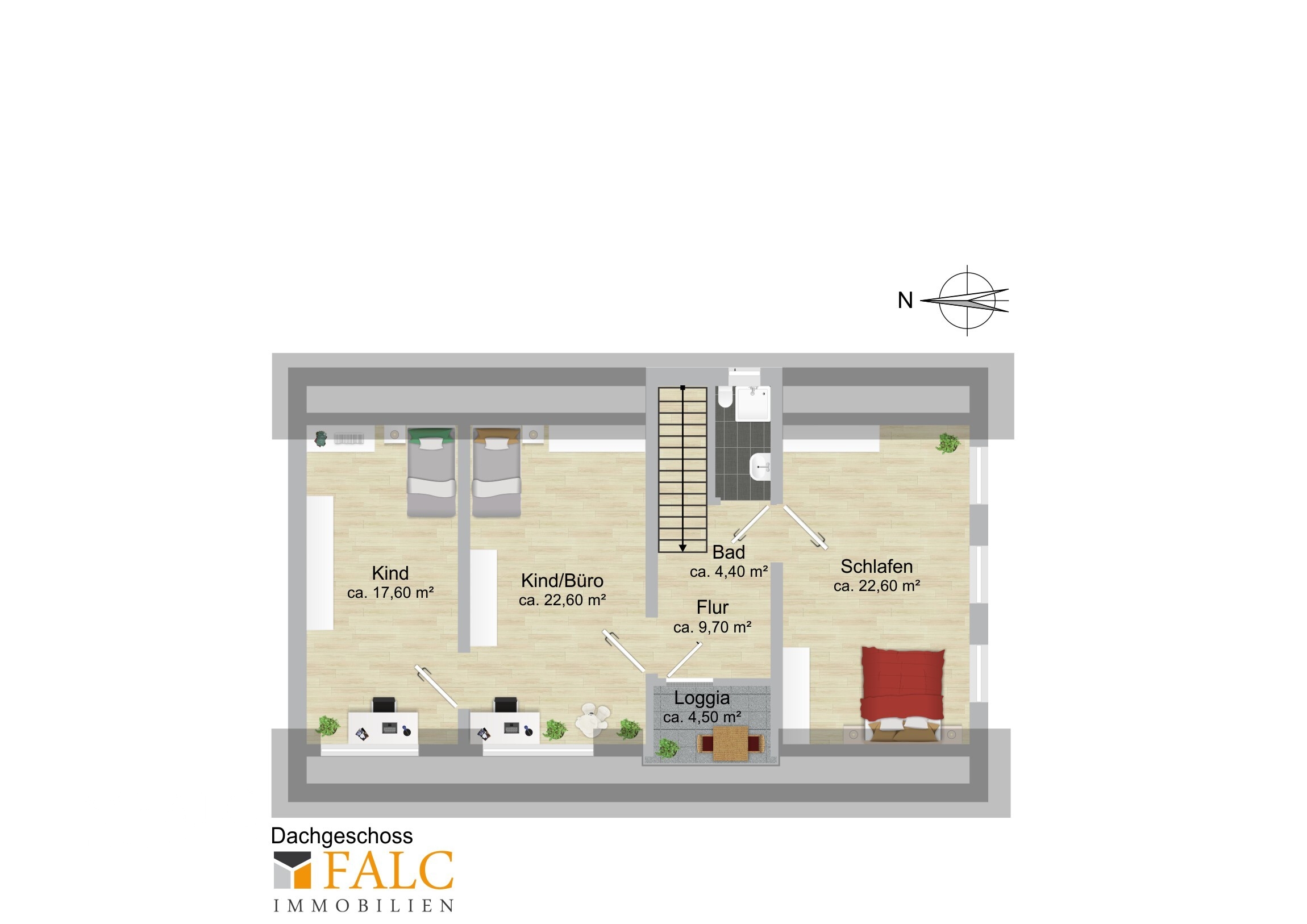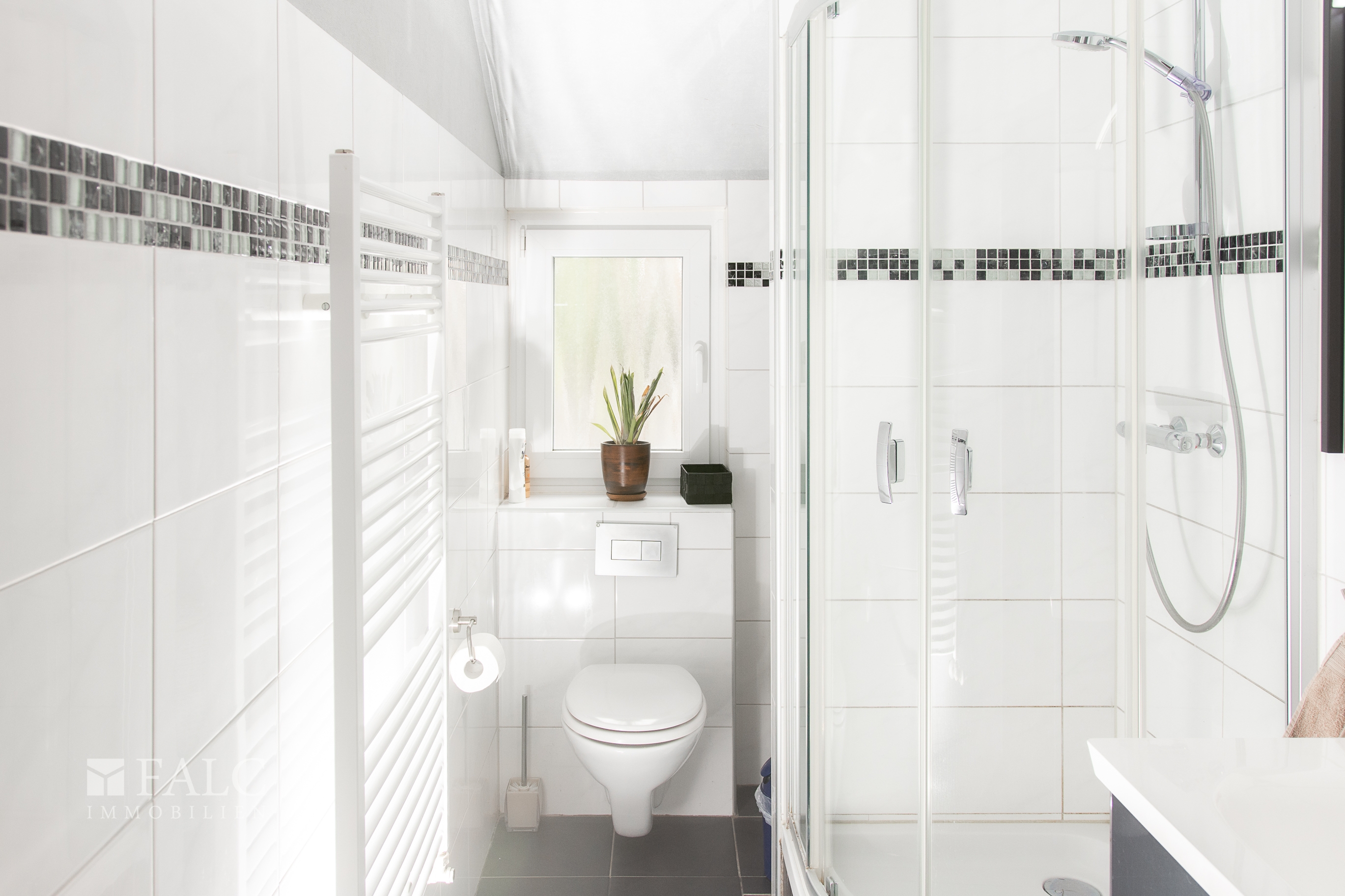 Ins Dachgeschoss führt eine helle Treppe. Dort finden Sie drei weitere Zimmer und eine überdachte Loggia. Das moderne Badezimmer mit Dusche stammt aus dem Jahr 2015.