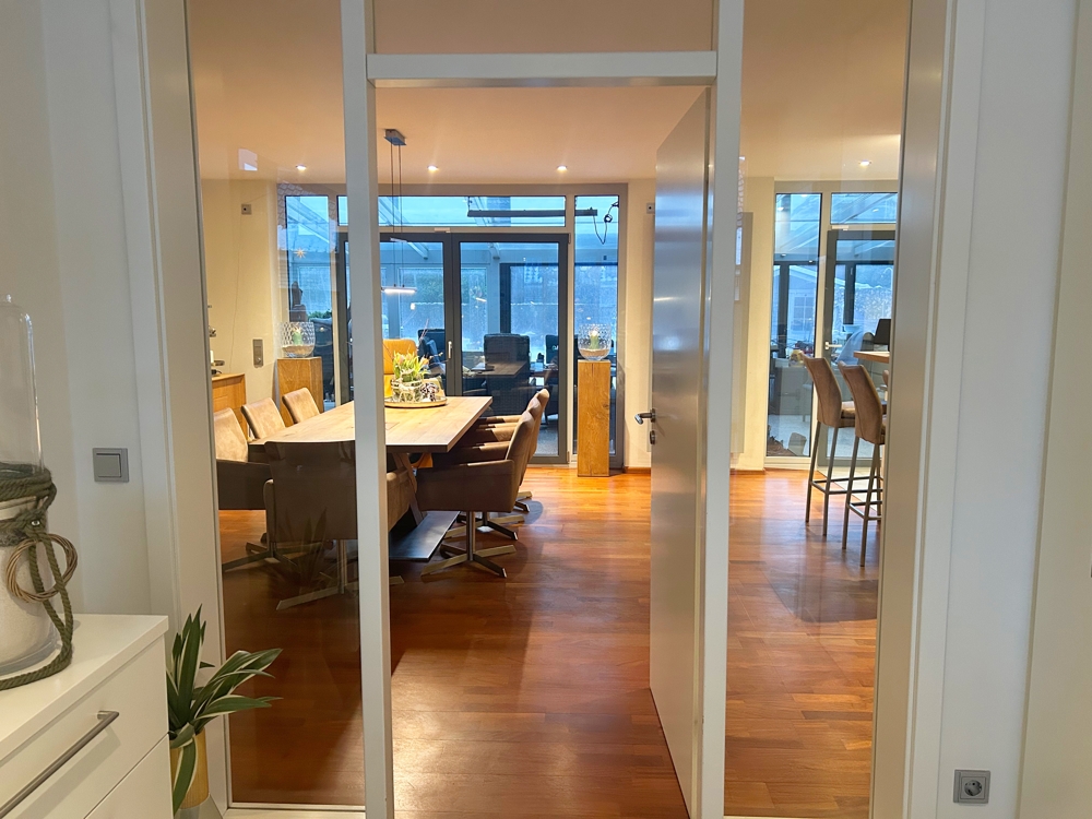 Erdgeschoss - Eingangsbereich / Flur - Gäste-WC - Offene Küche mit Essbereich und direktem Zugang zum Wintergarten - Wintergarten mit Übergang in den Garten - Wohnzimmer - Büro / Arbeitszimmer - Hauswirtschaftsraum mit praktischem Außenzugang