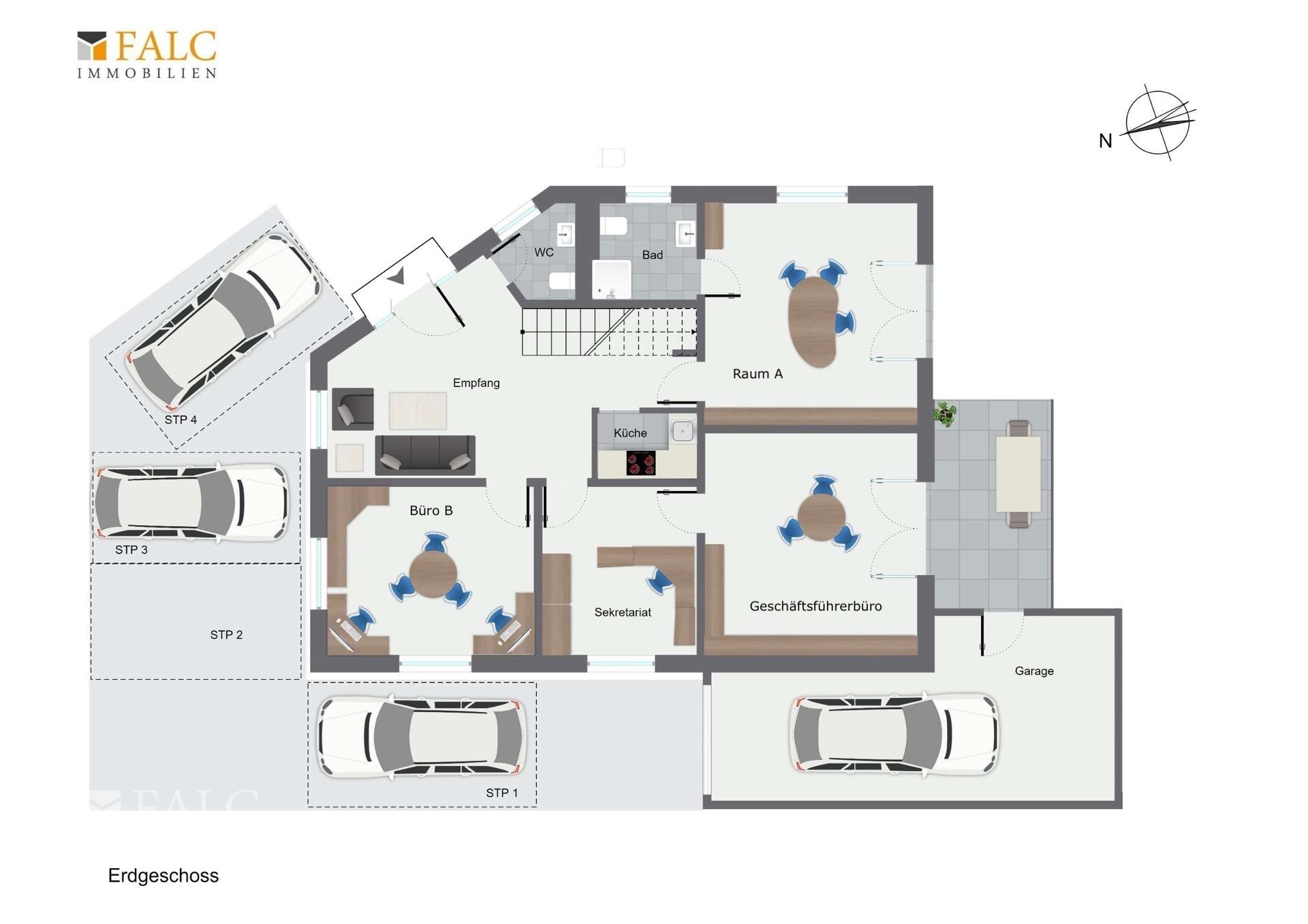 Erdgeschoss: - Empfang: 23,5 m² - Teeküche: 2,8 m² - WC: 2,9 m² - Geschäftsführerbüro: 15,5 m² - Sekretariat: 12,1 m² - Büro 1: 21,1 m² - Büro 2: 21,1 m² - WC mit Dusche: 4,8 m²