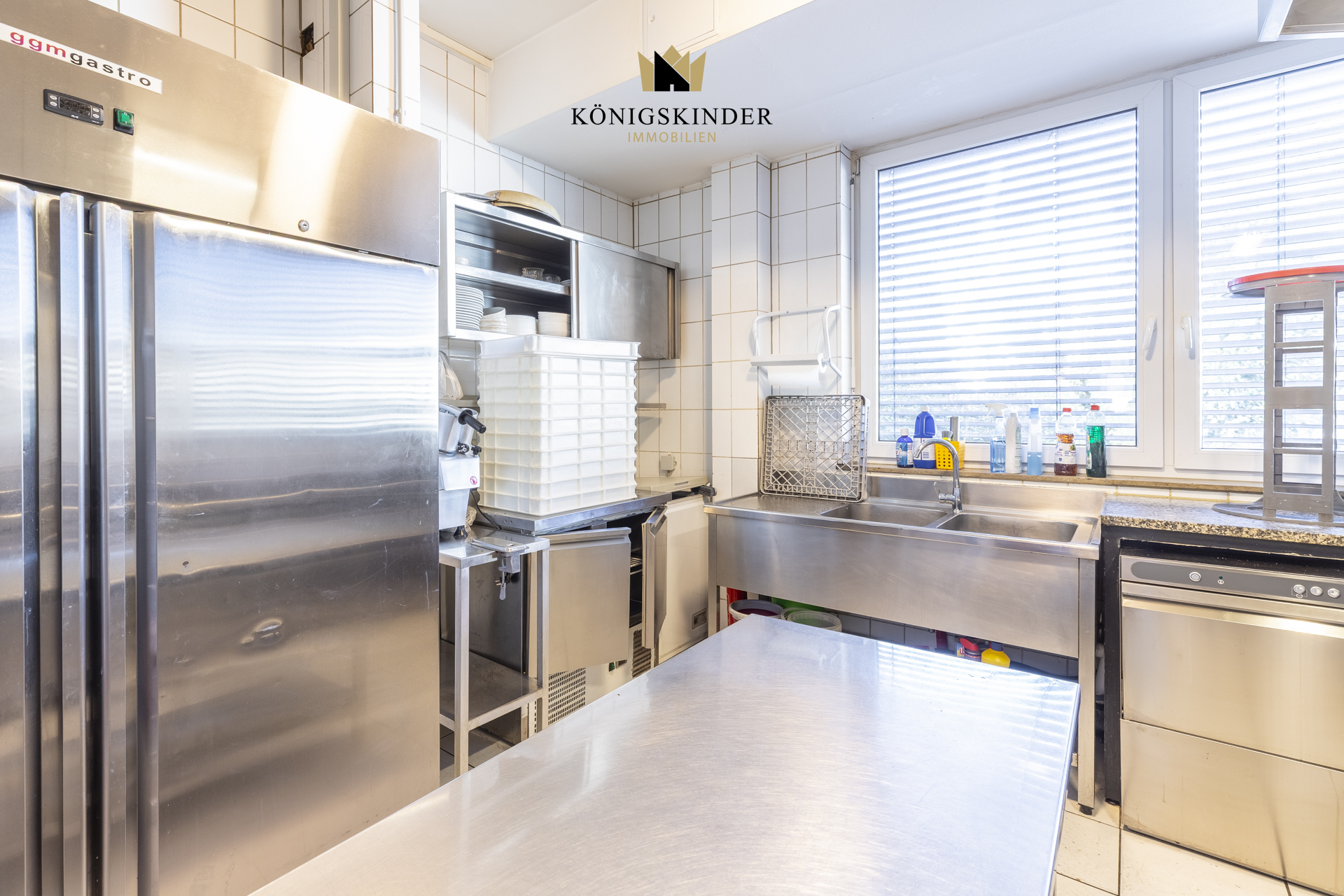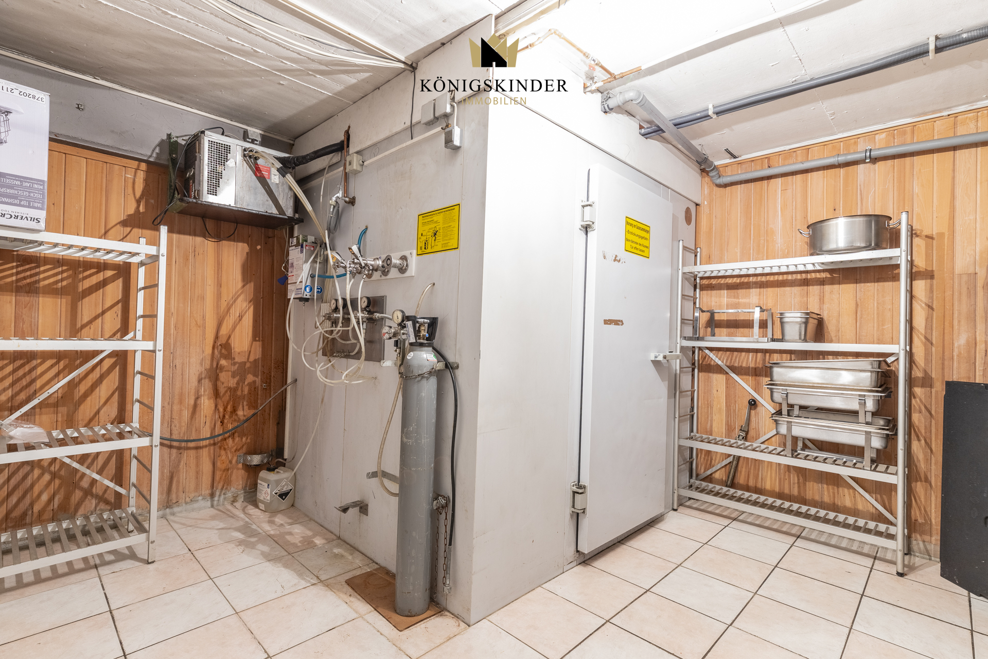 Im Kellerbereich befinden sich ein Kühlraum, ein zusätzlicher Lagerraum sowie drei sanitäre Einrichtungen für Damen, Herren und das Personal