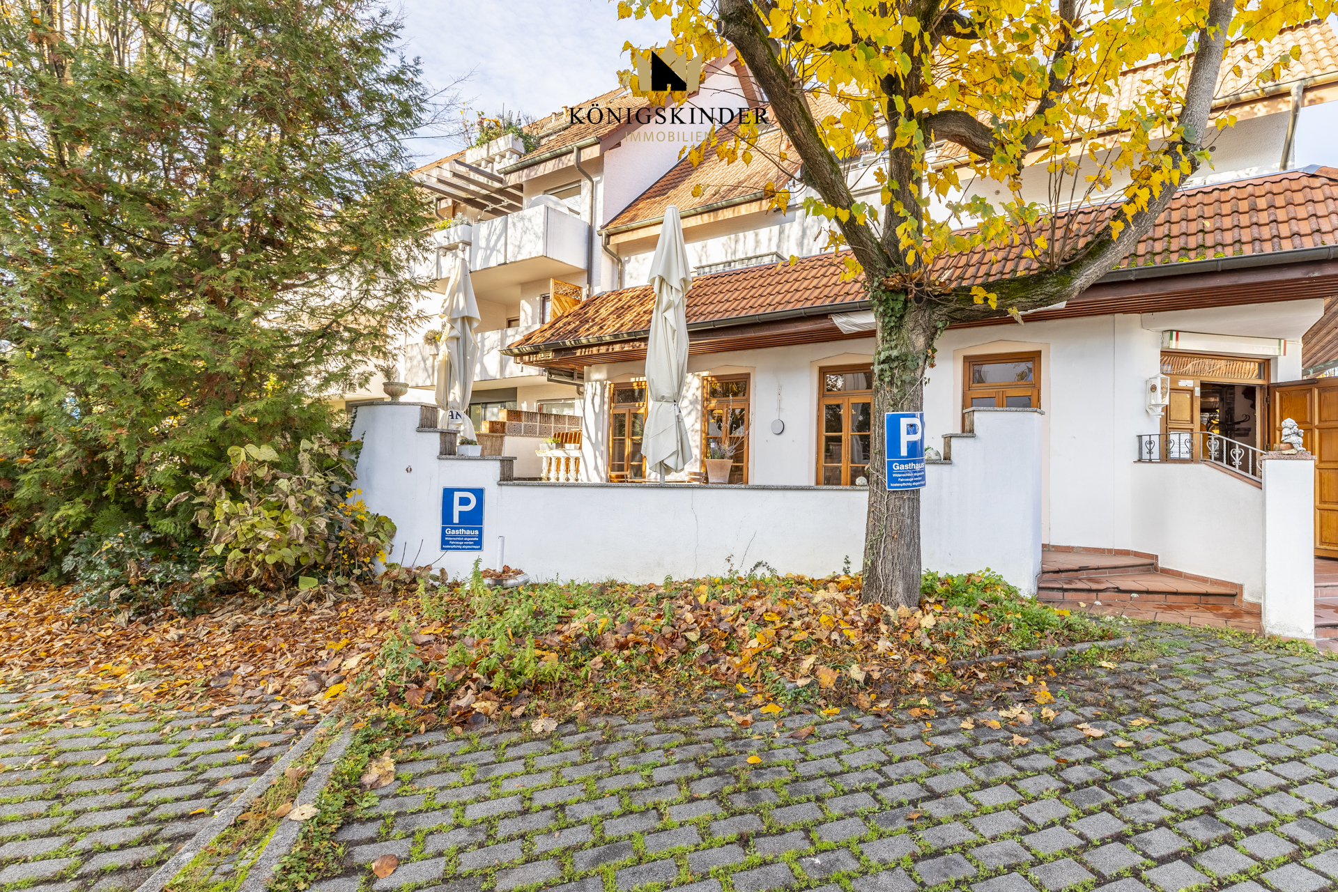 Der Eingangsbereich sowie die gesamte Fassade wirken gepflegt und einladend. Ein schön angelegter Außenbereich mit Bäumen und Sitzmöglichkeiten schafft ein attraktives Ambiente für Gäste – sowohl tagsüber als auch am Abend.