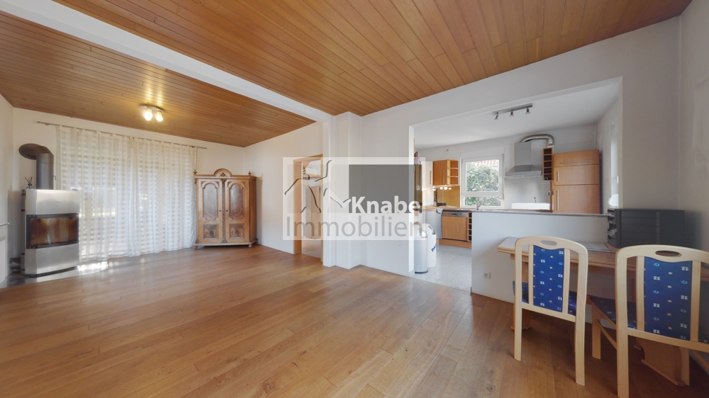 Im Inneren des Hauses entfaltet sich eine wohnliche Atmosphäre, die zum Ankommen und Wohlfühlen einlädt. Das großzügige Wohn- und Esszimmer mit dem gemütlichen Kamin wird schnell zum Mittelpunkt des Familienlebens. Durch die wintergartenähnliche Terrasse erweitert sich der Wohnbereich in den Garten – perfekt für gemeinsame Mahlzeiten, Kindergeburtstage oder entspannte Abende im Freien. Die offene Küche, durch eine Theke geschickt abgegrenzt, sorgt für kurze Wege und viel Nähe im Familienalltag.