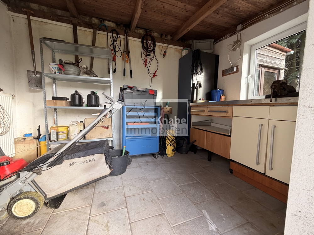 Ein echtes Highlight dieses familienfreundlichen Zuhauses ist der großzügige Garten. Mit gewachsener Bepflanzung, gepflegtem Grün, Gartenhaus und Teich entsteht hier ein Rückzugsort für Groß und Klein. Kinder finden Raum zum Toben, Erwachsene einen Ort für Ruhe, Hobbyarbeit oder gesellige Runden. Zusätzlicher Stau- und Werkraum in Form einer von außen begehbaren Werkstatt macht das Angebot perfekt. Zwei bis drei Stellplätze stehen auf dem Hof zur Verfügung.
