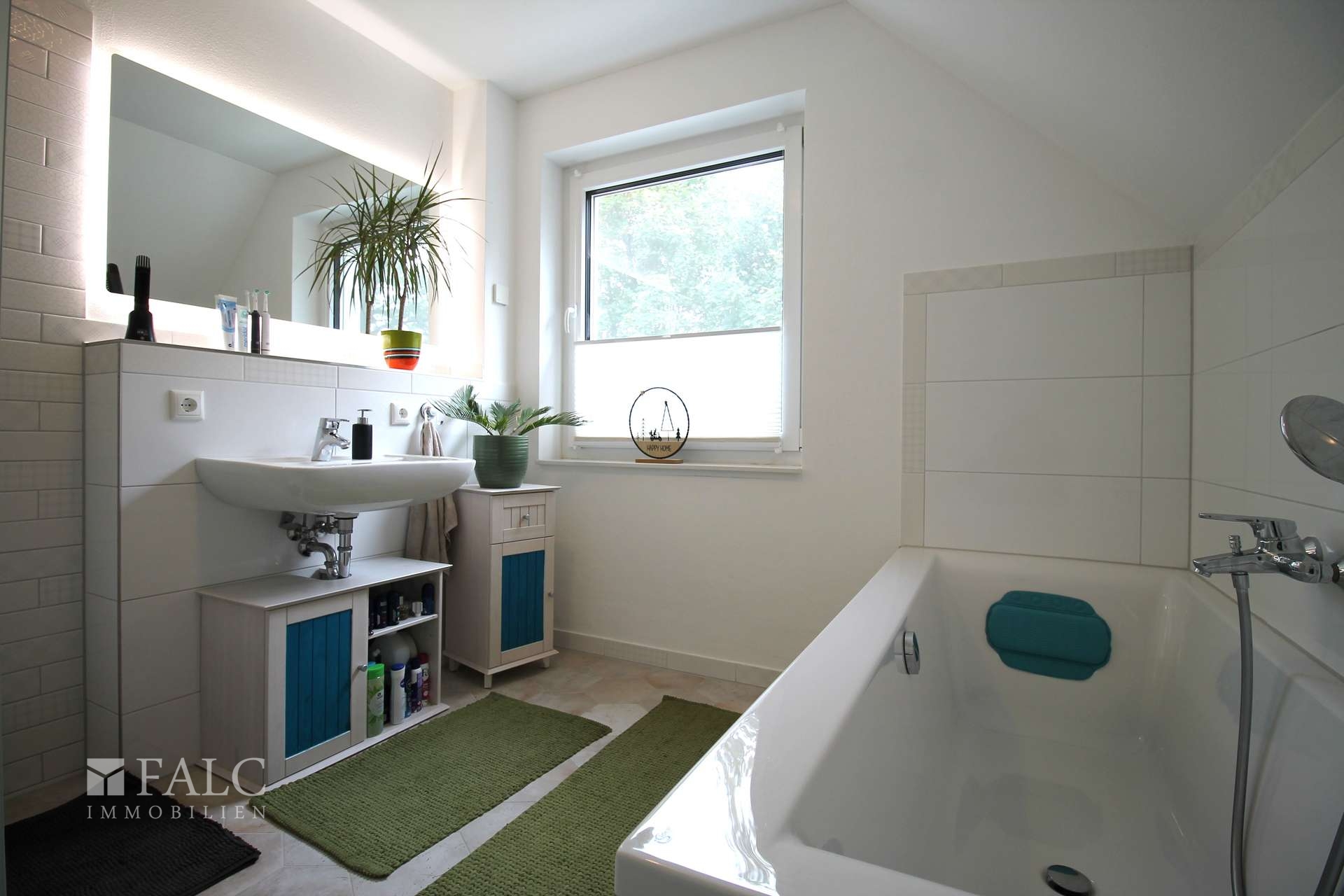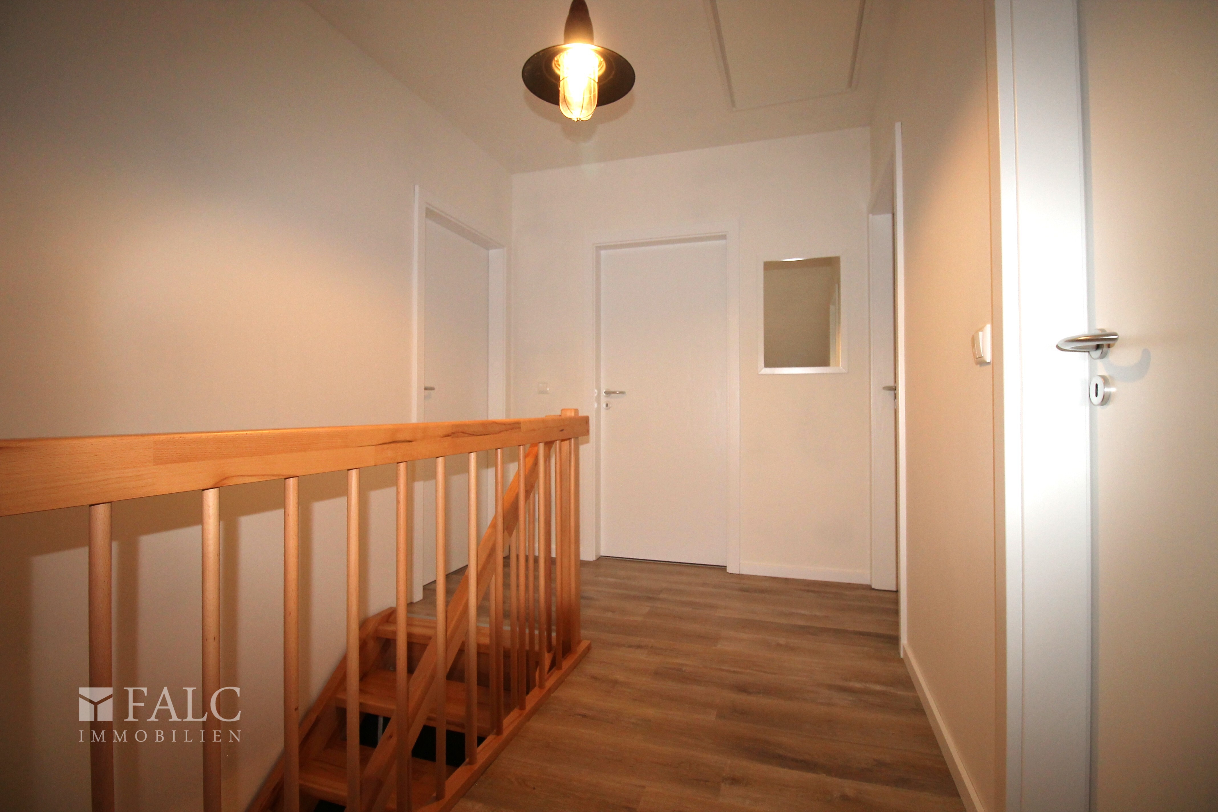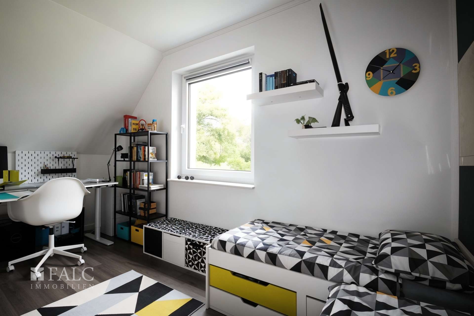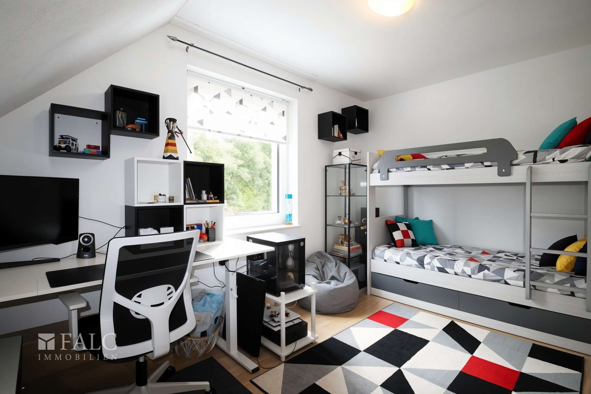 Im Obergeschoss befinden sich drei Schlafzimmer, die individuell genutzt werden können. Zwei Kinderzimmer bieten ausreichend Platz für Spiel und Lernen, während das Hauptschlafzimmer eine ruhige Rückzugsmöglichkeit darstellt. Das Badezimmer auf dieser Etage ist mit einer Badewanne und einer separaten Dusche ausgestattet, zudem in einem zeitlosen Design.