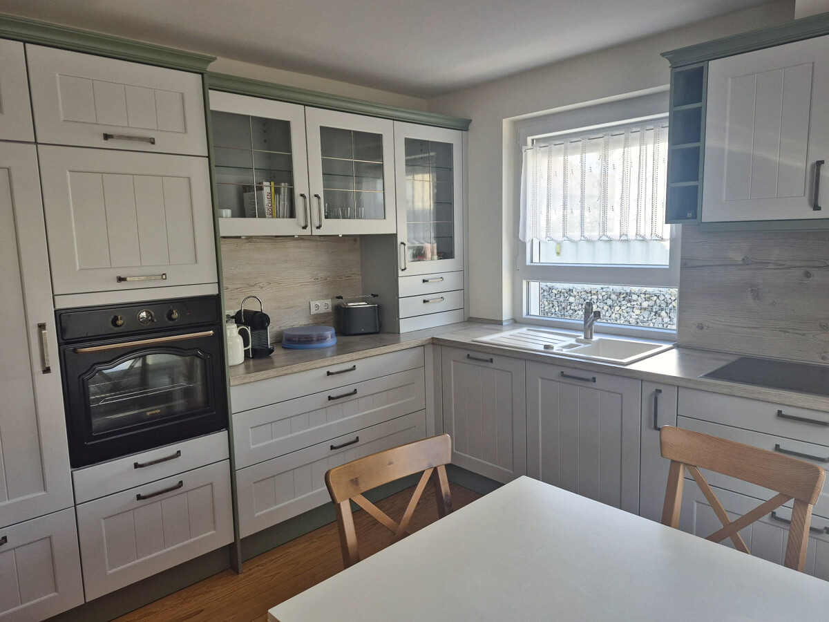 Vom Wohnzimmer aus gelangen Sie in die angrenzende Küche, die funktional und modern ausgestattet ist. Hier finden Sie genügend Raum für einen Esstisch, an dem die Familie gemeinsam die Mahlzeiten genießen kann. Die Küche ist der ideale Ort, um kulinarische Köstlichkeiten zuzubereiten und bietet einen schönen Ausblick in den Garten.
