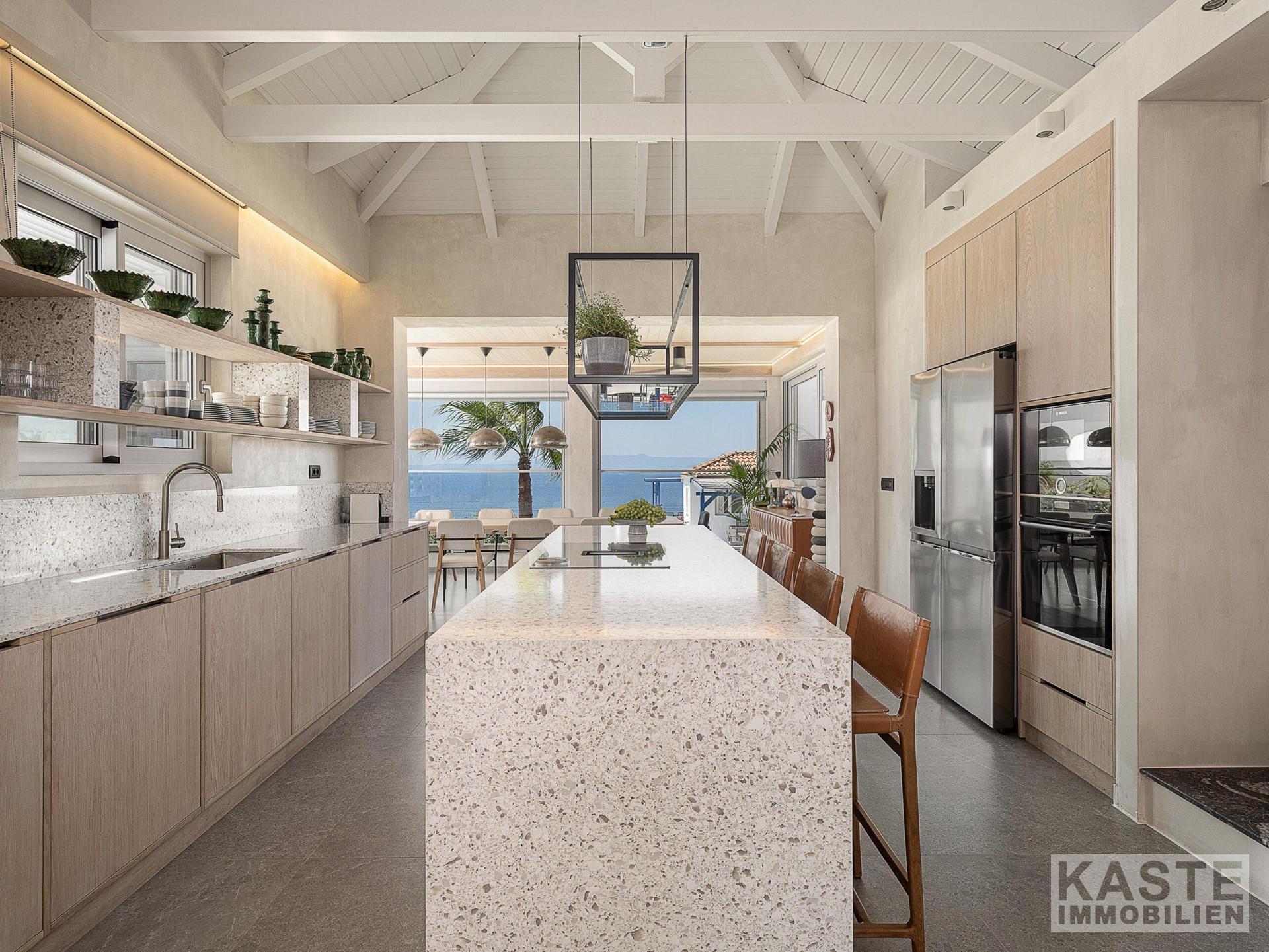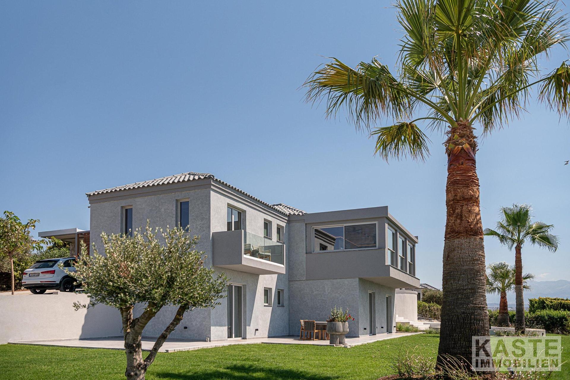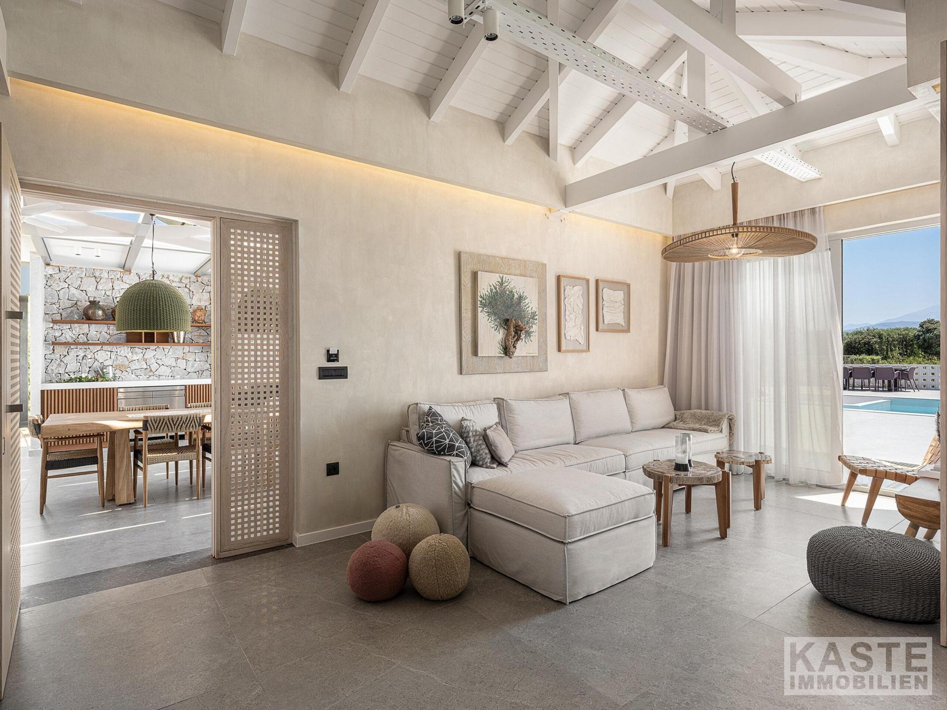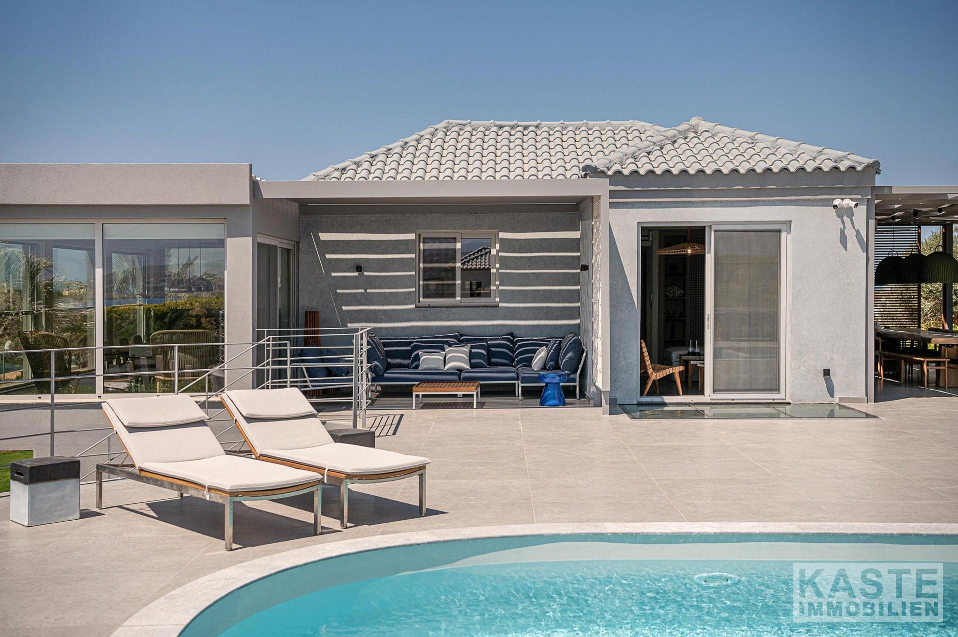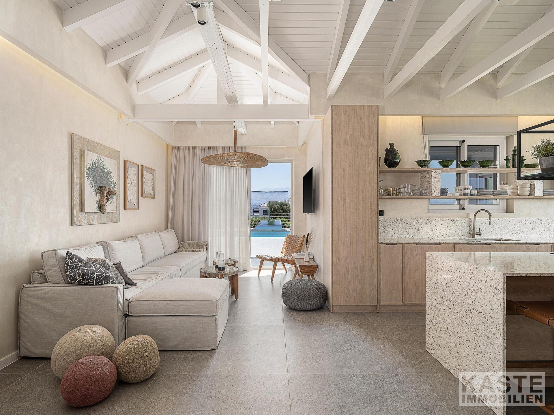 Diese hochwertige Villa in Tersanas, Akrotiri, nahe Chania auf Kreta, verkörpert mediterranen Luxus mit unvergleichlichem Charme. Das Anwesen befindet sich auf einem großzügigen 2.000 m² großen Grundstück und bietet über 200 m² elegant gestaltete Wohnfläche mit atemberaubendem Blick auf das ägäische Meer. Das Haus zeichnet sich durch fünf äußerst komfortable Zimmer aus, darunter vier Schlafzimmer mit jeweils eigenem, modernen Bad, die großzügiges Licht und Raum für Rückzug und Entspannung gewährleisten.