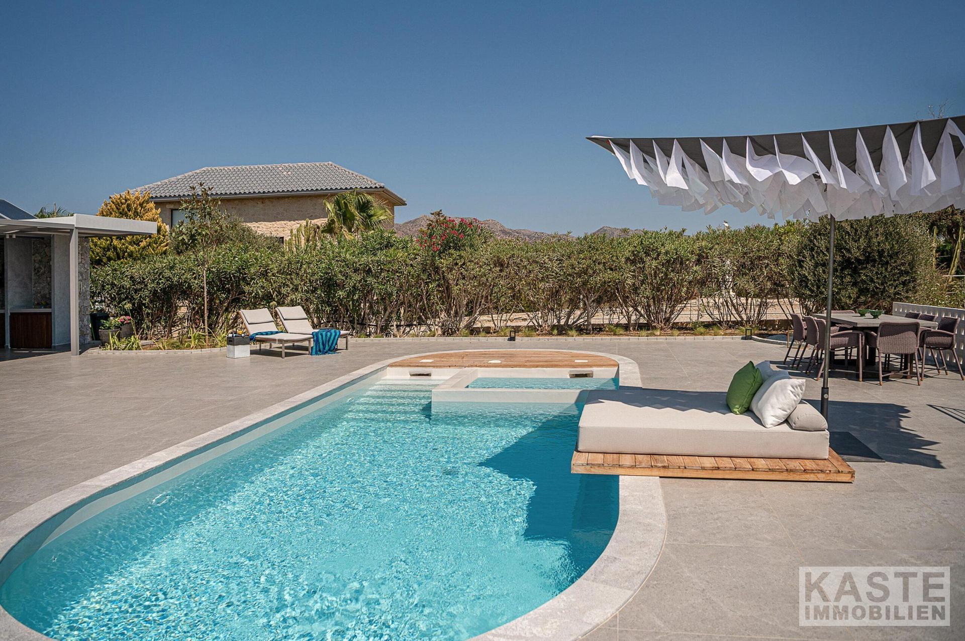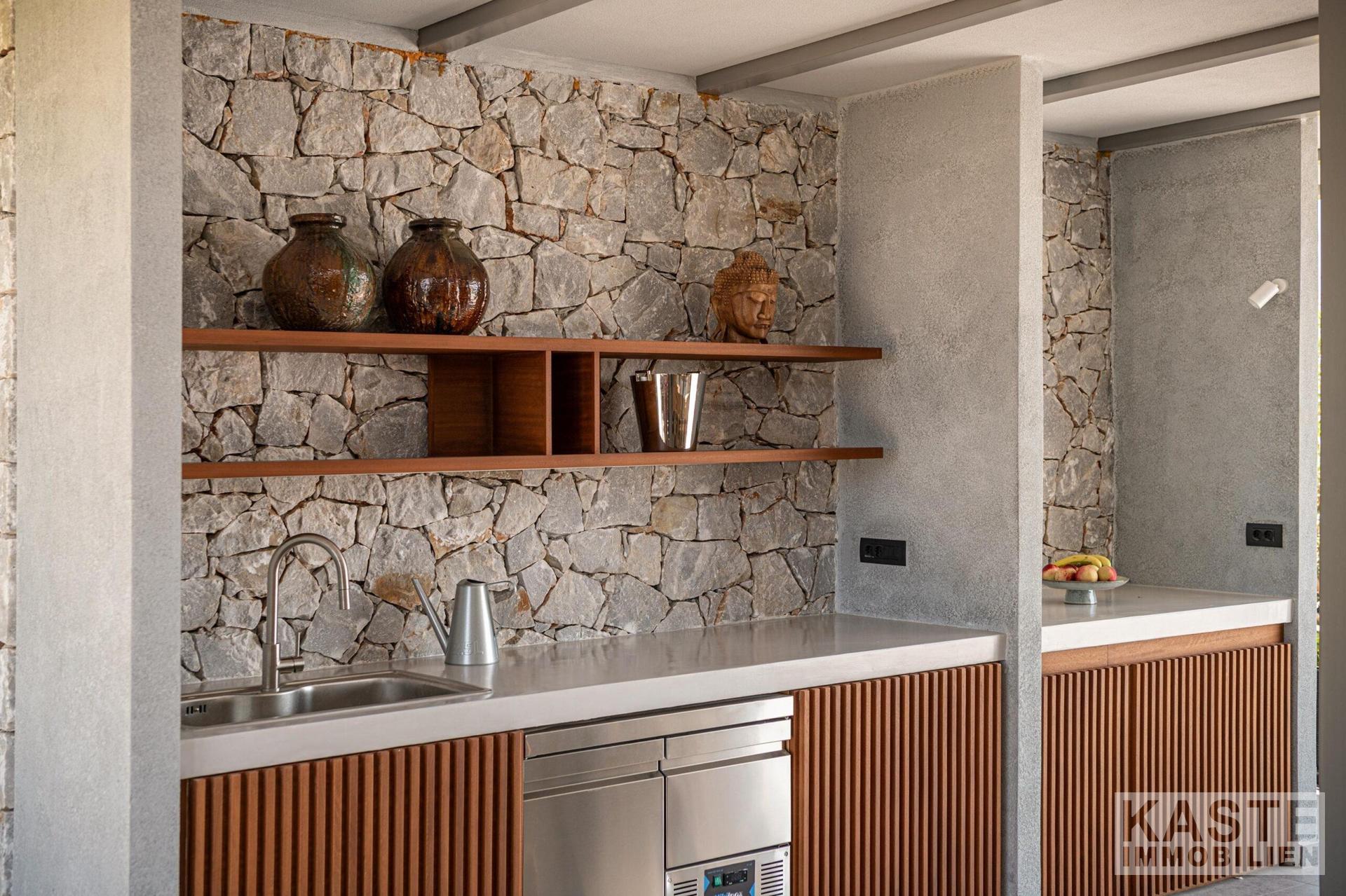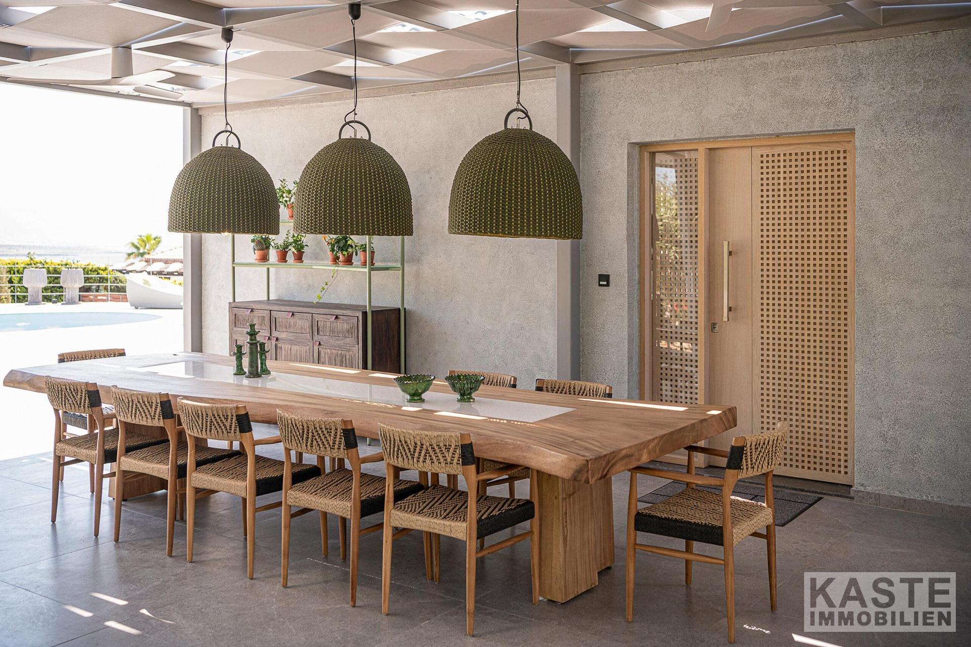 Im Außenbereich setzt sich das exklusive Ambiente mit einem strahlenden Infinity-Pool fort, der sich harmonisch in die gepflegten, voll angelegten Gärten einfügt. Eine überdachte Lounge und ein prachtvoller Gartenkamin schaffen lauschige Plätzchen zum Entspannen und Genießen der spektakulären Sonnenuntergänge über dem Meer. Dafür bietet der vorgelagerte Balkon einen privaten Platz, um diese Naturwunder ungestört zu erleben.