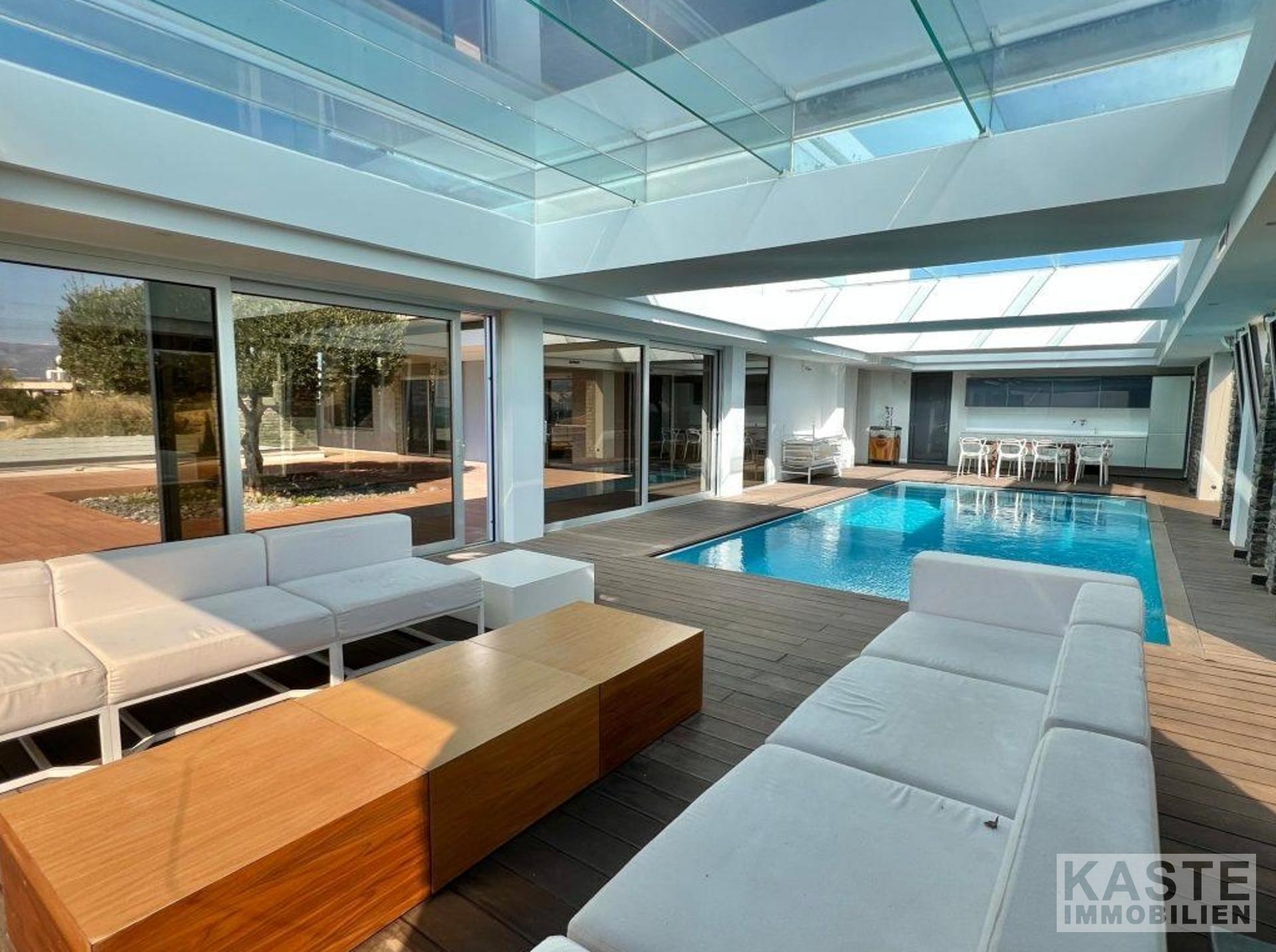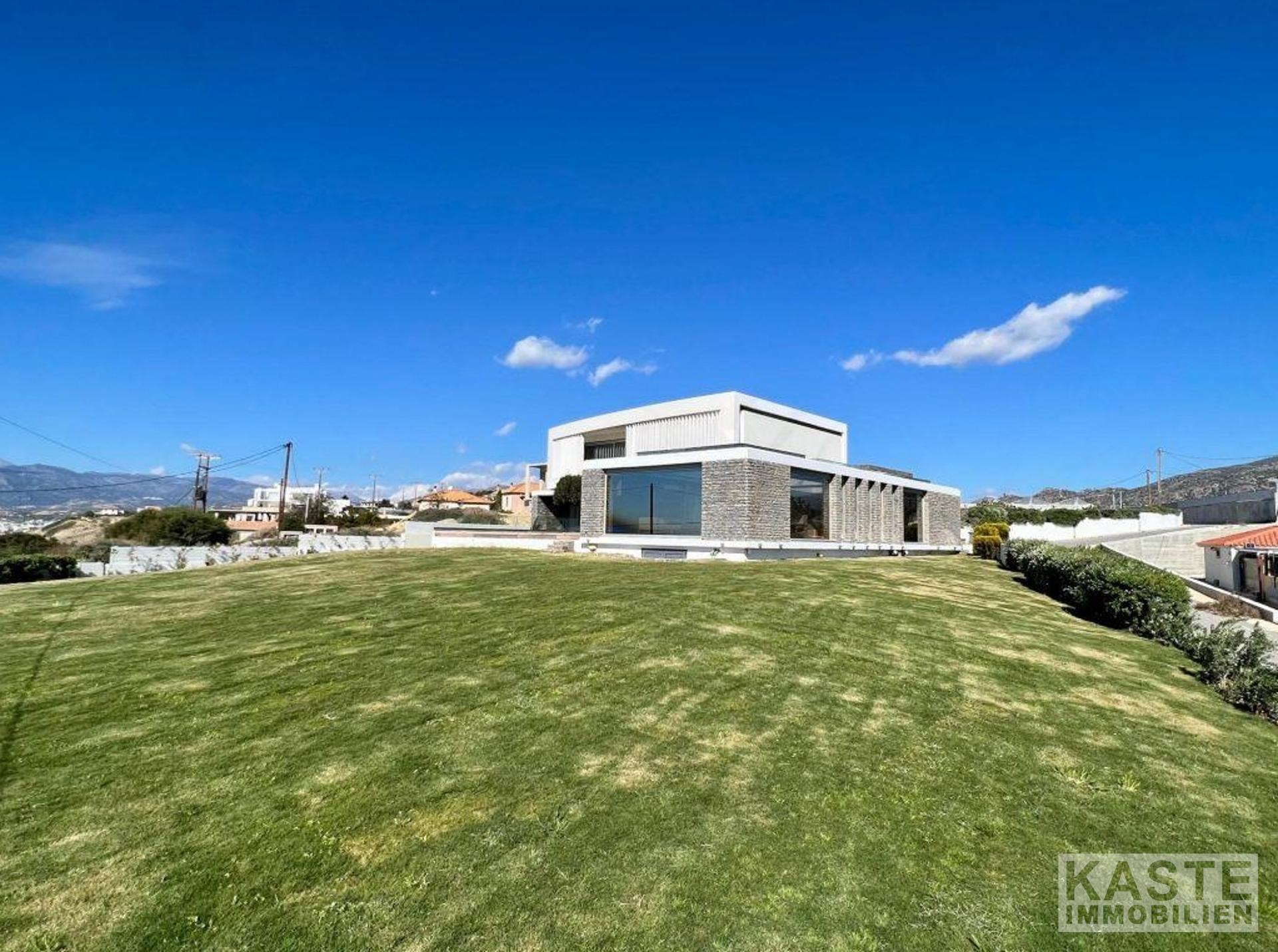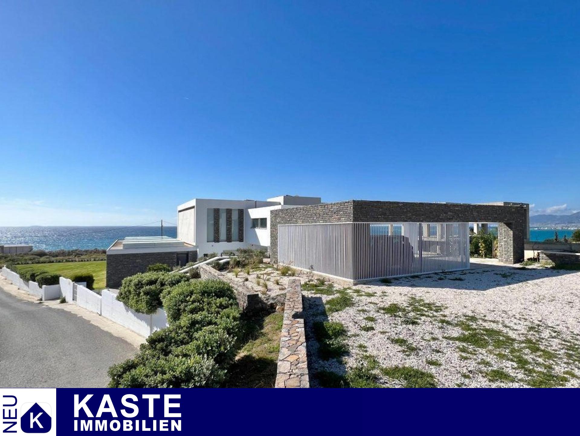 Es handelt sich um eine luxuriöse Villa, die auf einem 3.000m2 großen Grundstück etwa 3 km außerhalb der Stadt Ierapetra an der Straße nach Makrigialos errichtet wurde. Das ebene Grundstück weist eine leichte Neigung nach Süden auf und bietet einen atemberaubenden, ungehinderten Blick auf das Libysche Meer, die Stadt Ierapetra und die Insel Chrissi.