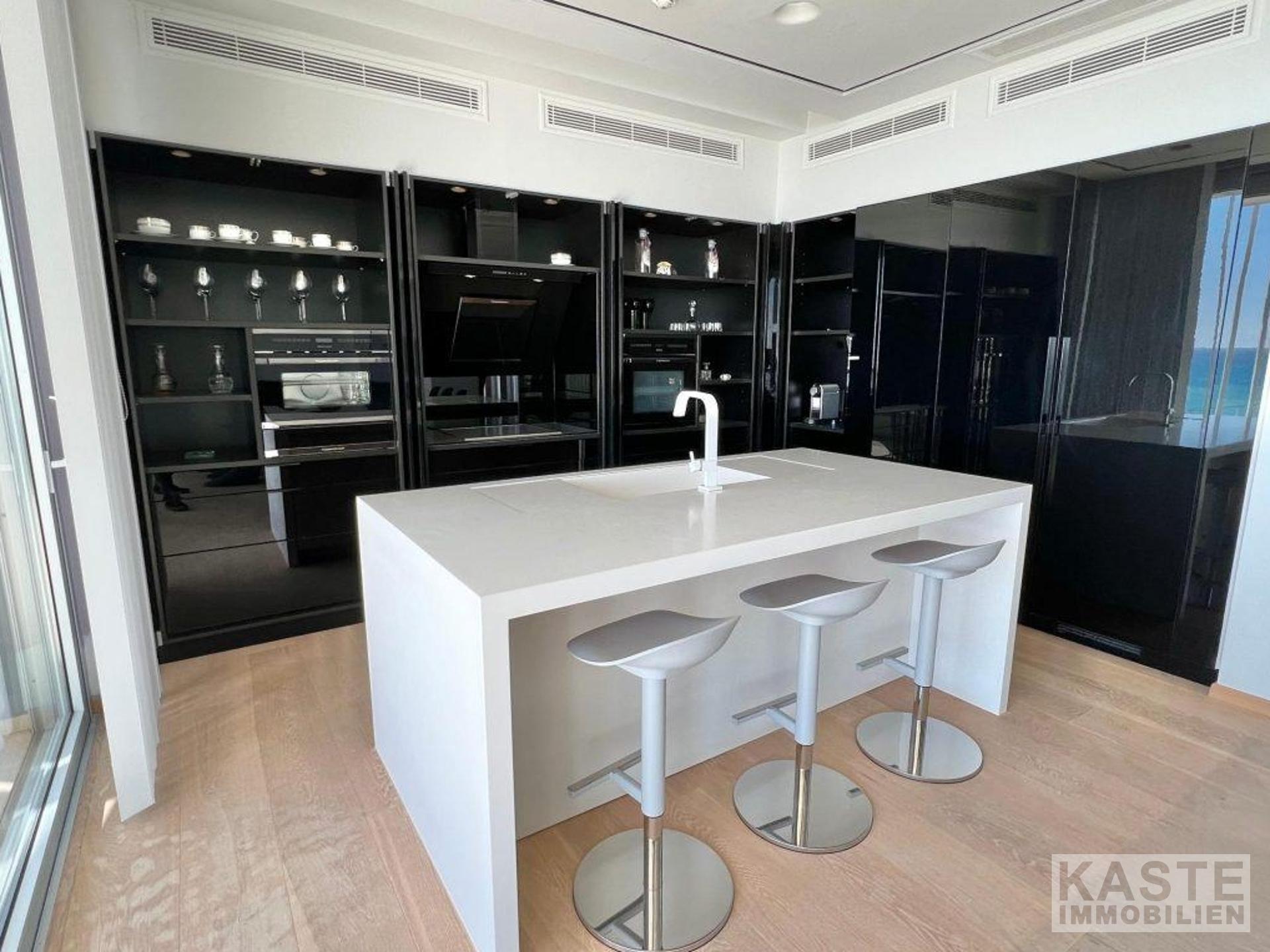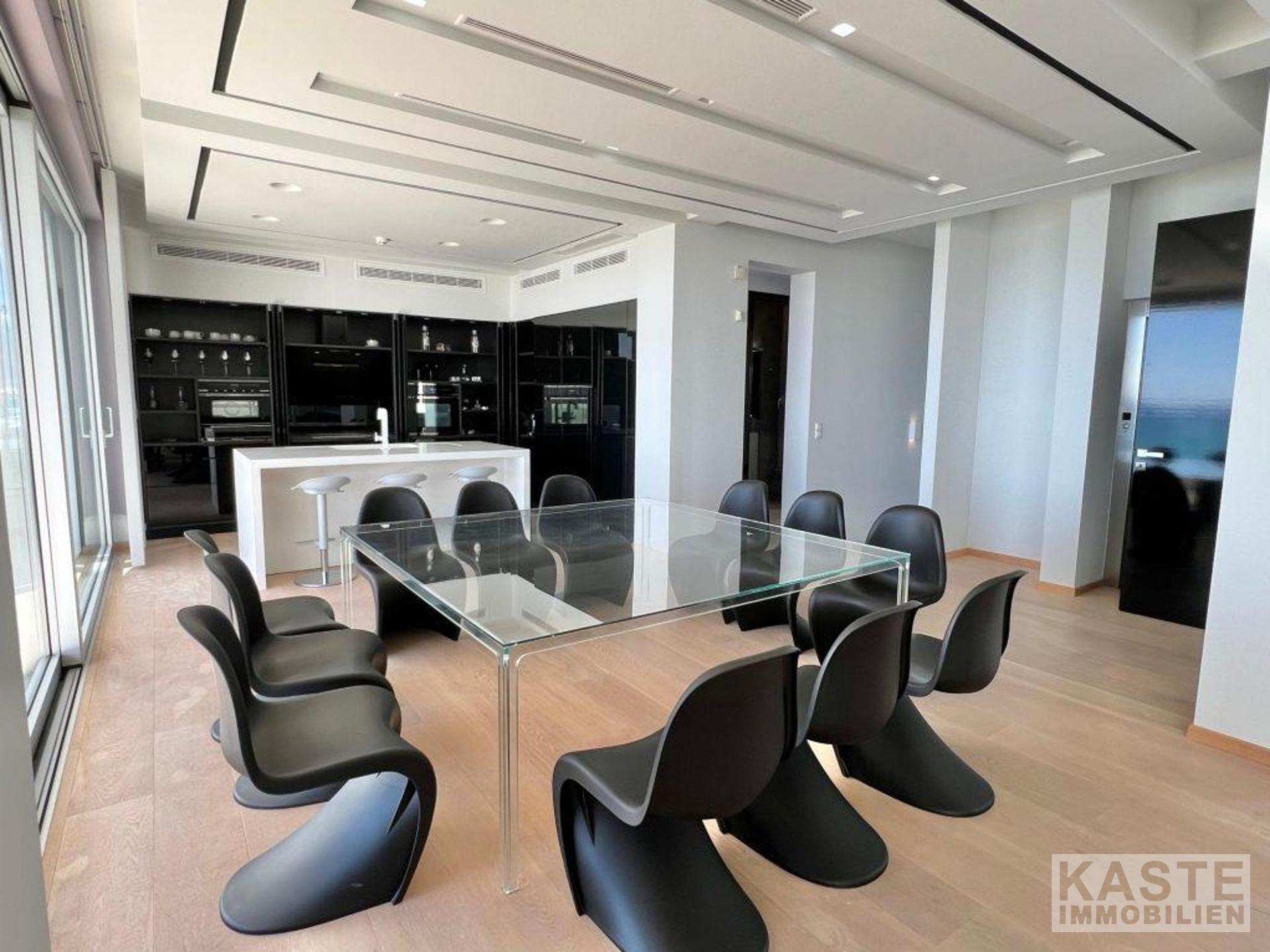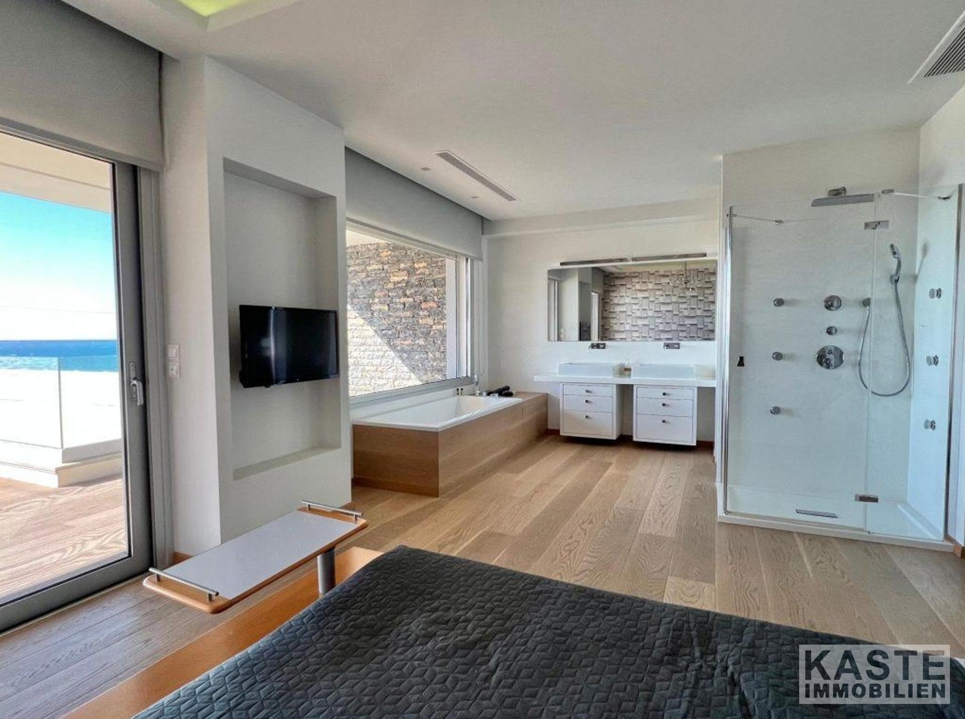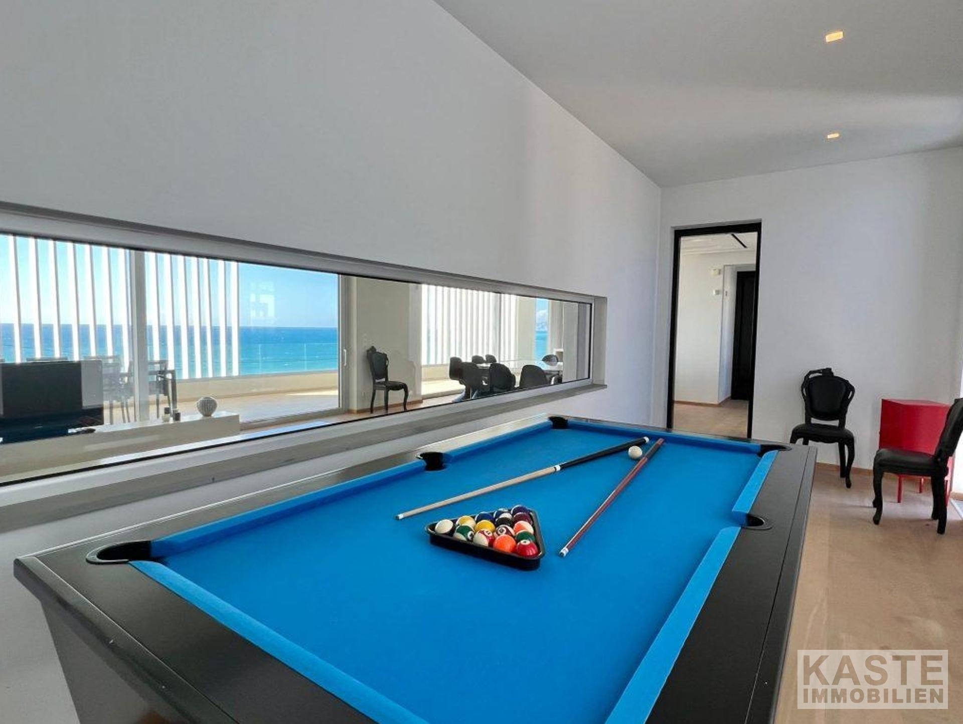 · Interne zentrale Eingangsbrücke und interne Holztreppe zum Keller · Aufzug mit Zugang zum Untergeschoss · Großes Wohnzimmer · Küche mit hochwertiger Ausstattung, grifflosen Schränken und einer einzigartigen Insel, die elegant durch ausziehbare Paneele versteckt werden kann · Balkon-Terrasse (25m²) mit unverbautem Blick auf das Libysche Meer, geschützt durch Fensterläden aus Teakholz · W/C mit schwarzen Glaswänden vom Boden bis zur Decke · Klimaanlage in allen Zimmern mit voller Autonomie