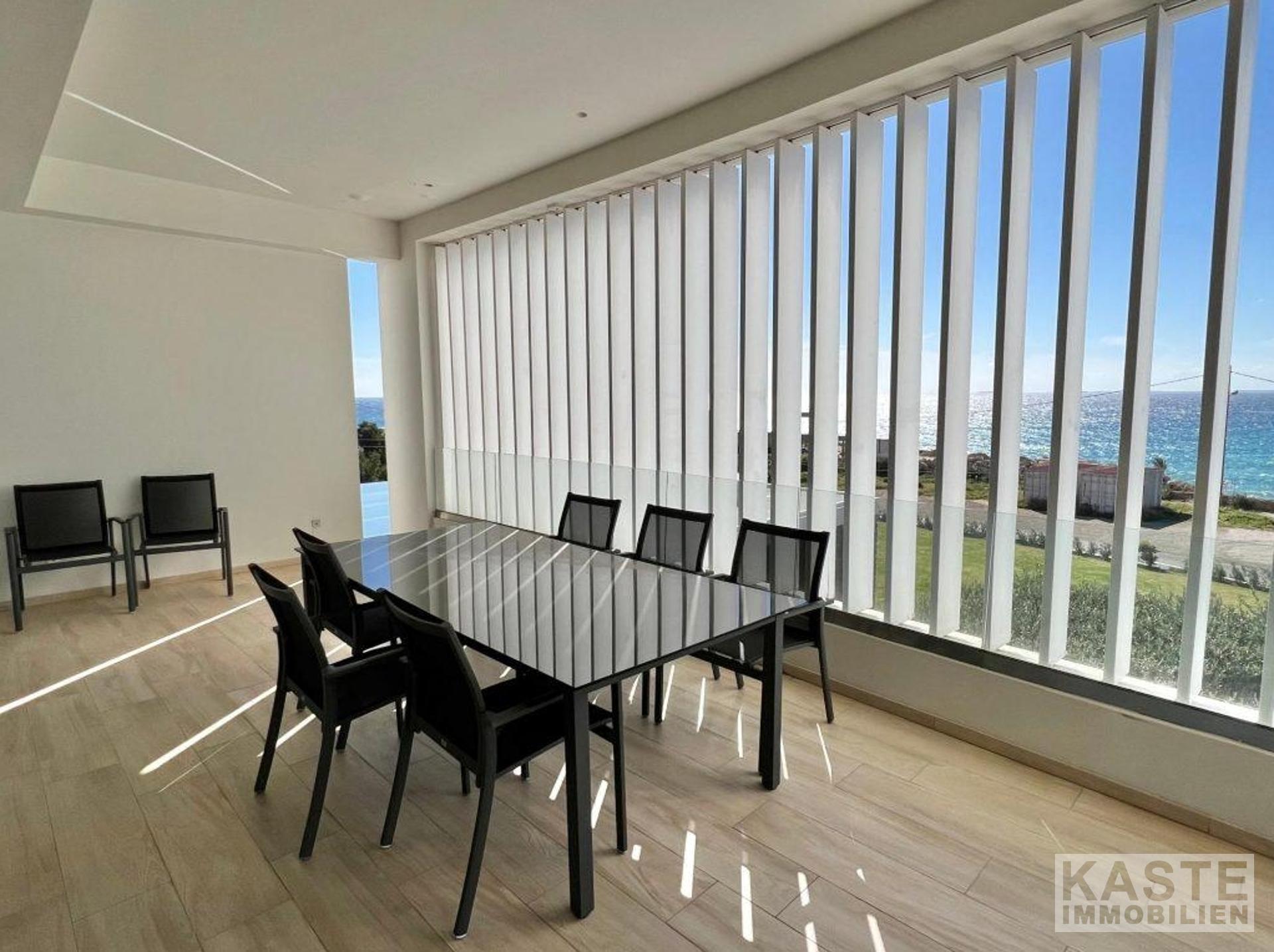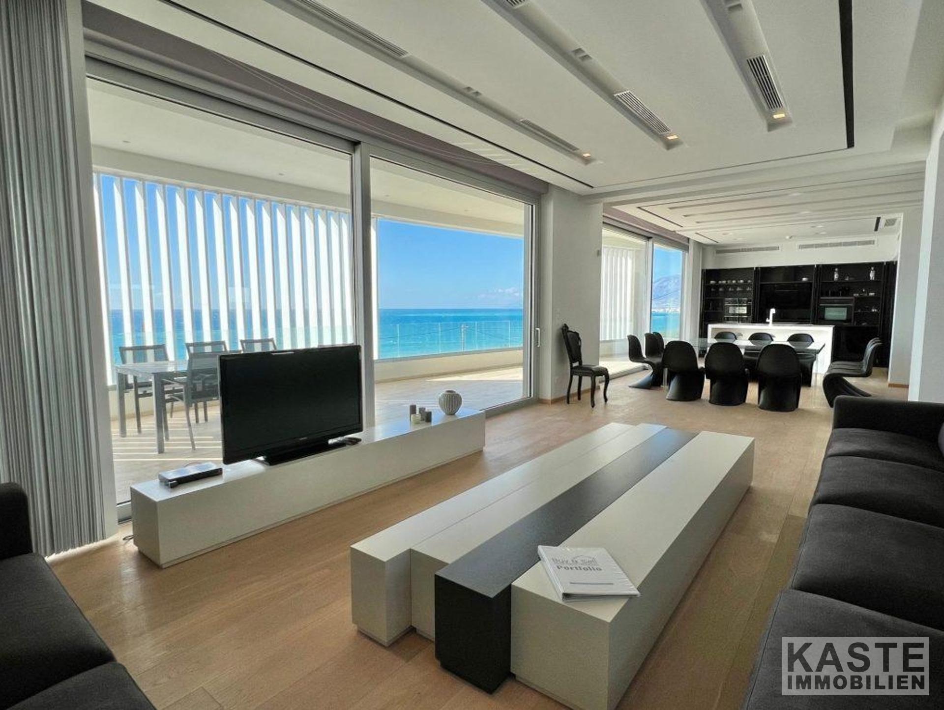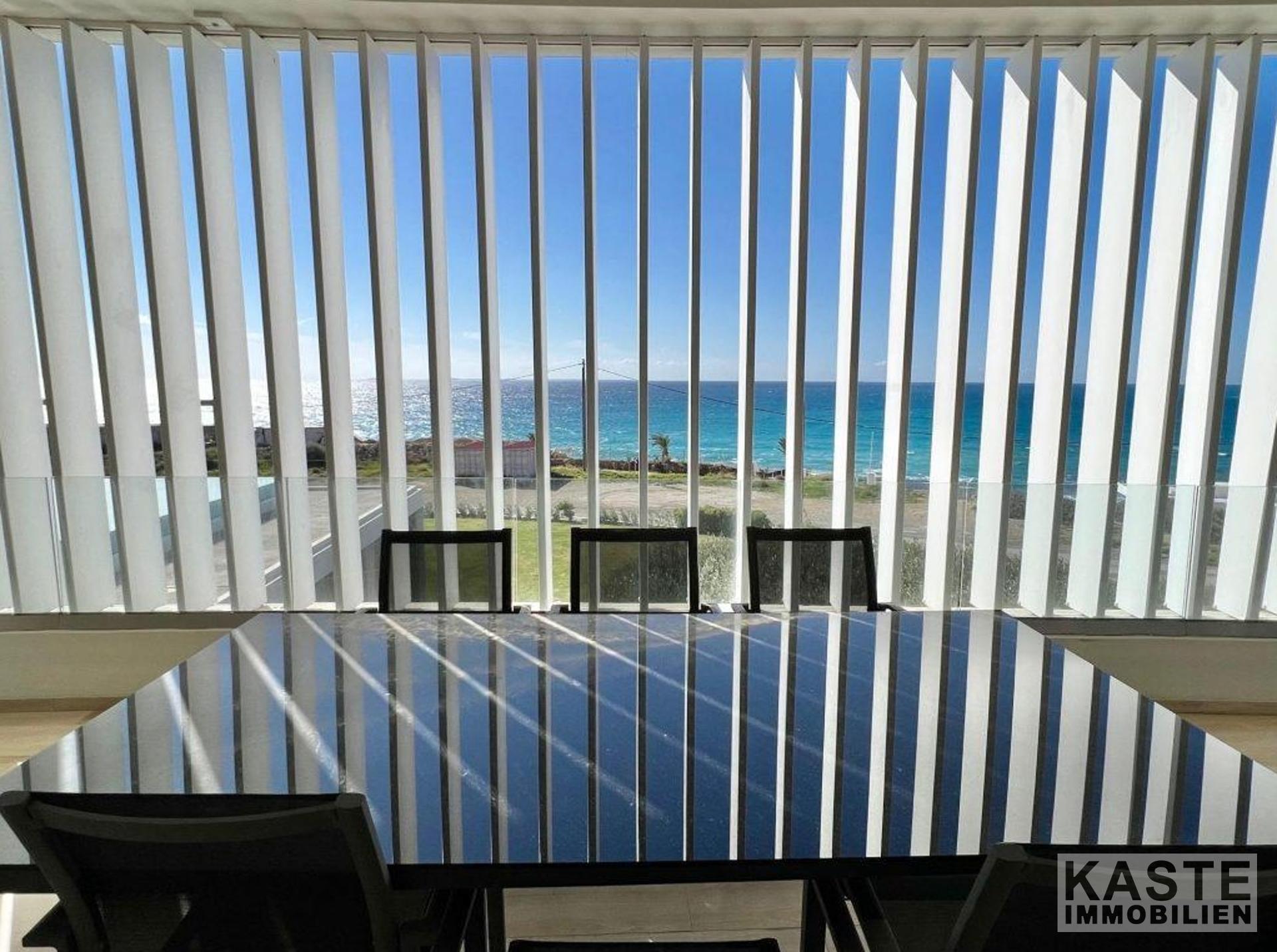 · Interne zentrale Eingangsbrücke und interne Holztreppe zum Keller · Aufzug mit Zugang zum Untergeschoss · Großes Wohnzimmer · Küche mit hochwertiger Ausstattung, grifflosen Schränken und einer einzigartigen Insel, die elegant durch ausziehbare Paneele versteckt werden kann · Balkon-Terrasse (25m²) mit unverbautem Blick auf das Libysche Meer, geschützt durch Fensterläden aus Teakholz · W/C mit schwarzen Glaswänden vom Boden bis zur Decke · Klimaanlage in allen Zimmern mit voller Autonomie