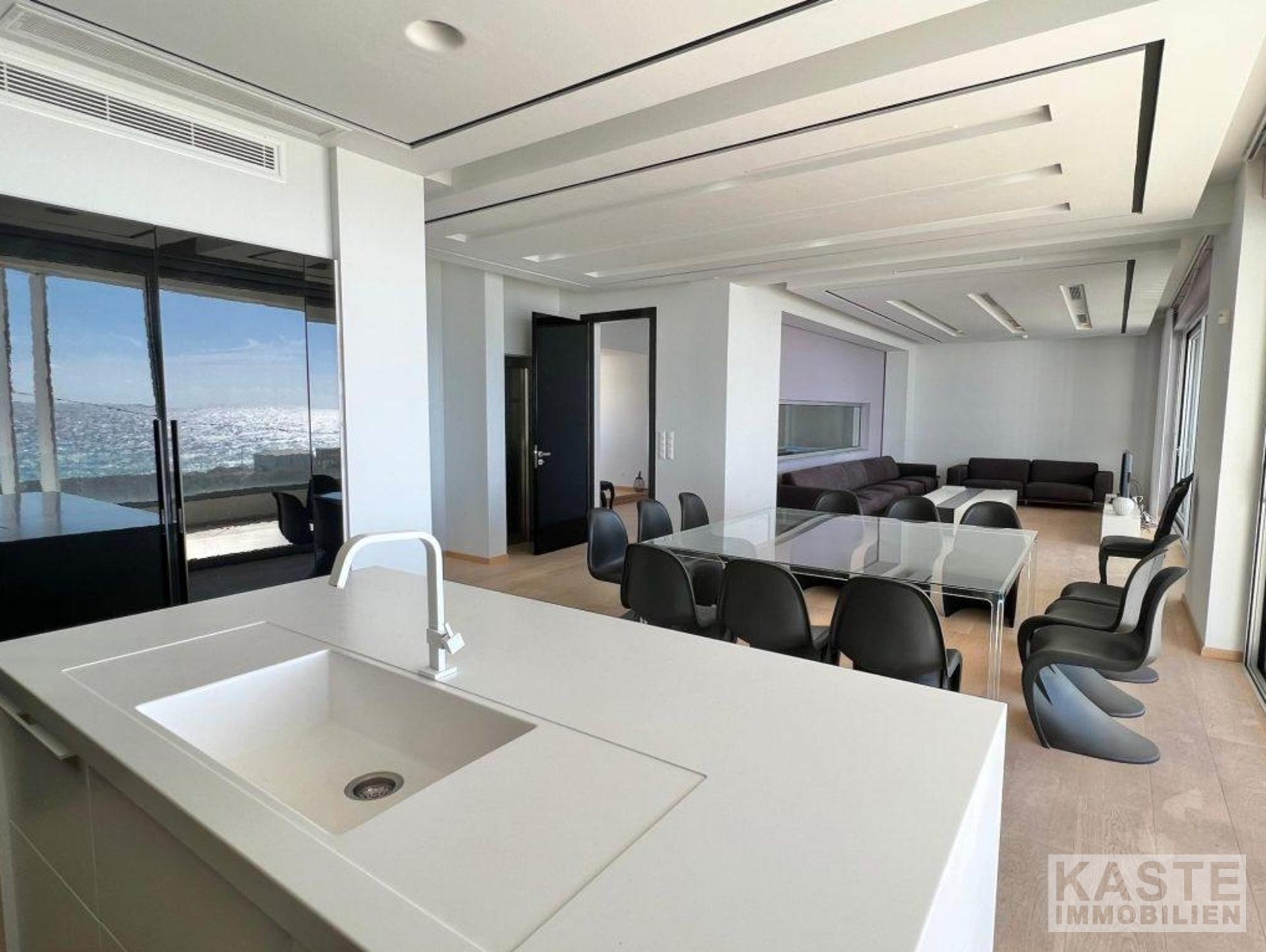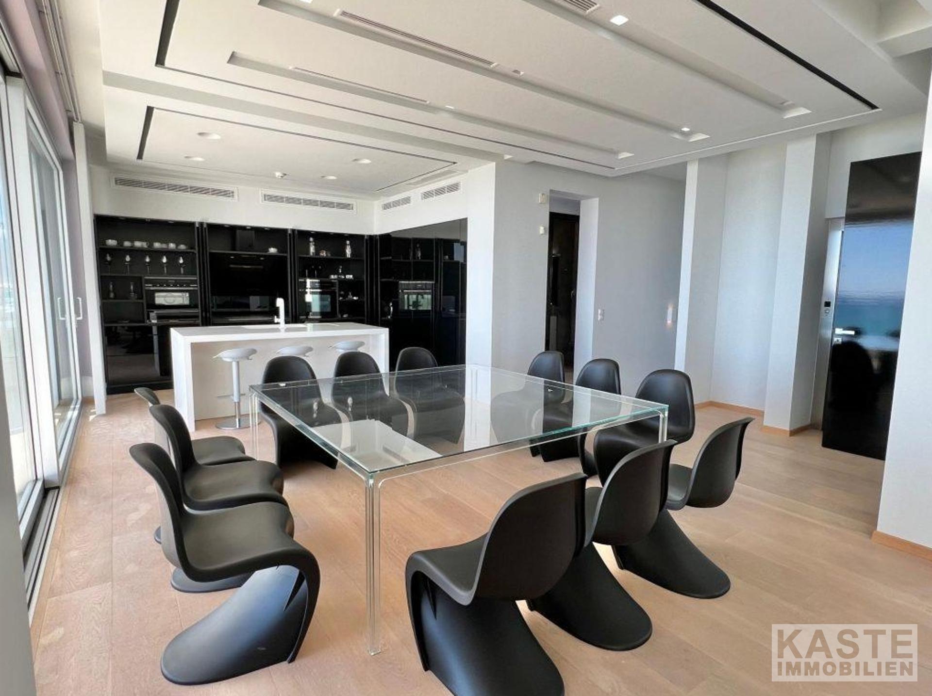 · Interne zentrale Eingangsbrücke und interne Holztreppe zum Keller · Aufzug mit Zugang zum Untergeschoss · Großes Wohnzimmer · Küche mit hochwertiger Ausstattung, grifflosen Schränken und einer einzigartigen Insel, die elegant durch ausziehbare Paneele versteckt werden kann · Balkon-Terrasse (25m²) mit unverbautem Blick auf das Libysche Meer, geschützt durch Fensterläden aus Teakholz · W/C mit schwarzen Glaswänden vom Boden bis zur Decke · Klimaanlage in allen Zimmern mit voller Autonomie