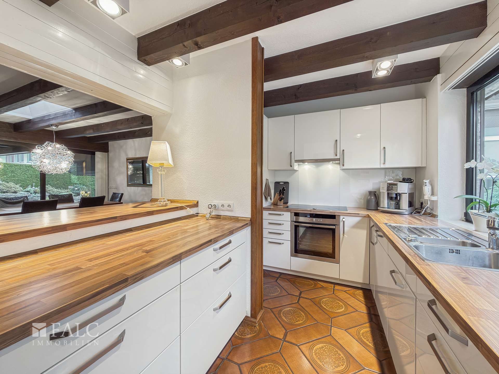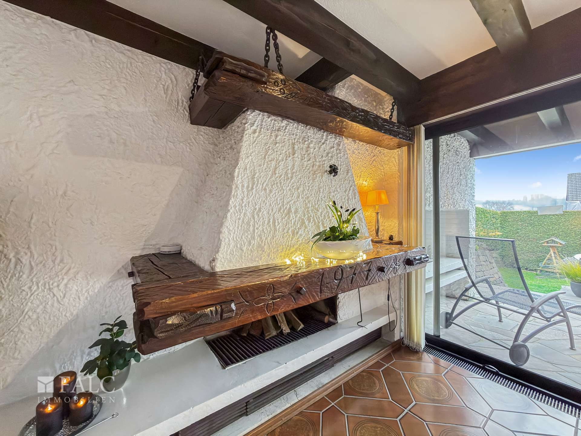 Der Wohnbereich ist offen gestaltet und dennoch klar in funktionale Zonen gegliedert. Die gemütliche Wohnecke wird von einem charaktervollen Kamin geprägt, während der angrenzende Essbereich über eine großzügige Durchreiche direkt mit der modernen Küche verbunden ist. Bodentiefe Fenster und Terrassentüren lassen viel Tageslicht in die Räume und geben den Blick auf die eigene kleine Wohlfühloase frei, den Garten mit Südwestterrasse. Zusätzlich sorgen Oberlichter im Flachdach, welches im Jahr 2006 saniert wurde, für weitere Lichtquellen und ein freundliches, offenes Raumgefühl. Besonders charmant wirken die sichtbaren Holzbalken an den Decken, die einen warmen und gemütlichen Akzent setzen und dem Bungalow zusätzlichen Charakter verleihen.