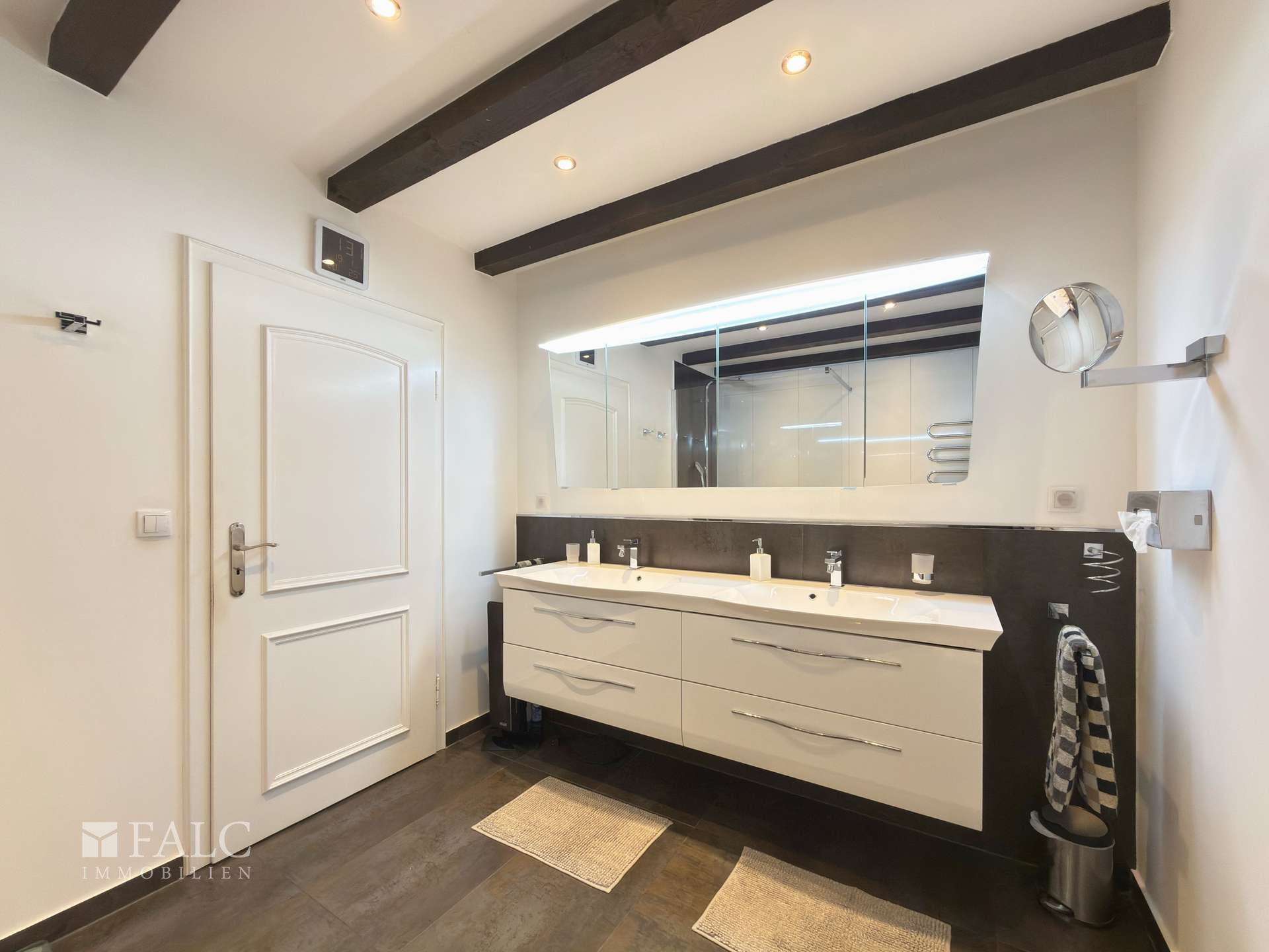 Ein separater Dielenbereich führt in die privaten Räume des Hauses. Hier befinden sich das im Jahr 2014 modernisierte Tageslichtbad mit Walk-in-Dusche, ein Büro oder Kinderzimmer sowie das Schlafzimmer. Dieses überzeugt ebenfalls durch bodentiefe Fenster und direktem Zugang zur Terrasse. Ein idealer Rückzugsort, der durch die Helligkeit, den Blick in den Garten und die harmonische Raumaufteilung besonders einladend wirkt.