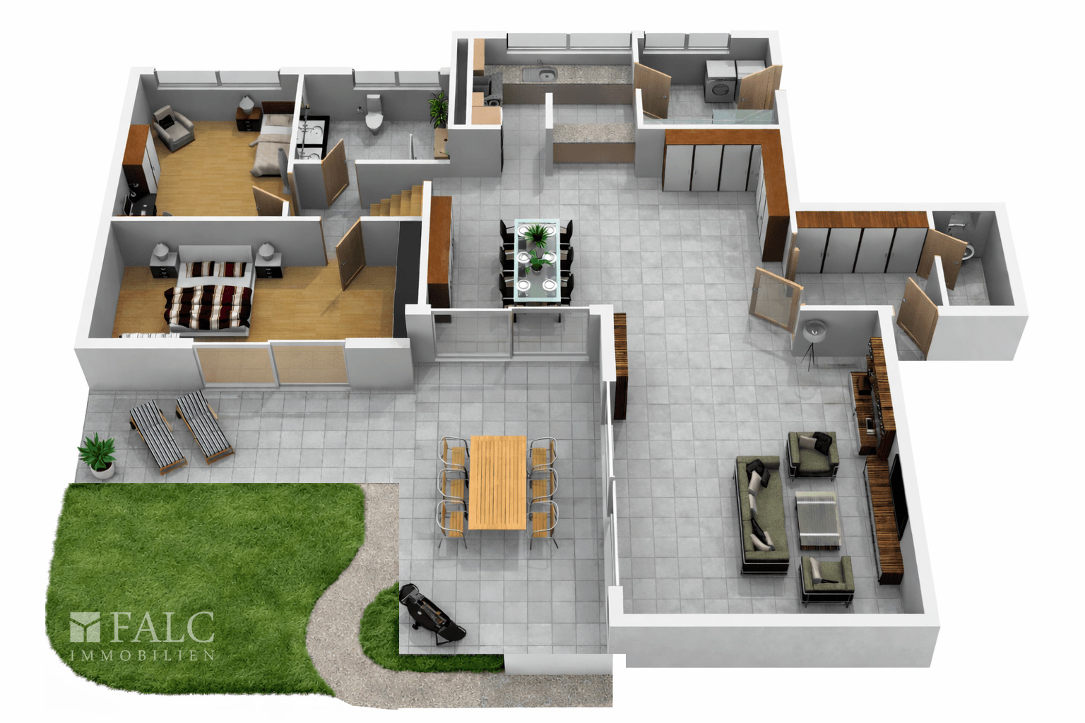 Der Gartenbereich bietet ideale Voraussetzungen für entspannte Stunden im Freien. Zwei überdachte Terrassen laden zum Verweilen ein, während ein Außenkamin gleichzeitig als Grill für gesellige Abende genutzt werden kann. Die Gartenfläche ist pflegeleicht gestaltet und eignet sich hervorragend für alle, die einen eigenen Außenbereich schätzen, ohne viel Zeit in Gartenarbeit investieren zu müssen.