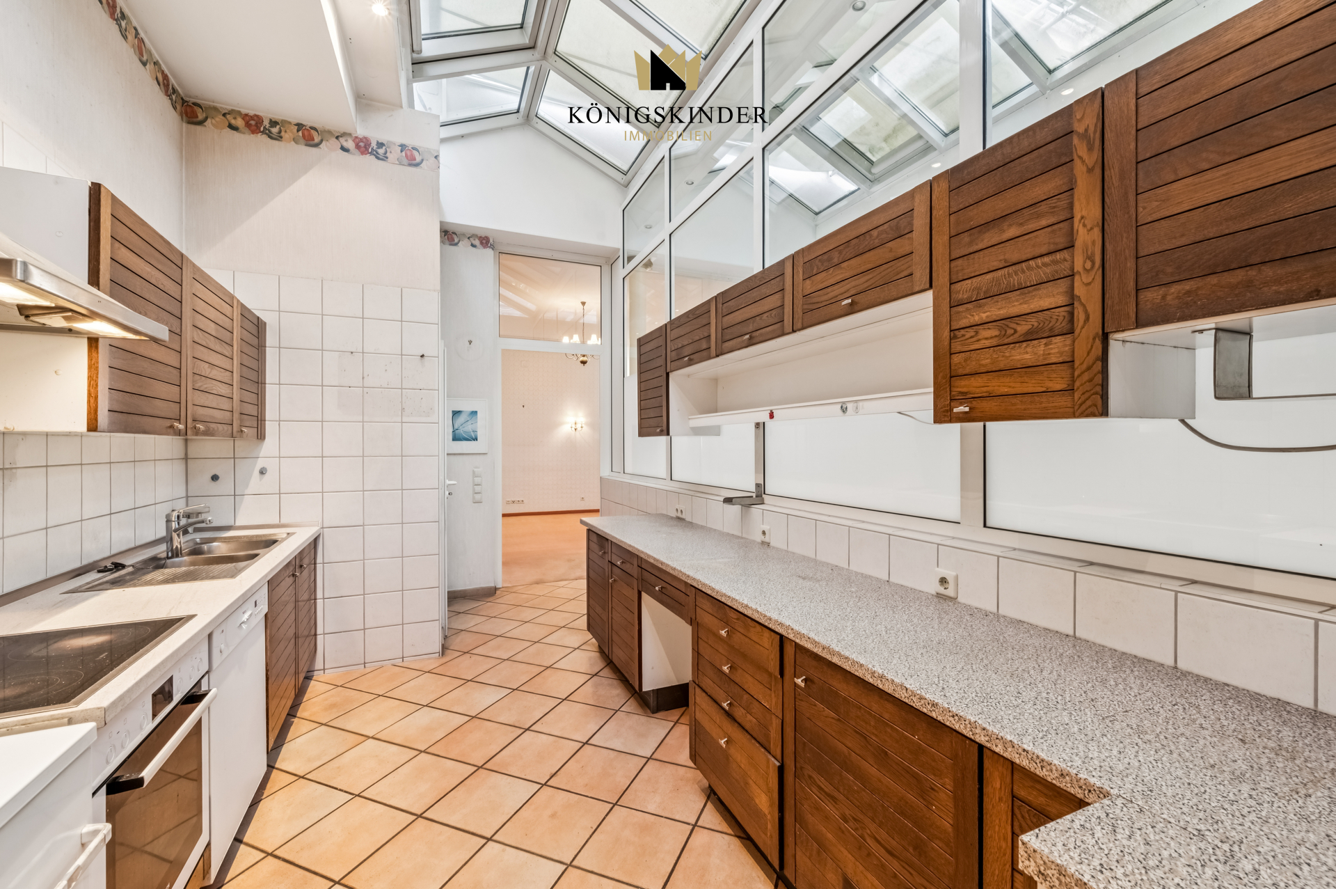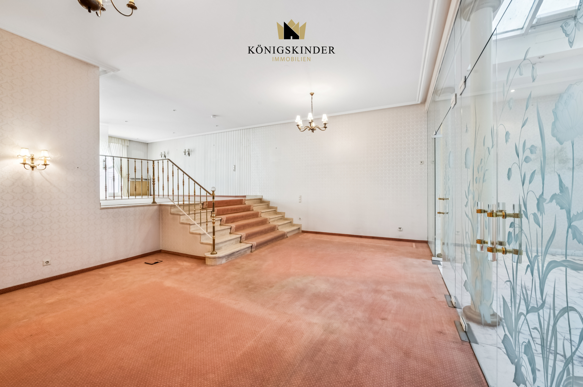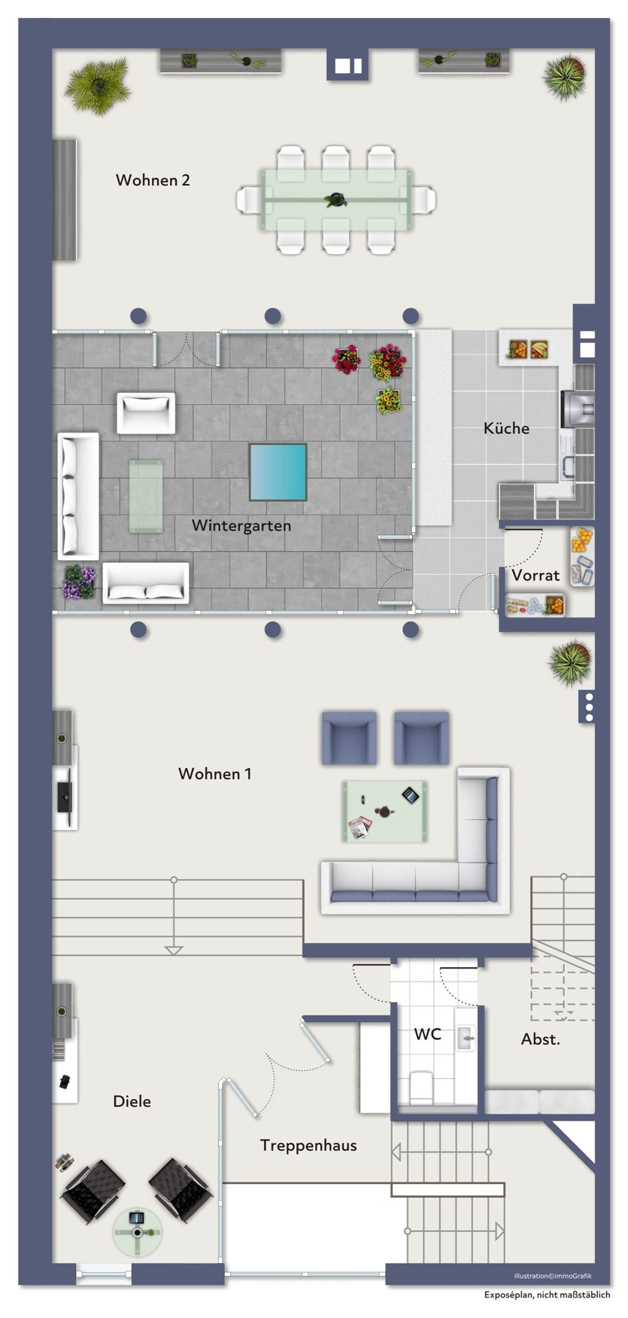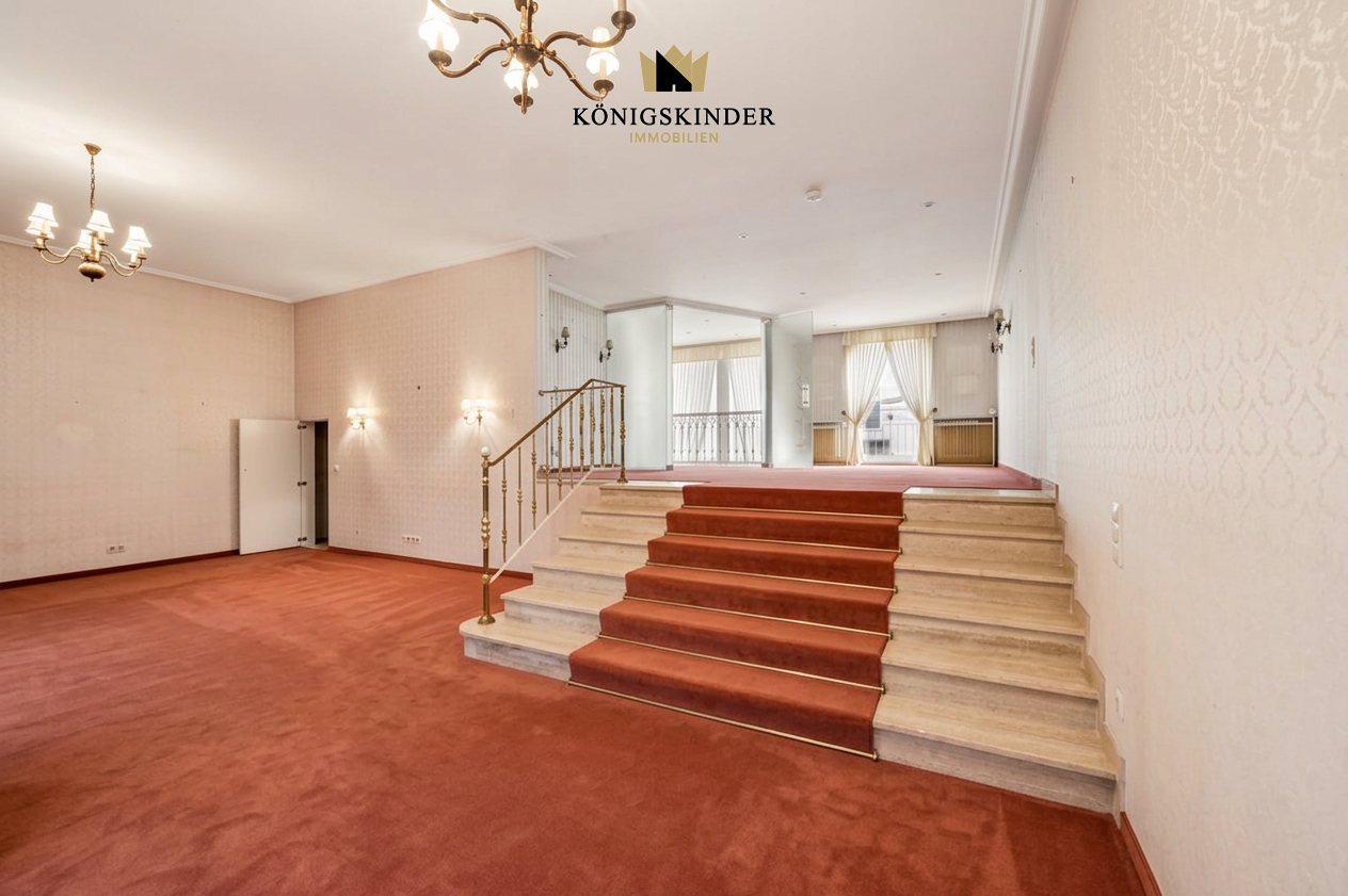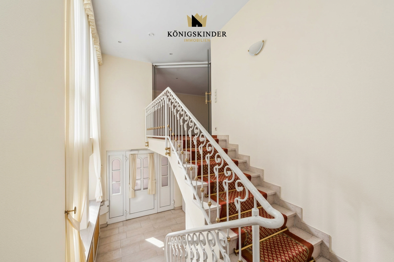 Über eine elegante, geschwungene Treppe gelangen Sie zur Empore, von der sich der Blick in das offene, lichtdurchflutete Wohnzimmer eröffnet. -Das Highlight im Herzen des Hauses bildet der eindrucksvolle Wintergarten – ein Ort voller Licht und Wärme, der Wohnraum und Natur auf besondere Weise verbindet.