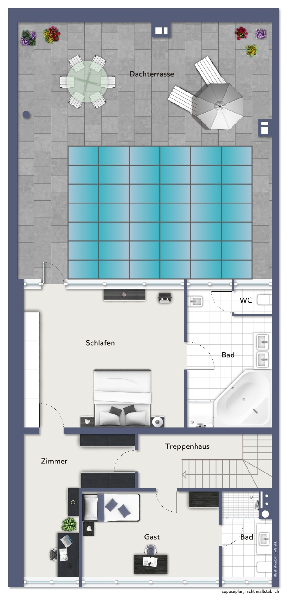 Über eine weitere Treppe erreichen Sie das Obergeschoss. Hier befindet sich das großzügige Schlafzimmer mit direktem Zugang zum modernen Bad, ausgestattet mit Eckwanne, großer Dusche, Doppelwaschbecken und WC. Vom Schlafzimmer aus gelangen Sie auf die sonnige Dachterrasse – eine private Wohlfühloase mitten in der Stadt.