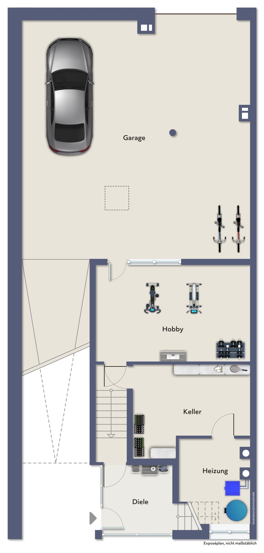 Ein besonderes Highlight ist die hauseigene Tiefgarage mit Platz für mindestens vier Fahrzeuge. Ergänzt wird diese durch einen angrenzenden Kellerraum, einen Hobbyraum sowie eine separate Waschküche.