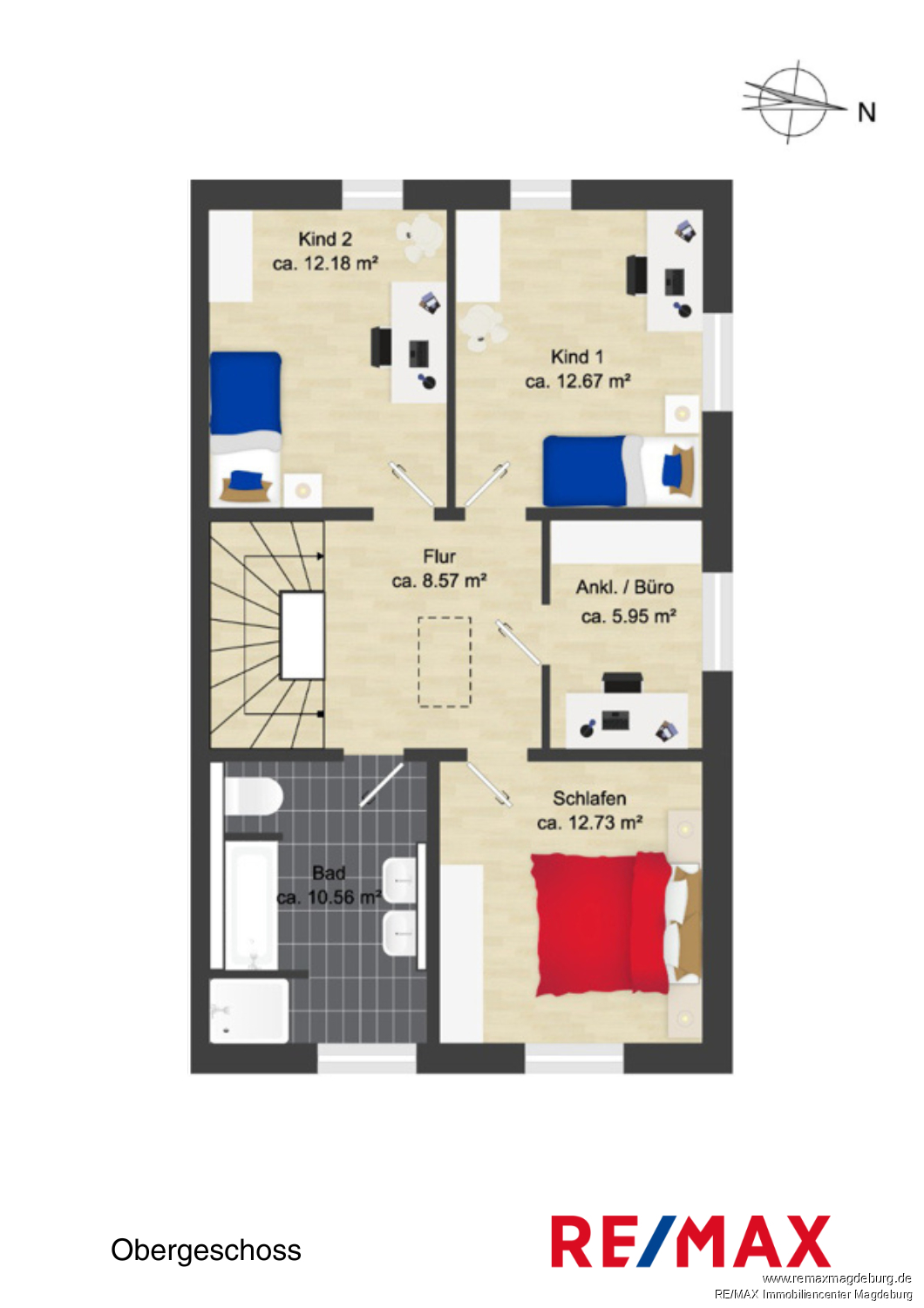 Obergeschoss: - Flur, - Schlafen, - Kind 1, - Kind 2, - Masterbad mit Dusche und Wanne, - Ankleide/Büro,