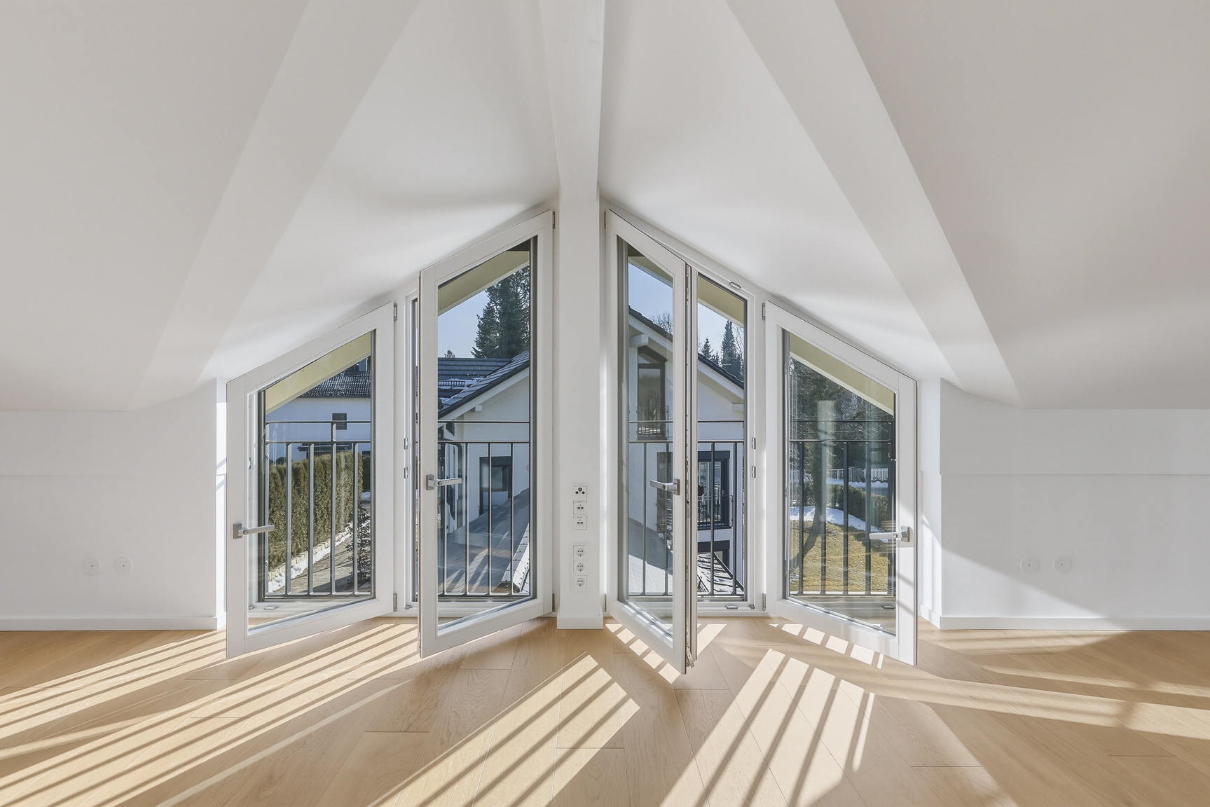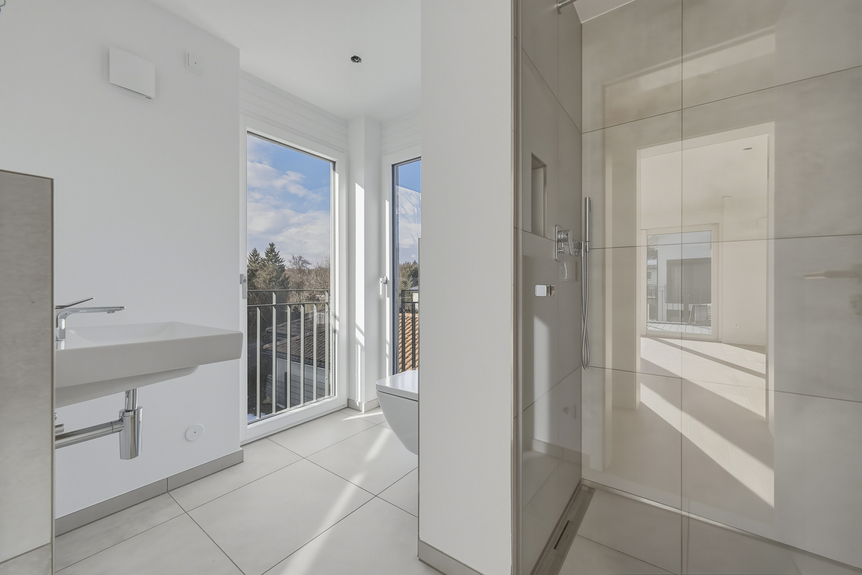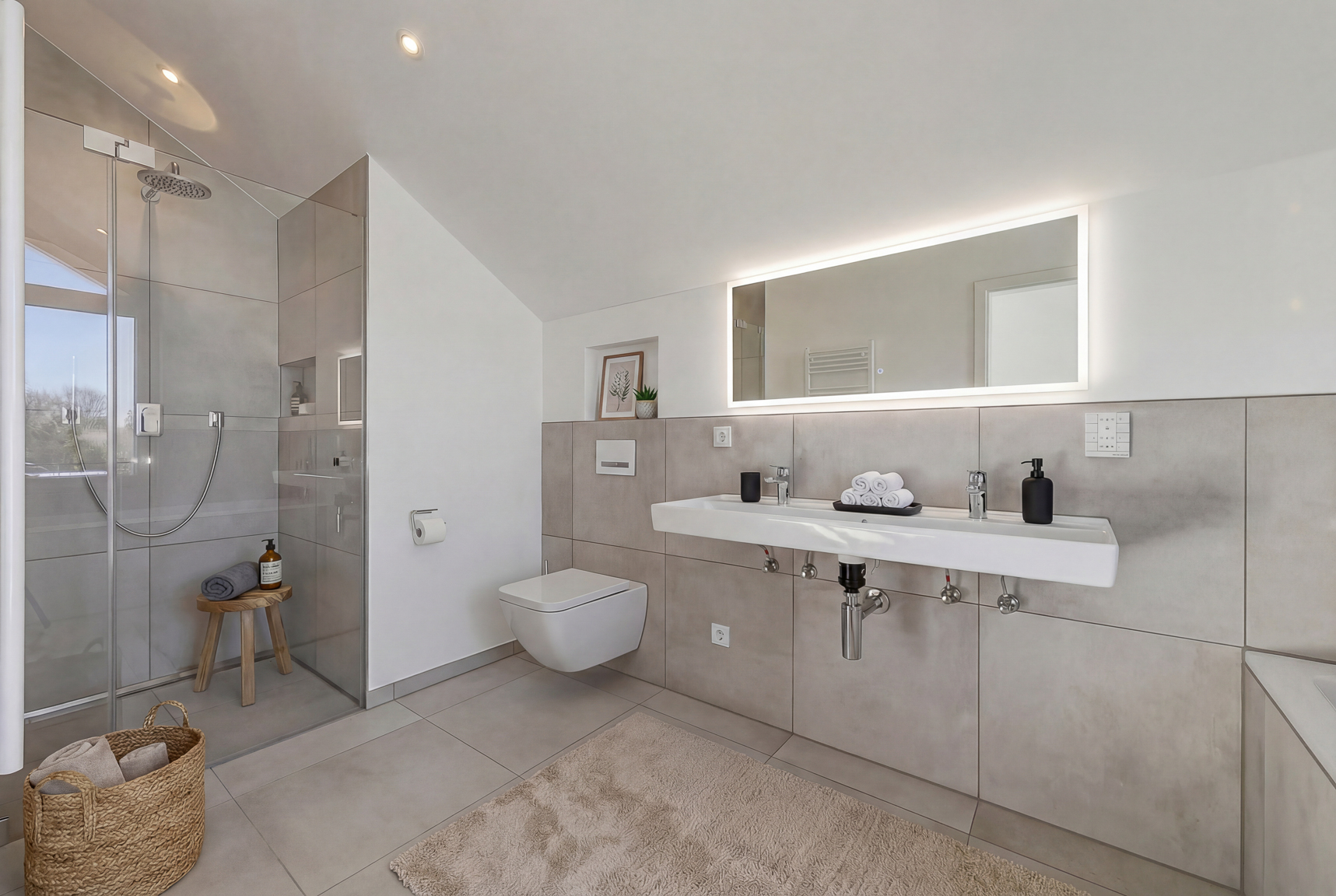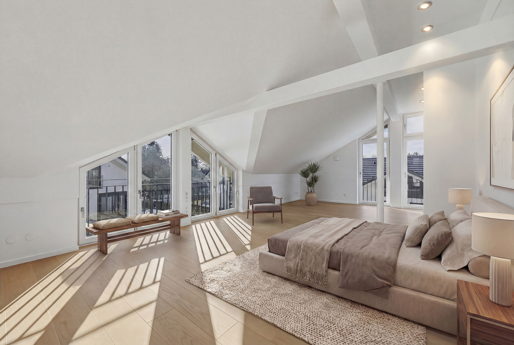 Im Dachgeschoss präsentiert sich das eindrucksvolle Master Bedroom mit en-Suite Bad; Armaturen von Dornbracht und Sanitärinstallationen von Villeroy & Boch zeichnen die hochwertige Ausstattung aus. Zwei weitere Bäder im Ober- bzw. Untergeschoss setzen zusätzliche Komfortakzente. Das Untergeschoss verfügt über ein weiteres Schlafzimmer mit daneben liegendem Badezimmer sowie einen Fitnessraum – ein perfekter Rückzugsort für Gäste mit exklusiver Privatsphäre. Die durchgängige Fußbodenheizung in allen Etagen ermöglicht eine wohlige und angenehme Wärme, während die modernen Holz-Alu Fenstersysteme für eine hervorragende Energieeffizienz sorgen.