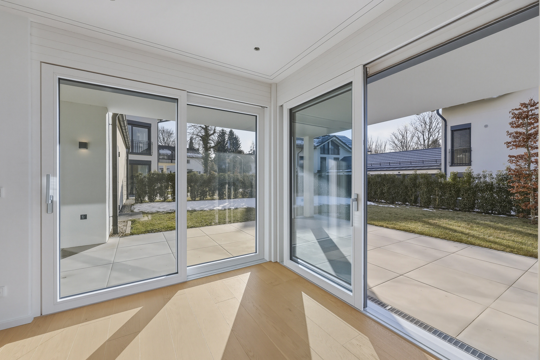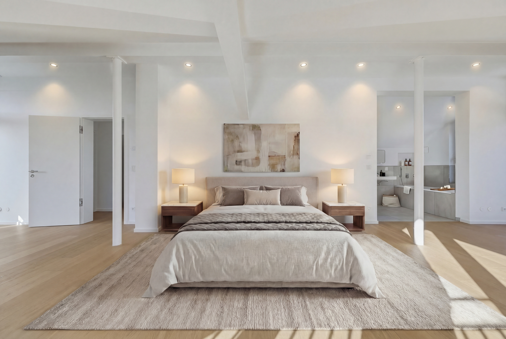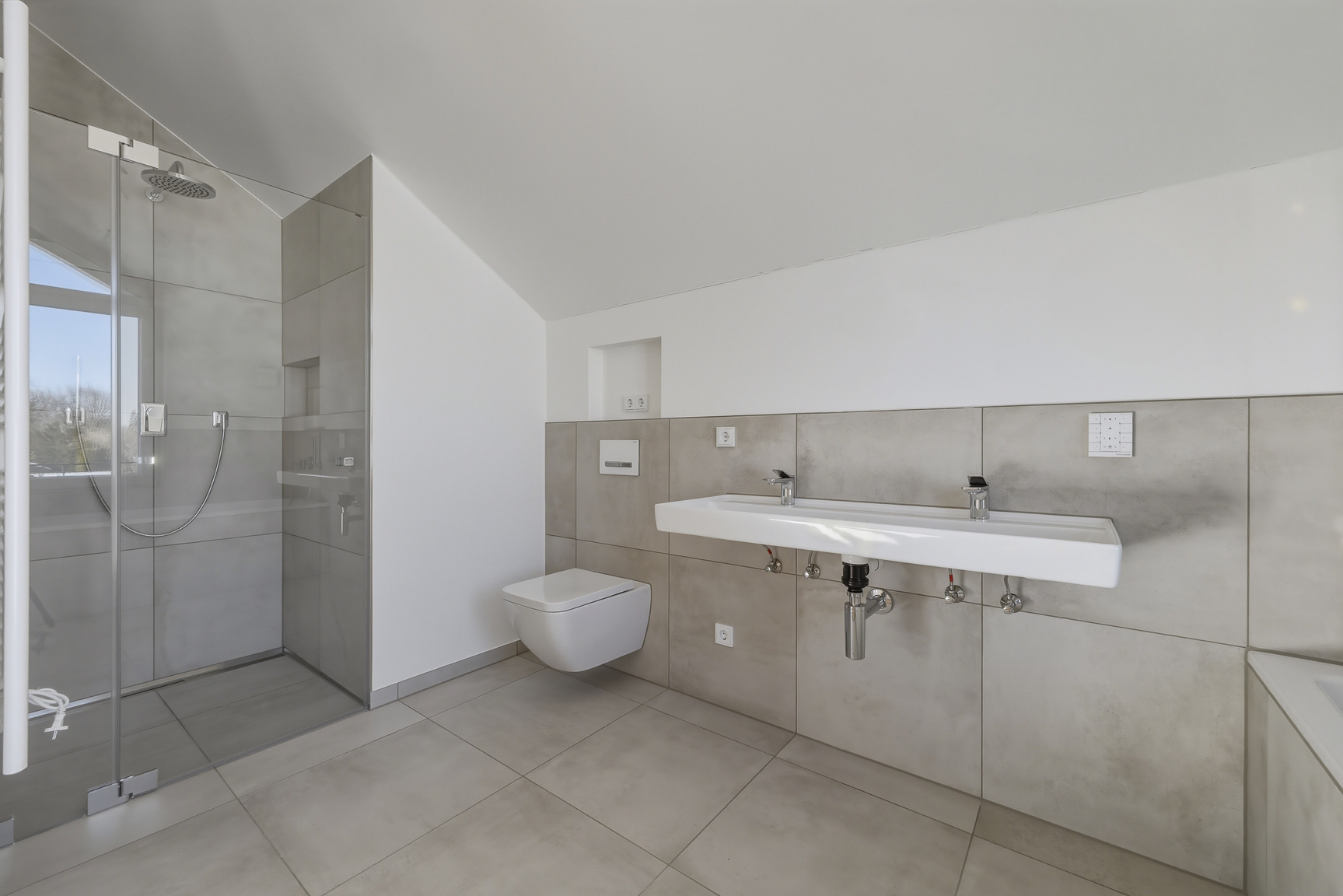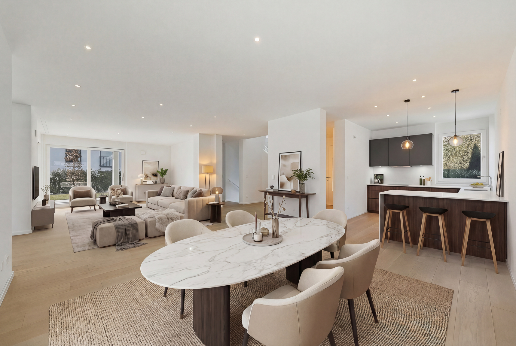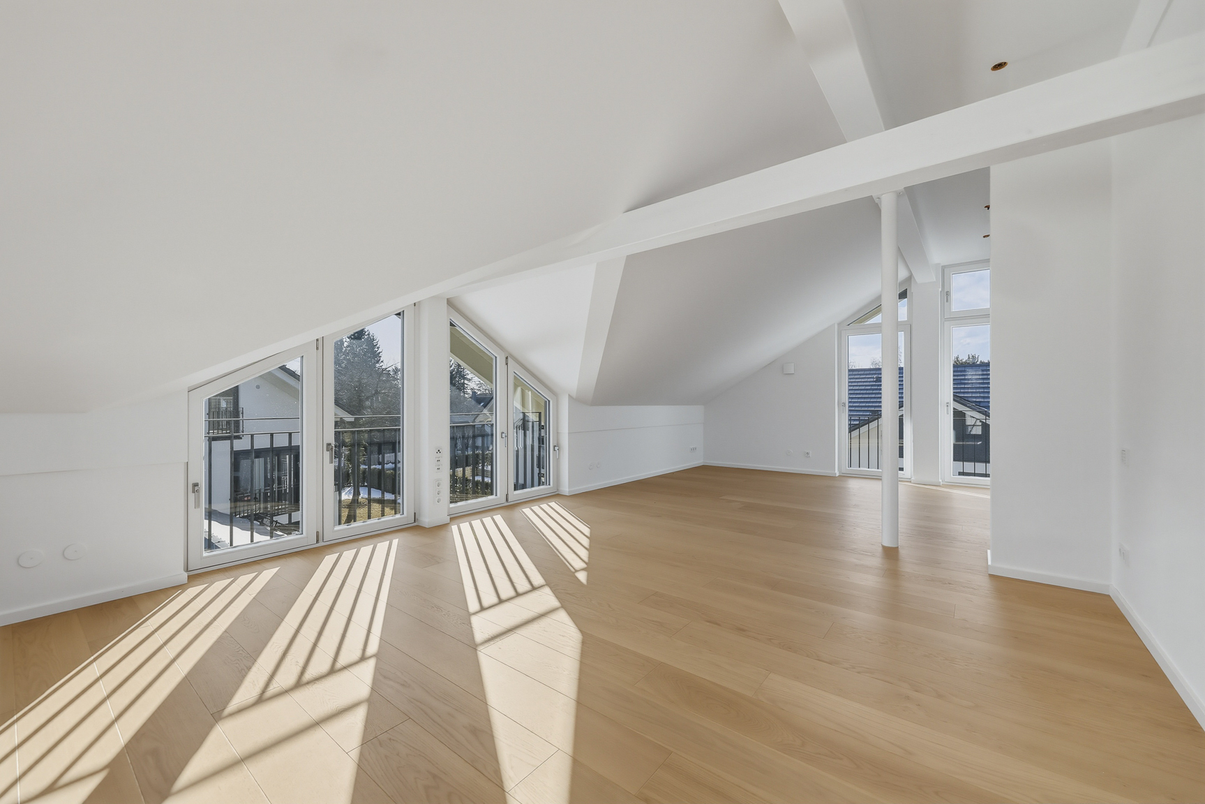 Im Dachgeschoss präsentiert sich das eindrucksvolle Master Bedroom mit en-Suite Bad; Armaturen von Dornbracht und Sanitärinstallationen von Villeroy & Boch zeichnen die hochwertige Ausstattung aus. Zwei weitere Bäder im Ober- bzw. Untergeschoss setzen zusätzliche Komfortakzente. Das Untergeschoss verfügt über ein weiteres Schlafzimmer mit daneben liegendem Badezimmer sowie einen Fitnessraum – ein perfekter Rückzugsort für Gäste mit exklusiver Privatsphäre. Die durchgängige Fußbodenheizung in allen Etagen ermöglicht eine wohlige und angenehme Wärme, während die modernen Holz-Alu Fenstersysteme für eine hervorragende Energieeffizienz sorgen.