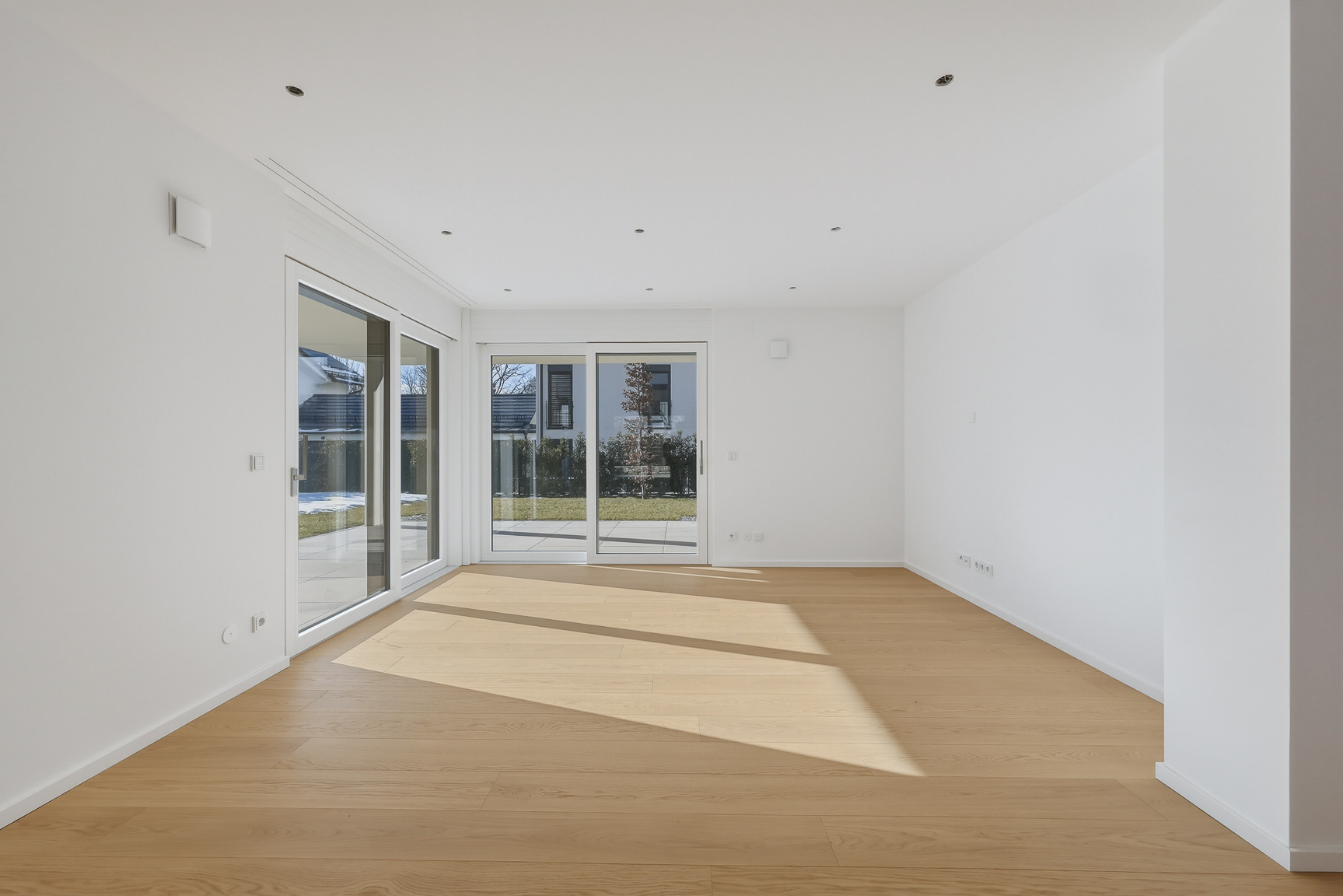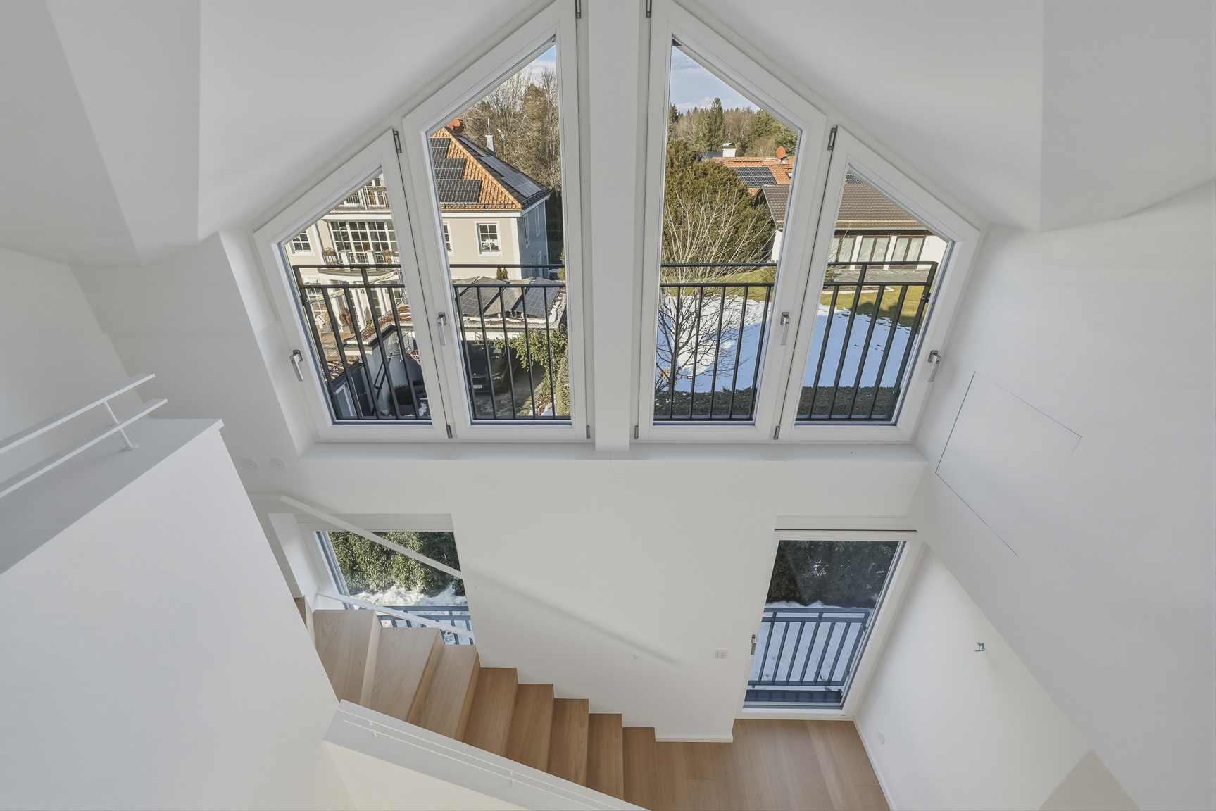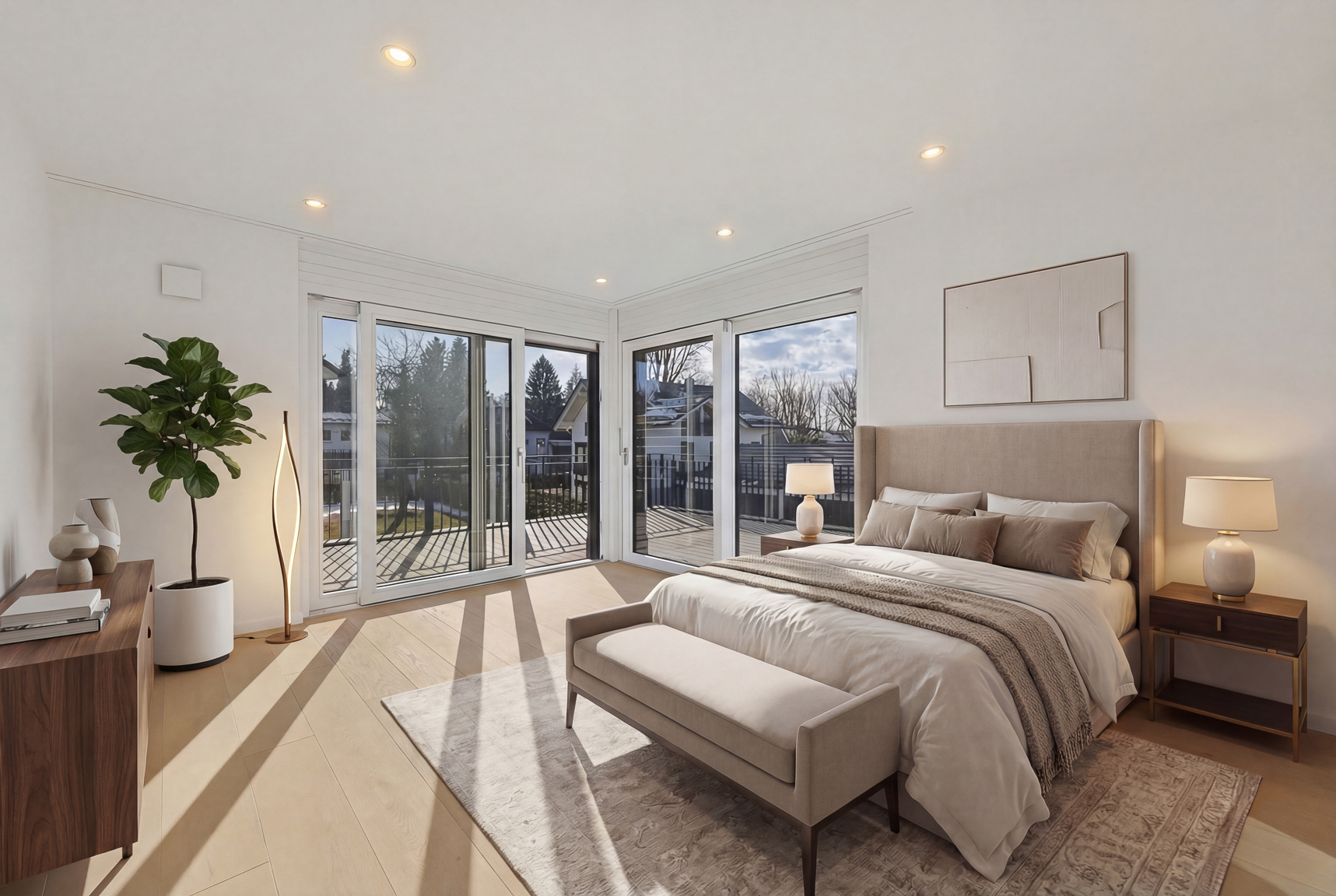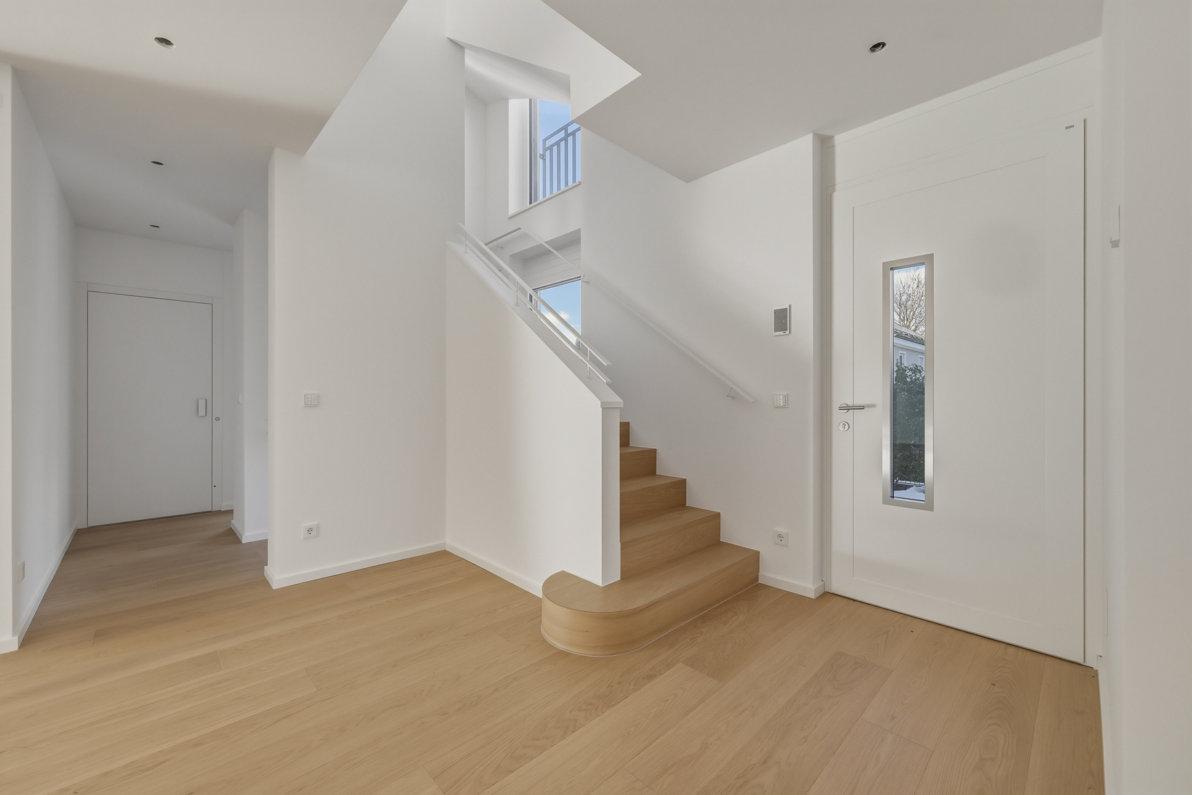 Im Dachgeschoss präsentiert sich das eindrucksvolle Master Bedroom mit en-Suite Bad; Armaturen von Dornbracht und Sanitärinstallationen von Villeroy & Boch zeichnen die hochwertige Ausstattung aus. Zwei weitere Bäder im Ober- bzw. Untergeschoss setzen zusätzliche Komfortakzente. Das Untergeschoss verfügt über ein weiteres Schlafzimmer mit daneben liegendem Badezimmer sowie einen Fitnessraum – ein perfekter Rückzugsort für Gäste mit exklusiver Privatsphäre. Die durchgängige Fußbodenheizung in allen Etagen ermöglicht eine wohlige und angenehme Wärme, während die modernen Holz-Alu Fenstersysteme für eine hervorragende Energieeffizienz sorgen.