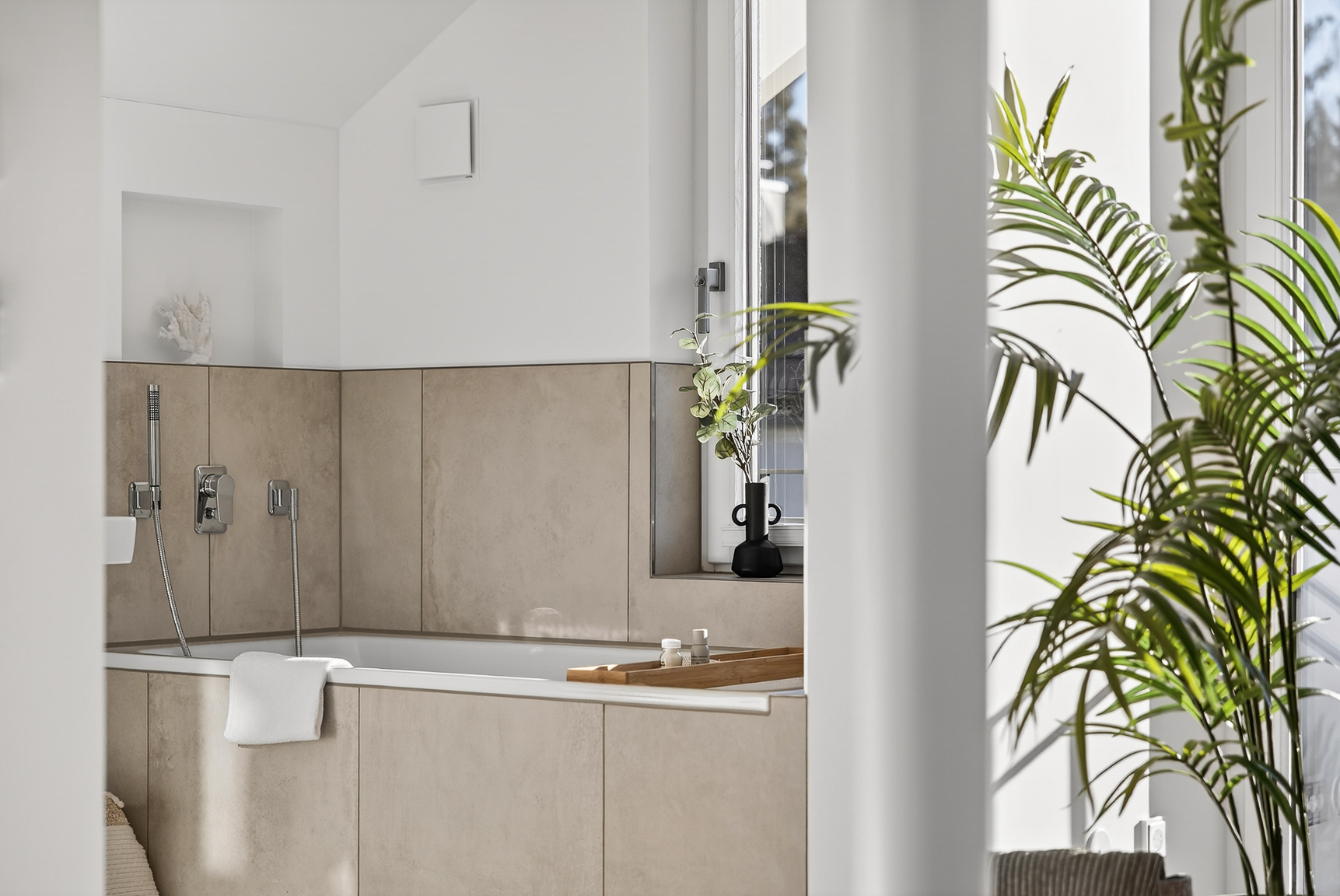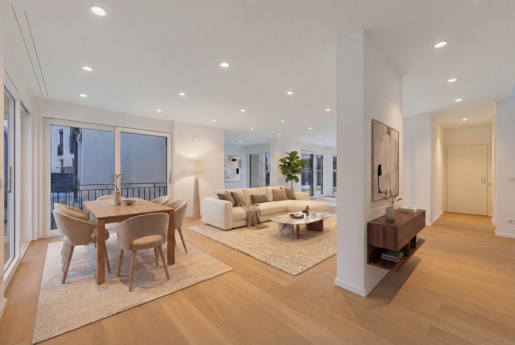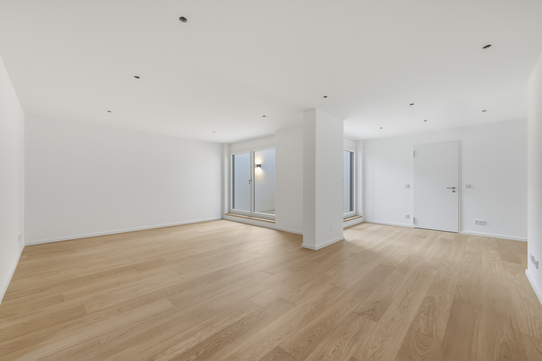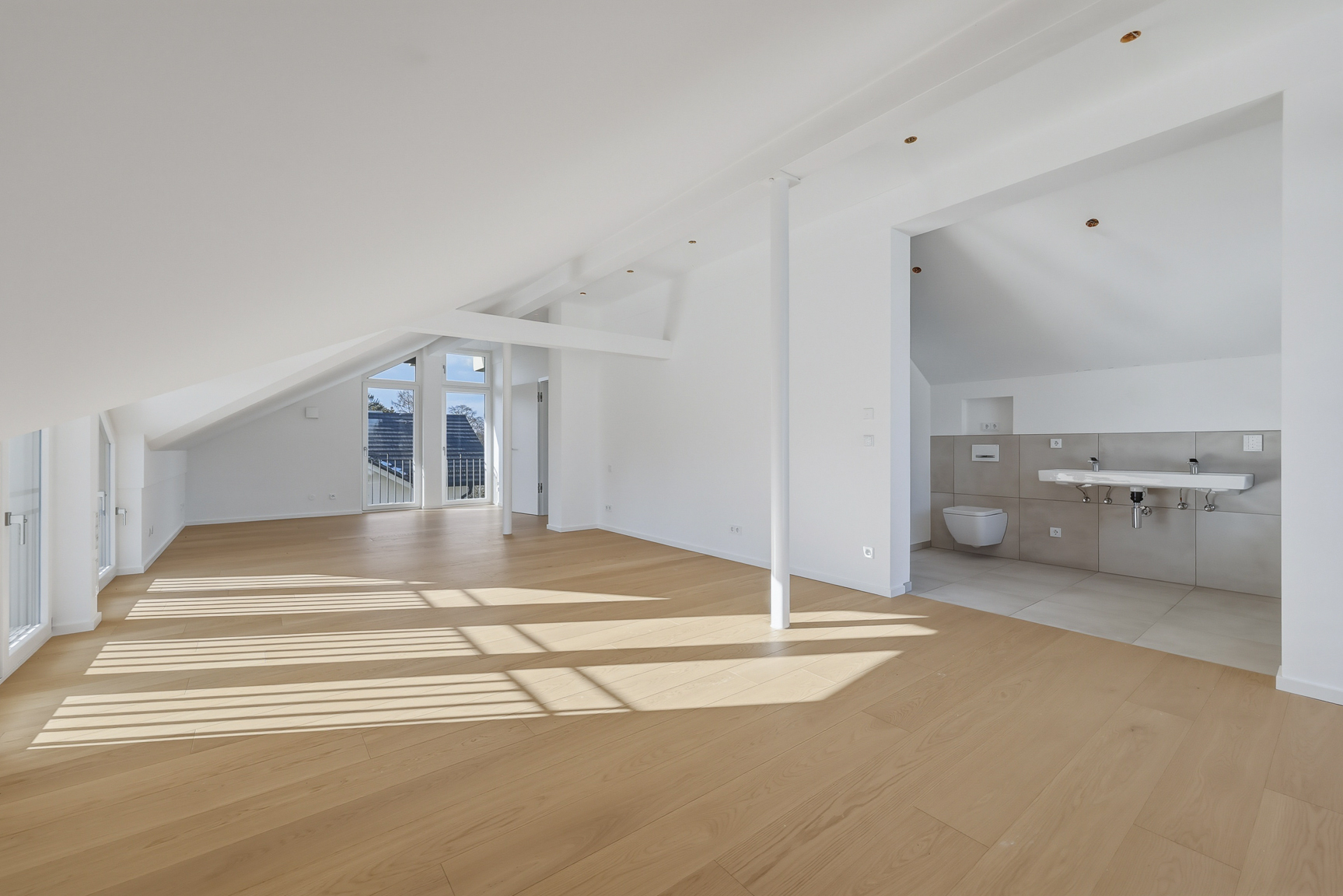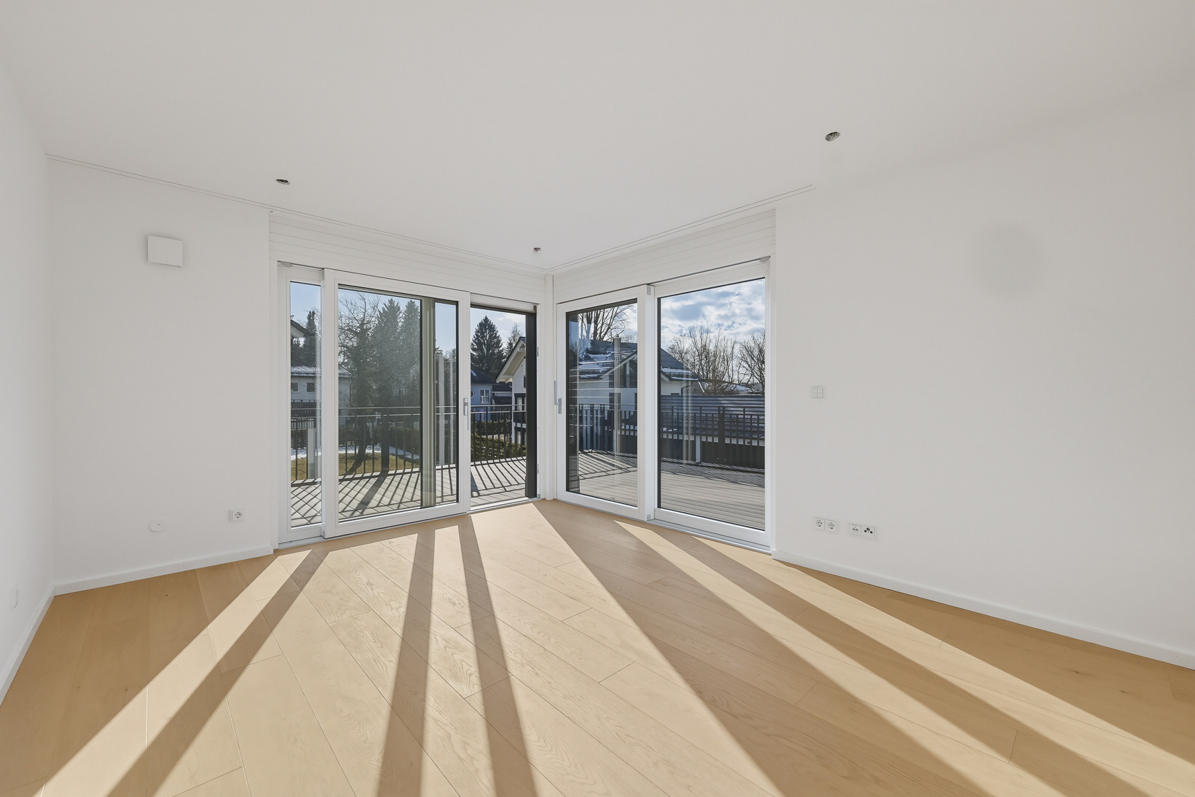 Im Dachgeschoss präsentiert sich das eindrucksvolle Master Bedroom mit en-Suite Bad; Armaturen von Dornbracht und Sanitärinstallationen von Villeroy & Boch zeichnen die hochwertige Ausstattung aus. Zwei weitere Bäder im Ober- bzw. Untergeschoss setzen zusätzliche Komfortakzente. Das Untergeschoss verfügt über ein weiteres Schlafzimmer mit daneben liegendem Badezimmer sowie einen Fitnessraum – ein perfekter Rückzugsort für Gäste mit exklusiver Privatsphäre. Die durchgängige Fußbodenheizung in allen Etagen ermöglicht eine wohlige und angenehme Wärme, während die modernen Holz-Alu Fenstersysteme für eine hervorragende Energieeffizienz sorgen.