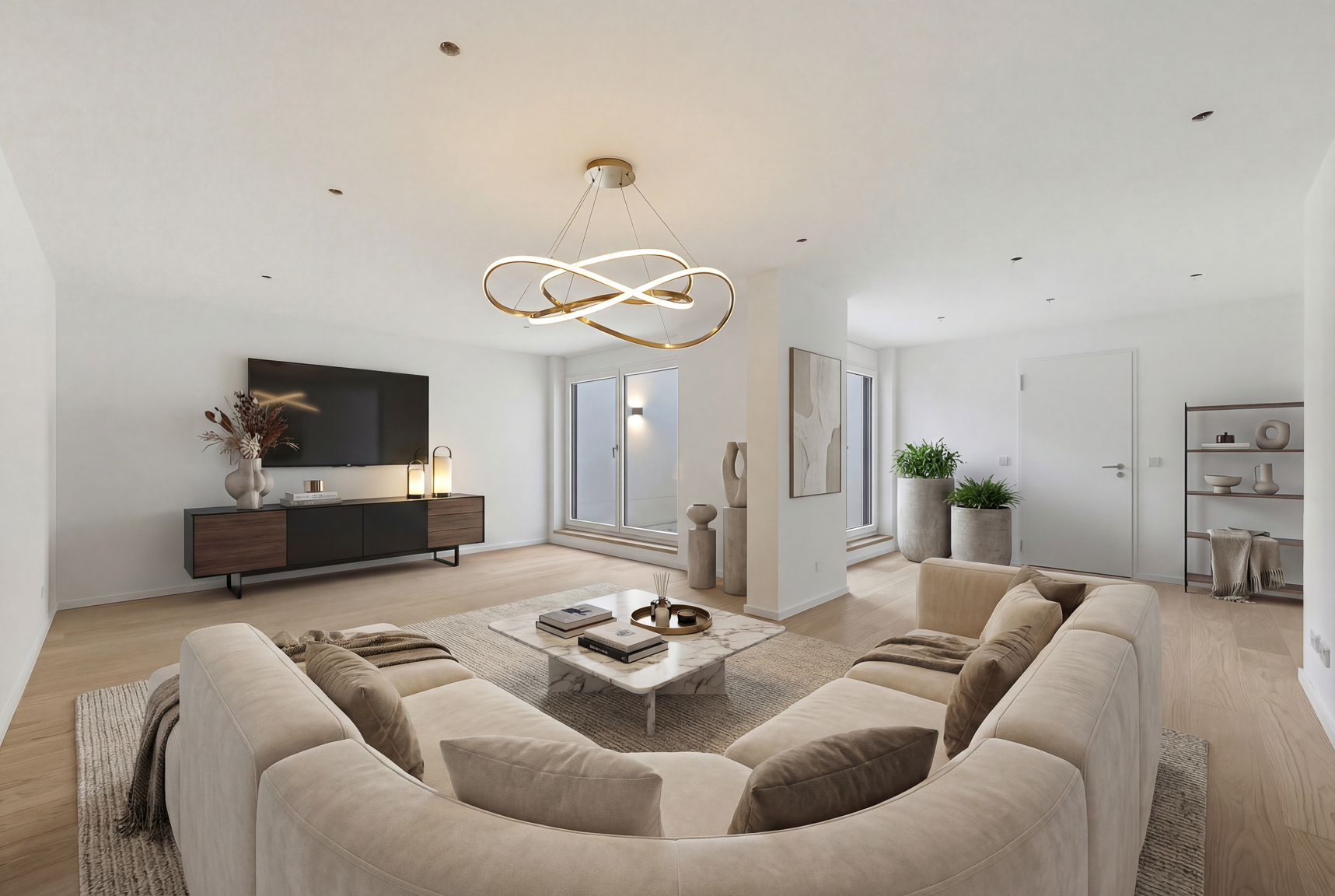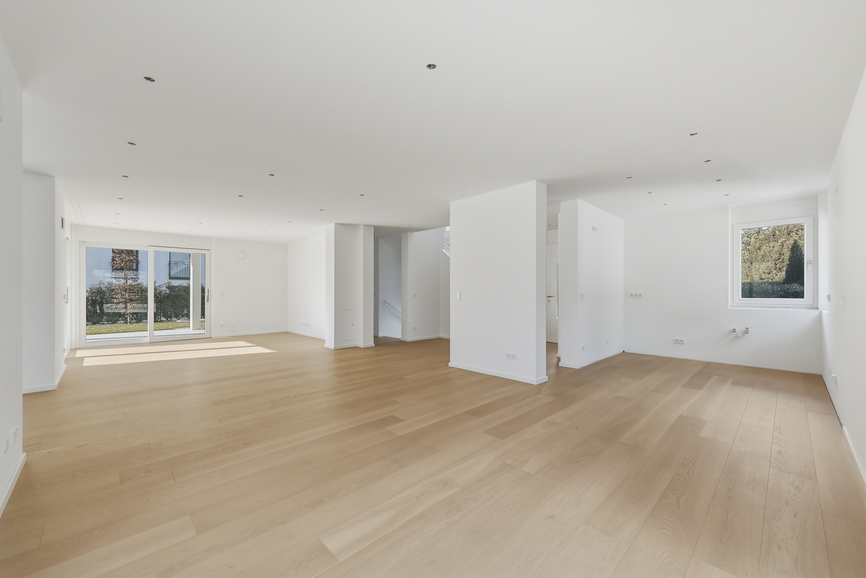 Die Villa empfängt Sie mit einem großzügigen Eingangsbereich samt eindrucksvollem Treppenaufgang. Vom einladenden Eingangsfoyer gelangen Sie in den offenen Wohn-, Ess-, und Küchenbereich, der durch seine lichtdurchflutete Gestaltung und den hochwertigen Parkettboden eine unvergleichliche Atmosphäre schafft. Bodentiefe Fenster sorgen für eine angenehme und durchgängige Belichtung. Ein Kaminanschluss im Wohnzimmer ist bereits vorhanden und ermöglicht somit künftig gemütliche Abende im neuen Zuhause. Die gesamte Wohn- und Nutzfläche von ca. 377 m² verteilt sich auf insgesamt neun Zimmer, die durch ihre durchdachte Raumaufteilung und hochwertige Ausstattung bestechen.