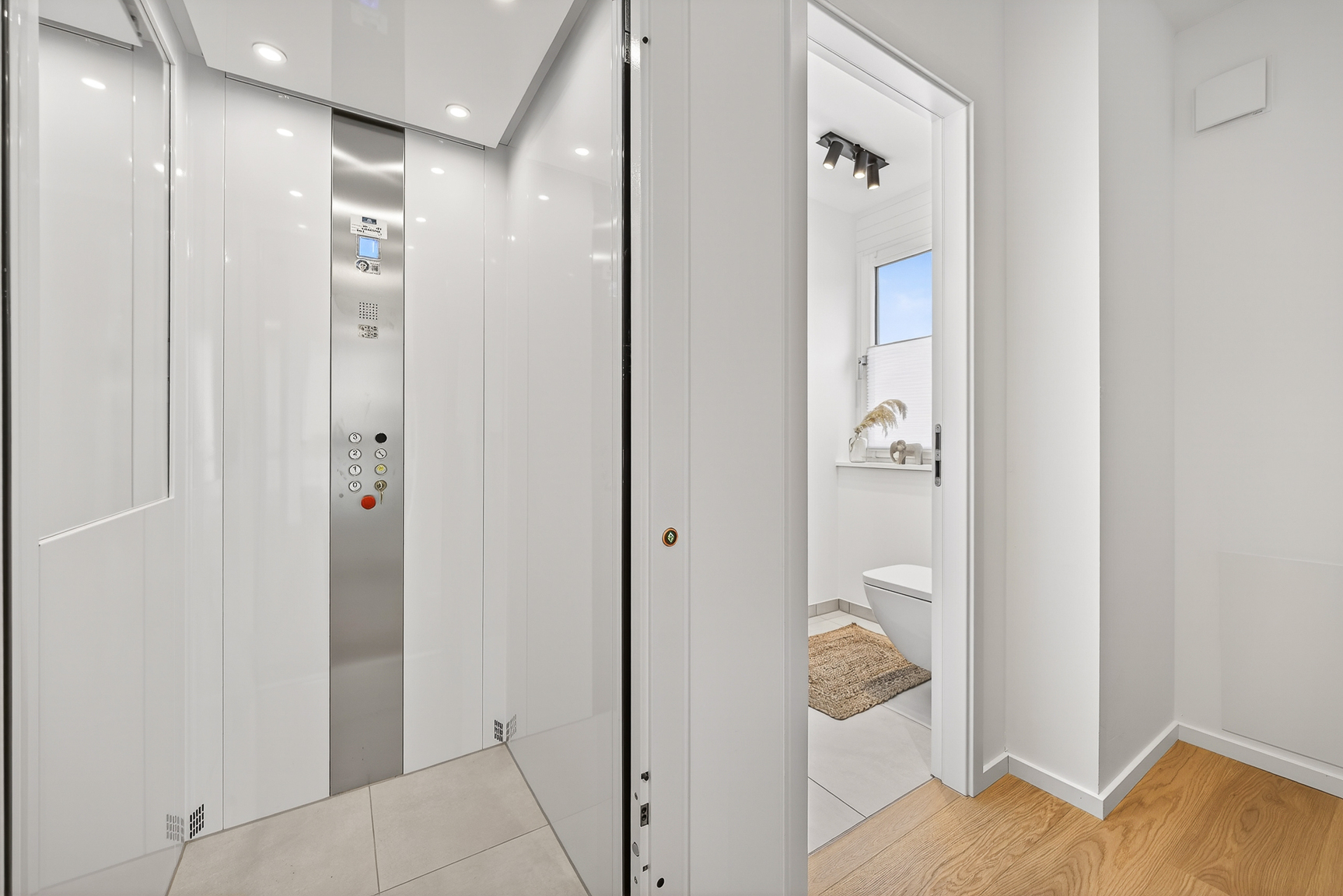 Ein weiteres, besonderes Highlight ist der hauseigene Fahrstuhl, der alle Etagen von Untergeschoss bis Dachgeschoss bequem miteinander verbindet und den Wohnkomfort auf eine ganz neue Ebene hebt. Der Außenbereich bietet eine großzügige Südwestterrasse im weitläufigen Garten sowie einen Balkon im Obergeschoss für sommerliche Stunden im Freien.