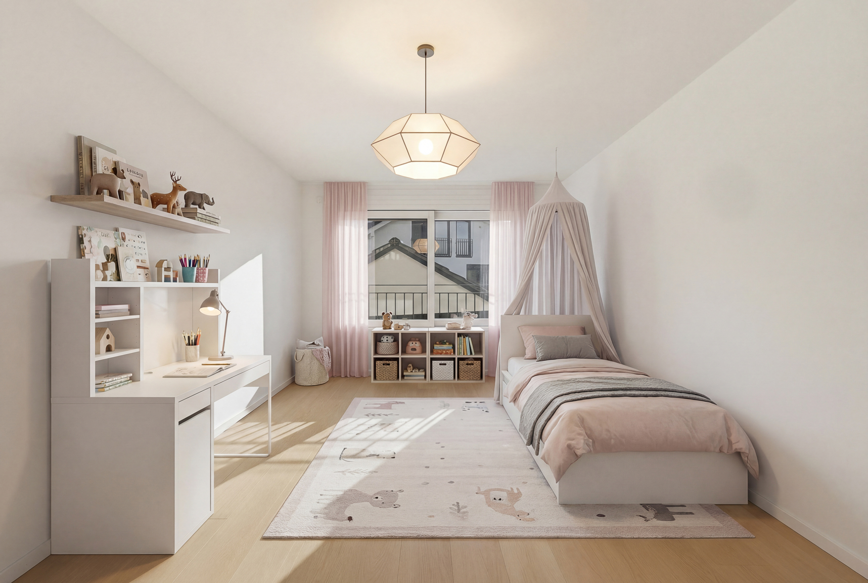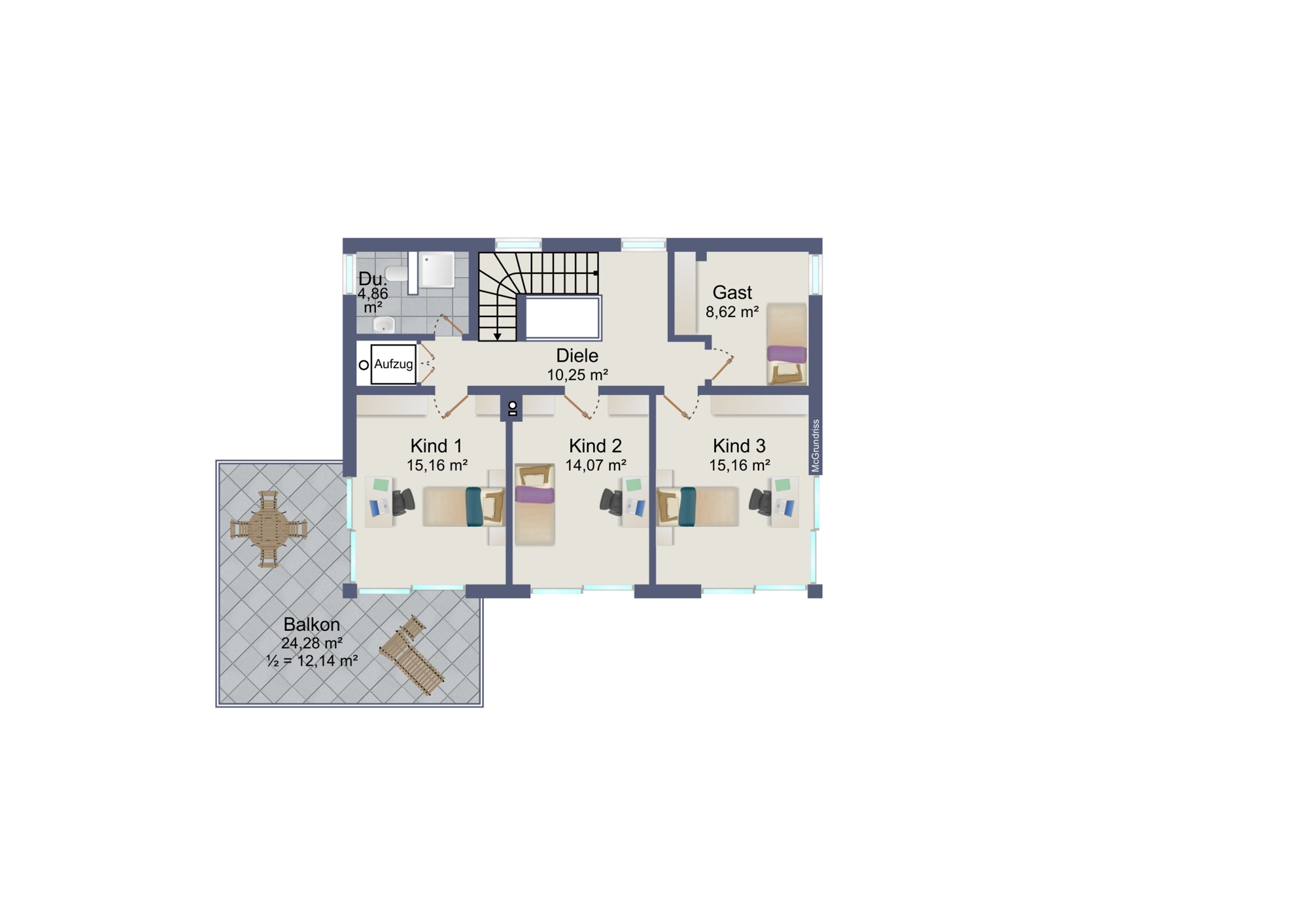 Im Obergeschoss befinden sich vier Kinder-/Gästezimmer, die durch den idealen Schnitt und die überwiegend bodentiefen Fenster ein angenehmes Wohnambiente schaffen.